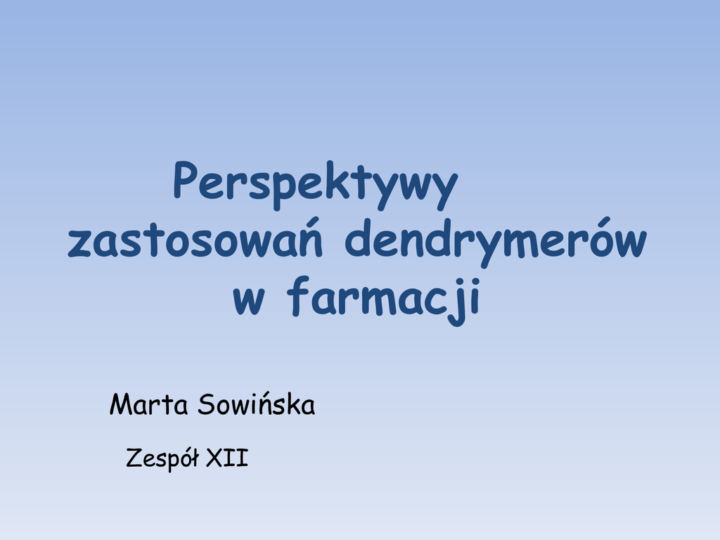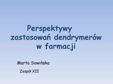 Perspektywy zastosowań dendrymerów w farmacji Marta Sowińska Zespół XII Dendrymery - budowa trzy elementy strukturalne: rdzeń, jednostki rozgałęziające, reaktywne powierzchniowe grupy funkcyjne; obecność wolnych przestrzeni wewnątrz makrocząsteczki; zmiana kształtu wraz ze wzrostem generacji i ze zmianą warunków; monodyspersyjność; duże możliwości regulowania biokompatybilności i toksyczności; dense-shell dense-core efekt ,,backfolding” Zastosowania dendrymerów w farmacji Dendrymery jako nośniki: substancji leczniczych; kontrastów w MRI; materiału genetycznego; fotouczulaczy w PDT; przeciwciał z radioaktywnymi znacznikami (np.10B - BNCT) substancji „różnych”; Dendrymery jako leki: antybakteryjne, antygrzybiczne, antywirusowe; chorób neurodegeneracyjnych; Systemy dostarczania leków (DDS – drug delivery systems) pojęcie obejmujące różne typy konjugatów nośnik-lek; dwa główne podejścia do dostarczania leków: aktywne i bierne; transport aktywny – cząsteczki tropowe; transport pasywny – efekt EPR; Ogólny model konjugatu nośnik-lek Nevozhay et al; Postepy Hig. Med.Dosw. 2007,61,350 Dendrymery jako nośniki leków 1. Enkapsulacja leku (kompleksy gość-gospodarz) cząsteczki gościa: leki antynowotworowe (ADR, MTX, 5-FU, cis-platyna) leki antybakteryjne, antygrzybiczne (m.in. tiokonazol, sole srebra); leki przeciwzapalne (ibuprofen, indometacyna); leki używane do diagnostyki w okulistyce (fluoresceina, tropikamid, pilokarpina) ADR MTX Jain, et al. Int. J. Pharm. 2003,257,111 Twyman, et al. Tetrahedron, 2003,59,3873 Dendrymery jako nośniki leków 2. Przyłączenie leku do powierzchni dendrymeru efekt dendrytyczny; Frechet, et al. Bioconjugate Chem. 1999, 10, 1115 McGrath et al. Mol. Pharm. 2005,2,253 Dendrymery jako czynniki kontrastowe MRI DTPA = diethylenetriamine pentaacetic acid Wiener, et al. Magn. Reson. Med. 1994,31,1 Dendrymery jako czynniki kontrastowe MRI DO3A = 1,4,7,10-tetraazacyclododecane-1,4,7-triacetic acid Gadomer 17 Fink, et al. J. Magn. Res. Imaging, 2003,18,59 Avidimer TM Metotreksat (czynnik cytotoksyczny) Fluoresceina (czynnik obrazujący) Kwas foliowy (ang. targeting agent) G5-PAMAM (dendrymer ) Kukowska-Latallo, et al. Cancer Res. 2005, 65, 5317 Dendrymery w terapii fotodynamicznej (PDT) Battah, et al. Bioconjugate Chem. 2001,12,980 Nishiyama, et al. Bioconjugate Chem. 2003,14,58 Dendrymery w terapii wychwytu neutronów boru (BNCT) B(n, α)7Li3+ 10 > 109 B atomów; długość drogi < 10 μm; 10 wystarczająca akumulacja atomów 10B; precyzyjne ulokowanie terapeutyku w nowotworze Backer, et al. Anticancer Agents Med. Chem. 2006,6,167 Barth, et al. Bioconjugate Chem. 1994,5,58 Carlsson, et al. Bioconjugate Chem. 1996,7,7 Dendrymery jako leki 1. Dendrymery jako leki antywirusowe Boas, et al. Chem. Soc. Rev. 2004,33,43 Zanini, et al. J. Org. Chem. 1998,63,3486 VivaGel McCarthy, et al. Mol. Pharm. 2005,2,312 TM 2. Dendrymery jako leki antybakteryjne Cooper, et al. Biomaterials, 2002,23,3359 gdzie: R1 - aminokwasy białkowe: Phe, Tyr, Gly, Ala, Ile K - D- lub L-Lys, D- lub L-Orn, R2, R3 - L-Arg, H lub Z lub 2-Cl-Z Zgłoszenie patentowe P 361821 z 27.08.03 Z. Lipkowska, J. Janiszewska Dendrymery dostępne na rynku Encyclopedia of Biomaterials and Biomedical Engineering; Published on: 27 March 2006