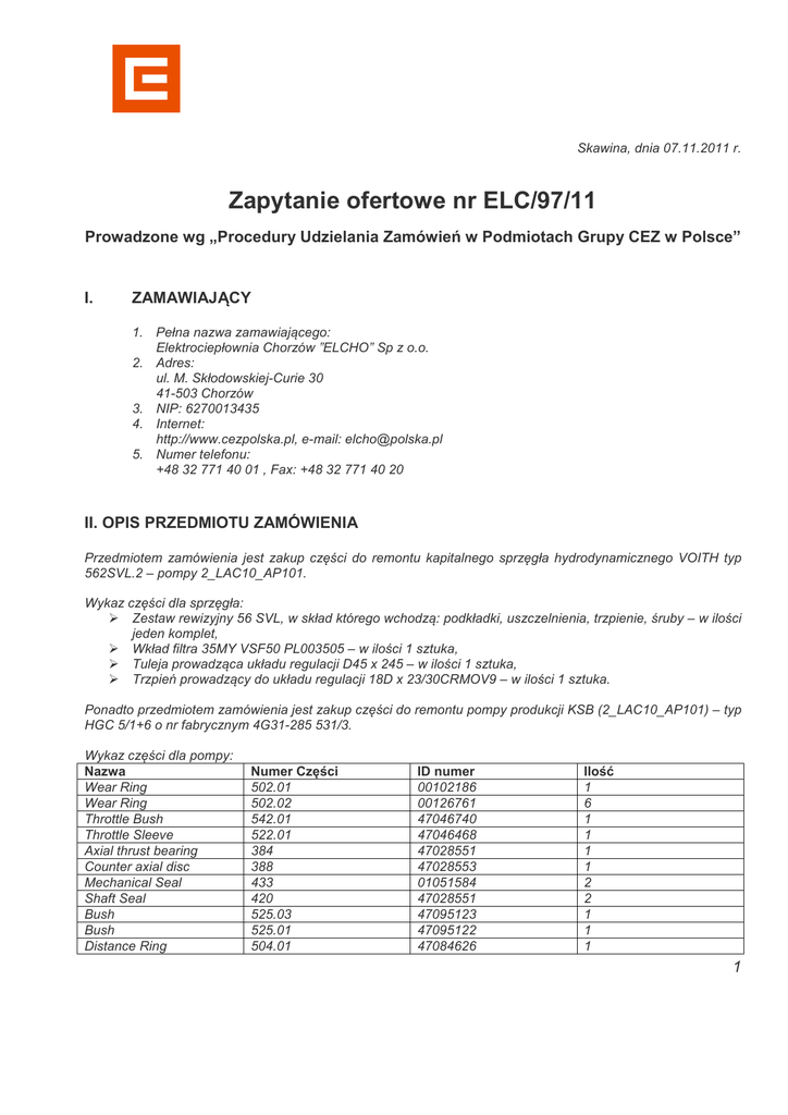 Skawina, dnia 07.11.2011 r. Zapytanie ofertowe nr ELC/97/11 Prowadzone wg „Procedury Udzielania Zamówień w Podmiotach Grupy CEZ w Polsce” I. ZAMAWIAJĄCY 1. Pełna nazwa zamawiającego: Elektrociepłownia Chorzów ”ELCHO” Sp z o.o. 2. Adres: ul. M. Skłodowskiej-Curie 30 41-503 Chorzów 3. NIP: 6270013435 4. Internet: http://www.cezpolska.pl, e-mail: [email protected] 5. Numer telefonu: +48 32 771 40 01 , Fax: +48 32 771 40 20 II. OPIS PRZEDMIOTU ZAMÓWIENIA Przedmiotem zamówienia jest zakup części do remontu kapitalnego sprzęgła hydrodynamicznego VOITH typ 562SVL.2 – pompy 2_LAC10_AP101. Wykaz części dla sprzęgła: Zestaw rewizyjny 56 SVL, w skład którego wchodzą: podkładki, uszczelnienia, trzpienie, śruby – w ilości jeden komplet, Wkład filtra 35MY VSF50 PL003505 – w ilości 1 sztuka, Tuleja prowadząca układu regulacji D45 x 245 – w ilości 1 sztuka, Trzpień prowadzący do układu regulacji 18D x 23/30CRMOV9 – w ilości 1 sztuka. Ponadto przedmiotem zamówienia jest zakup części do remontu pompy produkcji KSB (2_LAC10_AP101) – typ HGC 5/1+6 o nr fabrycznym 4G31-285 531/3. Wykaz części dla pompy: Nazwa Wear Ring Wear Ring Throttle Bush Throttle Sleeve Axial thrust bearing Counter axial disc Mechanical Seal Shaft Seal Bush Bush Distance Ring Numer Części 502.01 502.02 542.01 522.01 384 388 433 420 525.03 525.01 504.01 ID numer 00102186 00126761 47046740 47046468 47028551 47028553 01051584 47028551 47095123 47095122 47084626 Ilość 1 6 1 1 1 1 2 2 1 1 1 1 Distance Ring Distance Ring Gland bearing Balancing Disc Counter bal. Disc Split ring O-Ring O-Ring O-Ring O-Ring O-Ring O-Ring O-Ring O-Ring O-Ring O-Ring O-Ring O-Ring O-Ring O-Ring O-Ring O-Ring O-Ring O-Ring 504.02 504.03 370 601.01 602.01 501.03 412.10 412.08 412.12 412.19 412.02 412.16 412.04 412.05 412.06 412.07 412.14 412.09 412.15 412.01 412.02 412.11 412.17 412.03 47046479 47098472 47084741 47046467 47046469 47084955 00370168 00370945 00371605 00372274 003722870 00372224 00372224 00372072 01041386 00370038 01065919 00370138 00373415 00371956 00372870 00370168 00370848 01038169 1 1 2 1 1 2 1 2 1 1 1 1 1 1 1 1 1 2 3 1 1 1 1 2 III. TERMIN WYKONANIA ZAMÓWIENIA Preferowany jest jak najkrótszy termin dostawy liczony w dniach od momentu otrzymania zamówienia lub podpisania umowy. IV. INFORMACJE JAKIE OFERENT JEST ZOBOWIĄZANY UWZGLĘDNIĆ W OFERCIE: 1. Cenę netto w pln na warunkach DDP Chorzów i warunki płatności. Proszę wycenić każdą pozycję osobno. Dopuszczamy składanie ofert częściowych. Ofertę należy składać poprzez wypełnienie Załącznika nr 3 do niniejszego zapytania – „Szablon oferty”. 2. Termin ważności oferty. 3. Dane kontaktowe osoby upoważnionej ze strony Oferenta do kontaktu z Zamawiającym. 4. Listę referencyjną klientów ze szczególnym uwzględnieniem podobnych dostaw. 5. Warunki i czas trwania gwarancji (minimalny okres gwarancji to 24 miesiące). 6. Aktualny odpis z właściwego rejestru albo aktualne zaświadczenie o wpisie do ewidencji działalności gospodarczej, wystawiony nie wcześniej niż 6 miesięcy przed upływem terminu składania ofert. 7. Oświadczenie oferenta, że nie podlega wykluczeniu stanowiące załącznik nr 2 niniejszego zapytania. 2 V. SZCZEGÓLNE WYMAGANIA W STOSUNKU DO WYKONAWSTWA: 1. Oferent akceptuje akceptujące postanowienia Ogólnych Warunków Realizacji Zamówień stanowiące załącznik nr 1 do niniejszego zapytania. 2. Akceptacja terminu płatności wynoszącego 30 dni liczonych od daty otrzymania faktury przez Zamawiającego. VI. MIEJSCE ORAZ TERMIN SKŁADANIA OFERT 1. Oferta powinna być przesłana za pośrednictwem: poczty elektronicznej na adres wskazany [email protected], do dnia 21 listopada 2011 roku. VII. SPOSÓB UDZIELANIA WYJAŚNIEŃ DOTYCZĄCYCH ZAPYTANIA OFERTOWEGO: 1. Każdy oferent ma prawo zwrócić się do zamawiającego o wyjaśnienie treści warunków zapytania ofertowego w terminie nie późniejszym niż 3 dni przed terminem składania ofert. 2. Korespondencja w toku procesu wyboru dostawcy, w tym pytania oferentów mogą mieć formę emailową. VIII. PRACOWNICY ZAMAWIAJĄCEGO UPRAWNIENI DO BEZPOSREDNIEGO KONTAKTOWANIA SIĘ Z OFERENTAMI: Sprawy merytoryczne: Imię i nazwisko: Marek Podleśny Stanowisko służbowe: Główny Specjalista ds. Mechanicznych Numer telefonu: +48 32 7704248 E-mail: [email protected] Sprawy handlowe: Imię i nazwisko: Marcin Rejdych Stanowisko służbowe: Specjalista ds. Zakupów Numer telefonu: +48 12 2778290 E-mail: [email protected] 3 Osoba na stanowisku Specjalista ds. Zakupów posiada umocowanie do samodzielnej reprezentacji ZAMAWIAJĄCEGO i składania oświadczeń woli wymaganych trybem procedury zakupowej. IX. ŚRODKI ODWOŁAWCZE: 1. Oferentom nie przysługuje prawo uczestnictwa w otwarciu ofert. 2. W postępowaniu oferentom nie przysługują żadne środki odwoławcze. X. POSTAWNOWIENIA KOŃCOWE: 1. O wyborze najkorzystniejszej oferty Zamawiający zawiadomi oferentów za pośrednictwem poczty elektronicznej (e-mail). 2. Drugi etap postępowania może zostać przeprowadzony za pomocą aukcji elektronicznej. Regulamin przeprowadzania aukcji oraz instrukcja obsługi znajduje się na stronie internetowej pod adresem: http://www.cezpolska.pl/pl/dla-dostavcow/pozostale-postepowania/aukcjeelektroniczne.html 3. Zamawiający zastrzega sobie prawo do odstąpienia bez podania przyczyny od wyboru oferty (ofert) i powierzenia komukolwiek wykonania prac objętych niniejszym zapytaniem bez prawa oferentów do dochodzenia od Zamawiającego roszczeń z odszkodowawczych. 4. Zamawiający zastrzega sobie prawo do negocjowania warunków z kilkoma dostawcami jednocześnie. 5. Oferent może przed upływem terminu składania ofert zmienić lub wycofać swoją ofertę. 6. W toku badania i oceny ofert Zamawiający może żądać od oferentów wyjaśnień dotyczących treści złożonych ofert. 7. Koszty przygotowania oferty ponosi Oferent. 8. Zamawiający dopuszcza składanie ofert 