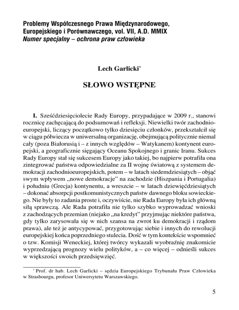 Problemy Współczesnego Prawa Międzynarodowego, Europejskiego i Porównawczego, vol. VII, A.D. MMIX Numer specjalny – ochrona praw człowieka Lech Garlicki* SŁOWO WSTĘPNE I. Sześćdziesięciolecie Rady Europy, przypadające w 2009 r., stanowi rocznicę zachęcającą do podsumowań i refleksji. Niewielki twór zachodnioeuropejski, liczący początkowo tylko dziesięciu członków, przekształcił się w ciągu półwiecza w uniwersalną organizację, obejmującą politycznie niemal cały (poza Białorusią i – z innych względów – Watykanem) kontynent europejski, a geograficznie sięgający Oceanu Spokojnego i granic Iranu. Sukces Rady Europy stał się sukcesem Europy jako takiej, bo najpierw potrafiła ona zintegrować państwa odpowiedzialne za II wojnę światową z systemem demokracji zachodnioeuropejskich, potem – w latach siedemdziesiątych – objąć swym wpływem „nowe demokracje” na zachodzie (Hiszpania i Portugalia) i południu (Grecja) kontynentu, a wreszcie – w latach dziewięćdziesiątych – dokonać absorpcji postkomunistycznych państw dawnego bloku sowieckiego. Nie były to zadania proste i, oczywiście, nie Rada Europy była ich główną siłą sprawczą. Ale Rada potrafiła nie tylko szybko wyprowadzać wnioski z zachodzących przemian (niejako „na kredyt” przyjmując niektóre państwa, gdy tylko zarysowała się w nich szansa na zwrot ku demokracji i rządom prawa), ale też je antycypować, przygotowując siebie i innych do rewolucji europejskiej końca poprzedniego stulecia. Dość w tym kontekście wspomnieć o tzw. Komisji Weneckiej, której twórcy wykazali wyobraźnię znakomicie wyprzedzającą prognozy wielu polityków, a – co więcej – odnieśli sukces w większości swoich przedsięwzięć. * Prof. dr hab. Lech Garlicki – sędzia Europejskiego Trybunału Praw Człowieka w Strasbourgu, profesor Uniwersytetu Warszawskiego. Nie ma potrzeby ani możliwości dokonywać tu przeglądu kierunków działania i dokonań Rady Europy w minionym sześćdziesięcioleciu. Wystarczy podkreślić wieloaspektowość jej aktywności, obejmującej nie tylko współdziałanie polityczne (realizujące się przede wszystkim poprzez Zgromadzenie Parlamentarne oraz Komitet Ministrów), ale też podejmowanie licznych działań na polu prawa międzynarodowego (w ramach Rady Europy powstało przecież wiele istotnych konwencji regionalnych), szerzenia wzorów demokracji i dobrej administracji, wymiany myśli intelektualnej i politycznej. II. Zaakcentować natomiast należy, co potwierdza też profil niniejszego tomu studiów, szczególną rolę Rady Europy w dziedzinie ochrony i rozwoju praw człowieka. Przypomnijmy, że prace nad tworzeniem systemu Rady Europy przebiegały dwutorowo. Z jednej strony, przygotowywano polityczne powstanie tej organizacji, które to prace – z natury rzeczy – musiały być wbudowane w trudny kontekst powojennej Europy i zaostrzającej się konfrontacji zimnowojennej. Toczyły się więc na tle rokowań dotyczących integracji gospodarczej (ostatecznie przybierającej kształt Wspólnot Europejskich, a – po blisko czterdziestu latach – Unii Europejskiej) oraz polityki obronnej (ujętej w system Paktu Północnoatlantyckiego). Tworzenie struktur współpracy politycznej nie było łatwe i – stworzony wiosną 1948 r. Pakt Brukselski (Belgia, Francja, Holandia, Luksemburg i Wielka Brytania) pomyślany był jako organizacja o głównie wojskowym charakterze. Niemniej, to w ramach Rady Paktu Brukselskiego podjęto zinstytucjonalizowane prace nad stworzeniem Rady Europejskiej i Europejskiego Zgromadzenia Parlamentarnego. Nie było jeszcze jasności co do kierunku przyjmowanych rozwiązań, bo nadal silne były (utrzymujące się zresztą do dzisiaj) rozbieżności pomiędzy „federalistami”, propagującymi wizję zjednoczonej Europy i „suwerenistami”, przykładającymi większe znaczenie do tradycyjnej niezależności państw. Toteż ostateczny kształt Rady Europy stanowił kompromis, bo nie uznano za możliwe ani potrzebne tworzenia politycznych organów europejskich o samodzielnych kompetencjach decyzyjnych, natomiast za potrzebne i możliwe uznano ujednolicenie pojmowania pewnych wartości podstawowych, tak przecież brutalnie zapoznanych przez totalitaryzm nazistowski i stalinowski. Statut Rady Europy, przyjęty przez państwa Paktu Brukselskiego oraz Danię, Irlandię, Norwegię, Szwecję i Włochy, podkreślał znaczenie pokoju, akcentował przywiązanie do „duchowych i moralnych wartości stanowiących wspólne dziedzictwo ich narodów i źródło zasad wolności osobistej, swobód politycznych i praworządności, które stanowią podstawę każdej prawdziwej demokracji” oraz wskazywał, że „celem Rady Europy jest osiągnięcie większej jedności między jej członkami, aby chronić i wcielać w życie ideały i zasady, stanowiące ich wspólne dziedzictwo oraz aby ułatwić ich postęp ekonomiczny i społeczny”. Ten kształt i te zadania Rady Europy pozostają do dzisiaj jej cechami konstytutywnymi, co pozwoliło jej dzisiaj na objęcie 47 państw europejskich, ale też, co utrzymało jej „klasyczny” kształt organizacji międzynarodowej, więc – inaczej niż dzisiejsza Unia Europejska – podmiotu o ograniczonych własnych kompetencjach decyzyjnych. Z drugiej strony, zdawano sobie sprawę, że o ile proces integracji politycznej i gospodarczy jest bardzo skomplikowany i zależny od wielu czynników zewnętrznych, to dziedzina praw człowieka jest bardziej podatna na szybkie przyjęcie wspólnych rozwiązań i nadanie im kształtu instytucjonalnego. Przypomnieć należy, że potrzeba ochrony praw człowieka była deklarowana przez wszystkie państwa ówczesnego świata (choć nie wszystkie one były gotowe do poważnego traktowania swoich deklaracji). Problematyka praw człowieka zajmowała widoczne miejsce w systemie Narodów Zjednoczonych, znajdując wyraz w Powszechnej Deklaracji Praw