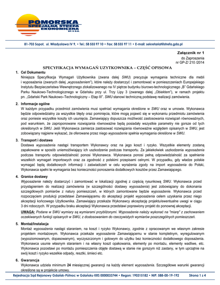 81-703 Sopot, ul. Władysława IV 9, • Tel.: 58 555 97 10 • Fax: 58 555 97 11 • E-mail: [email protected] Załącznik nr 1 do Zaproszenia nr GP-Z/ 210 /2014 SPECYFIKACJA WYMAGAŃ UZYTKOWNIKA – CZĘŚĆ OPISOWA 1. Cel Dokumentu Niniejsza Specyfikacja Wymagań Użytkownika (zwana dalej SWU) precyzuje wymagania techniczne dla mebli i wyposażenia (zwanych dalej „wyposażeniem”), które należy dostarczyć i zamontować w pomieszczeniach Europejskiego Instytutu Bezpieczeństwa Wewnętrznego zlokalizowanego na IV piętrze budynku biurowo-technologicznego „B” Gdańskiego Parku Naukowo-Technologicznego w Gdańsku przy ul. Trzy Lipy 3 (zwanego dalej „Obiektem”), w ramach projektu pn. „Gdański Park Naukowo–Technologiczny – Etap III”. SWU stanowi techniczną podstawę realizacji zamówienia. 2. Informacje ogólne W każdym przypadku przedmiot zamówienia musi spełniać wymagania określone w SWU oraz w umowie. Wykonawca będzie odpowiedzialny za wszystkie błędy oraz pominięcia, które mogą pojawić się w wykonaniu przedmiotu zamówienia oraz poniesie wszystkie koszty ich usunięcia. Zamawiający dopuszcza możliwość zastosowania rozwiązań równoważnych, pod warunkiem, że zaproponowane rozwiązania równoważne będą posiadały wszystkie parametry nie gorsze od tych określonych w SWU. Jeśli Wykonawca zamierza zastosować rozwiązania równoważne względem opisanych w SWU, jest zobowiązany najpierw wykazać, że oferowane przez niego wyposażenie spełnia wymagania określone w SWU. 3. Transport i dostawa Dostawa wyposażenia nastąpi transportem Wykonawcy oraz na jego koszt i ryzyko. Wszystkie elementy zostaną zapakowane w sposób uniemożliwiający ich uszkodzenie podczas transportu. Za jakiekolwiek uszkodzenia wyposażenia podczas transportu odpowiedzialność ponosi Wykonawca. Wykonawca ponosi pełną odpowiedzialność za spełnienie wszelkich wymagań importowych oraz za zgodność z polskimi przepisami celnymi. W przypadku, gdy władze polskie wymagać będą dodatkowych informacji i zaświadczeń w celu wyrażenia zgody na import wyposażenia do Polski, Wykonawca spełni te wymagania bez konieczności ponoszenia dodatkowych kosztów przez Zamawiającego. 4. Granice dostawy Wyposażenie należy dostarczyć i zamontować w lokalizacji zgodnej z częścią rysunkową SWU. Wykonawca przed przystąpieniem do realizacji zamówienia (w szczególności dostawy wyposażenia) jest zobowiązany do dokonania szczegółowych pomiarów z natury pomieszczeń, w których zamontowane będzie wyposażenie. Wykonawca przed rozpoczęciem produkcji przedstawi Zamawiającemu do akceptacji projekt wyposażenia celem uzyskania przez niego akceptacji końcowego Użytkownika. Zamawiający przekaże Wykonawcy akceptację projektu/ewentualne uwagi w ciągu 3 dni roboczych. W przypadku braku akceptacji Wykonawca przedstawi poprawiony projekt do ponownej akceptacji. UWAGA: Podane w SWU wymiary są wymiarami przybliżonymi. Wyposażenie należy wykonać na "miarę" z zachowaniem oczekiwanych funkcji opisanych w SWU, z dostosowaniem do rzeczywistych wymiarów poszczególnych pomieszczeń. 5. Montaż/Instalacja Montaż wyposażenia nastąpi staraniem, na koszt i ryzyko Wykonawcy, zgodnie z opracowanym we własnym zakresie projektem montażowym. Wykonawca przekaże wyposażenie Zamawiającemu w stanie kompletnym, wyregulowanym (wypoziomowanym, dopasowanym), wyczyszczonym i gotowym do użytku bez konieczności dodatkowego doposażenia. Wykonawca usunie własnym staraniem i na własny koszt opakowania, elementy po montażu, elementy wadliwe, etc. Wykonawca pozostawi po montażu pomieszczenia objęte dostawą w stanie nie gorszym niż zastany, w tym uprzątnie na swój koszt i ryzyko wszelkie odpady, resztki, śmieci etc. 6. Gwarancja Wykonawca udziela minimum 24 miesięcznej gwarancji na każdy element wyposażenia. Szczegółowe warunki gwarancji określone są w projekcie umowy. Rejestracja Sąd Rejonowy Gdańsk-Północ w Gdańsku KRS 0000033744 • Regon: 190315182 • NIP: 588-00-19-192 Strona 1 z 4 81-703 Sopot, ul. Władysława IV 9, • Tel.: 58 555 97 10 • Fax: 58 555 97 11 • E-mail: [email protected] 7. Specyfikacja asortymentowa wyposażenia laboratoryjnego Nr Nazwa pozycji Ilość elementu 01 1 Stojak (na telewizor typu LCD, LED, Plazma) 02 1 03 4 04 4 05 2 06 2 07 3 08 2 09 4 10 1 11 4 Opis elementu • uniwersalny uchwyt o wadze do 40kg, dedykowany dla telewizorów typu LCD/ LED 32"-52" • funkcja pivot - umożliwia zmianę położenia telewizora z horyzontalnej na wertykalną • regulacja wysokości telewizora na teleskopowej kolumnie, w zakresie do 1,8 m • stojak na kółkach z funkcją blokady • półka na komputer Flipchart • rozmiar powierzchni użytkowej (szer. x wys.) min.70x100 cm • powierzchnia suchościeralno-magnetyczna • konstrukcja w kolorze grafitowym, rama aluminiowa • kółka z systemem blokowania zapewniającym stabilność Tablica • rozmiar powierzchni użytkowej (szer. x wys.) min. 170x100 cm suchościeralno- • powierzchnia suchościeralno-magnetyczna magnetyczna • rodzaj powierzchni: stal lakierowana Biurko proste • wymiary (szer. x głęb. x wys.): 160x68x74 (±2) cm na stelażu • konstrukcja: stelaż metalowy typu "C" • blat z płyty o grubości min. 25 mm pokrytej melaminą • krawędzie blatów zabezpieczone trwałym obrzeżem typu ABS w kolorze płyty • 2 przelotki na kable - umieszczone z dwóch stron blatu • kolorystyka: orzech Ścianka • wymiary (szer. x wys.): 160x37,5 (±2) cm frontowa • wykonana z płyty o grubości min. 18mm pokrytej melaminą, element składowy biurka działowa • kolorystyka: orzech Regał niski • wymiary (szer. x głęb. x wys.): 80x35x77 (±2) cm • wykonany z płyty o grubości min. 18mm pokrytej melaminą • regał do przechowywania segregatorów (w 2 rzędach) • kolorystyka: orzech Krzesło • wymiary (szer. x głęb. x wys.): 48x45x100-117(±2) cm obrotowe • sied