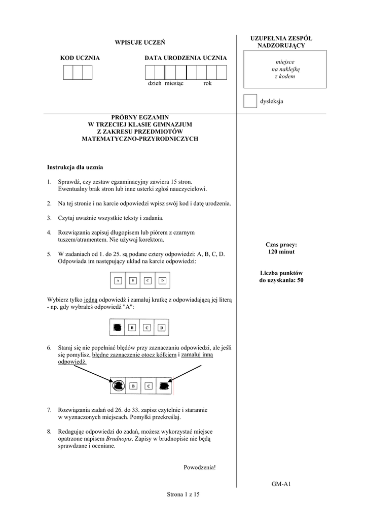 UZUPEŁNIA ZESPÓŁ NADZORUJĄCY WPISUJE UCZEŃ KOD UCZNIA DATA URODZENIA UCZNIA dzień miesiąc miejsce na naklejkę z kodem rok dysleksja PRÓBNY EGZAMIN W TRZECIEJ KLASIE GIMNAZJUM Z ZAKRESU PRZEDMIOTÓW MATEMATYCZNO-PRZYRODNICZYCH Instrukcja dla ucznia 1. Sprawdź, czy zestaw egzaminacyjny zawiera 15 stron. Ewentualny brak stron lub inne usterki zgłoś nauczycielowi. 2. Na tej stronie i na karcie odpowiedzi wpisz swój kod i datę urodzenia. 3. Czytaj uważnie wszystkie teksty i zadania. 4. Rozwiązania zapisuj długopisem lub piórem z czarnym tuszem/atramentem. Nie używaj korektora. 5. W zadaniach od 1. do 25. są podane cztery odpowiedzi: A, B, C, D. Odpowiada im następujący układ na karcie odpowiedzi: A B C Czas pracy: 120 minut Liczba punktów do uzyskania: 50 D Wybierz tylko jedną odpowiedź i zamaluj kratkę z odpowiadającą jej literą - np. gdy wybrałeś odpowiedź "A": 6. Staraj się nie popełniać błędów przy zaznaczaniu odpowiedzi, ale jeśli się pomylisz, błędne zaznaczenie otocz kółkiem i zamaluj inną odpowiedź. 7. Rozwiązania zadań od 26. do 33. zapisz czytelnie i starannie w wyznaczonych miejscach. Pomyłki przekreślaj. 8. Redagując odpowiedzi do zadań, możesz wykorzystać miejsce opatrzone napisem Brudnopis. Zapisy w brudnopisie nie będą sprawdzane i oceniane. Powodzenia! GM-A1 Strona 1 z 15 Informacje do zadań 1., 2., 3., 4. i 5. Uczniowie klas trzecich pewnego gimnazjum urządzili w swoich salach wystawy przedstawiające najciekawsze miejsca w różnych krajach. Po obejrzeniu wszystkich ekspozycji przeprowadzona została ankieta, w której uczniowie odpowiadali na pytanie, który kraj chcieliby odwiedzić. Każdy z ankietowanych mógł wybrać tylko jeden kraj. Oto jakich wyborów dokonali uczniowie. Zadanie 1. (0 – 1) Ilu uczniów uczestniczyło w ankiecie? A. 310 B. 300 C. 290 D. 250 Zadanie 2. (0 – 1) Jaki procent wszystkich uczniów stanowili ci, którzy wybrali kraje azjatyckie? 1 A. 48 % 3 2 B. 41 % 3 2 C. 26 % 3 1 D. 18 % 3 Zadanie 3. (0 – 1) Jaki procent liczby uczniów wybierających Indie stanowiła liczba uczniów, którzy wybrali Egipt? A. 150% 2 B. 66 % 3 C. 60% Strona 2 z 15 D. 40% Zadanie 4. (0 – 1) Wskaż zdanie prawdziwe. A. Liczba uczniów, którzy wybrali Australię jest o połowę mniejsza od liczby uczniów, którzy wybrali USA. B. Liczba uczniów, którzy wybrali Indie, jest czterokrotnie większa niż liczba uczniów, którzy wybrali kraje europejskie. C. Liczba uczniów, którzy wybrali kraje europejskie, jest o połowę większa niż liczba uczniów, którzy wybrali Australię lub Egipt. D. Liczba uczniów, którzy wybrali Włochy lub Indie, jest taka sama jak liczba uczniów, którzy wybrali Japonię lub Egipt. Zadanie 5. (0 – 1) Niektóre państwa wymienione w diagramie słupkowym należą do Unii Europejskiej. Dwa z nich przyjęły wspólną walutę euro. Są to A. Wielka Brytania i Włochy. C. Szwecja i Wielka Brytania. B. Włochy i Szwecja. D. Austria i Włochy. Zadanie 6. (0 – 1) Przedstawiona na rysunku flaga Wielkiej Brytanii A. ma cztery osie symetrii i środek symetrii. B. ma cztery osie symetrii i nie ma środka symetrii. C. ma dwie osie symetrii i środek symetrii. D. ma dwie osie symetrii i nie ma środka symetrii. Strona 3 z 15 Informacje do zadań 7. i 8. Tabela gęstości metali Nazwa Symbol glin Al g ) cm 3 2,70 miedź Cu 8,93 ołów Pb 11,40 złoto Au 19,32 żelazo Fe 7,87 Gęstość ( Zadanie 7. (0 – 1) W sali, w której zebrano eksponaty charakterystyczne dla Kraju Kwitnącej Wiśni – Japonii, znajdował się posążek Buddy. Posążek wykonany ze złota o masie 7728 g miałby objętość A. 4000 cm3 B. 400 cm3 C. 40 cm3 D. 4 cm3 Zadanie 8. (0 – 1) Gdyby z metali wymienionych w tabeli wykonane zostały posążki Buddy o takiej samej objętości, to posążek o najmniejszej masie wykonany byłby z A. glinu. B. miedzi. C. ołowiu. D. żelaza. Zadanie 9. (0 – 1) Rysunek przedstawia wykres zależności pomiędzy masą (m) ciała a jego objętością (v) dla czterech różnych substancji. Która z półprostych przedstawia zależność pomiędzy masą a objętością ciała o gęstości g równej 0,8 ? cm 3 A. I B. II C. III Strona 4 z 15 D. IV Zadanie 10. (0 – 1) Na siłomierzu zawieszono posążek Buddy. Siłomierz wskazywał wtedy wartość 77,3 N. Po zanurzeniu posążka w wodzie wskazanie siłomierza zmniejszyło się do 73 N. Wskaż zdanie prawdziwe. A. W wodzie masa posążka jest mniejsza niż w powietrzu. B. W wodzie na posążek działa mniejsza siła grawitacji. C. W wodzie na posążek oprócz siły grawitacji działa siła wyporu. D. W wodzie na posążek działa tylko siła wyporu.. Zadanie 11. (0 – 1) Wykres przedstawia zależność drogi (S) przebytej przez autobus wycieczkowy od czasu jazdy autobusu (t). Analizując przedstawiony wykres można stwierdzić, że prędkość autobusu A. najpierw rosła, potem wynosiła zero. B. najpierw rosła, potem malała. C. najpierw rosła, potem była stała. D. najpierw była stała, potem wynosiła zero. Strona 5 z 15 Informacje do zadań 12. i 13. W czasie wycieczki do Berlina kilku uczniów weszło do pizzerii. Postanowili kupić jedną dużą pizzę i podzielić ją między siebie na równe kawałki. Wykres przedstawia zależność między kosztem (y), jaki musi ponieść każdy uczeń za jeden kawałek pizzy, a liczbą (x) kupujących i dzielących pizzę. Zadanie 12. (0 – 1) Wskaż zapis algebraiczny zależności przedstawionej na wykresie. A. y = 4x B. y = 4 x C. y = 0,4x D. y = x 4 Zadanie 13. (0 – 1) Ile musiałby zapłacić za jeden kawałek pizzy każdy z ośmiu kupujących tę pizzę? A. 0,5 euro B. 1,6 euro C. 4 euro D. 8 euro Zadanie 14. (0 – 1) Uczniowie oglądali makietę Alp – najwyższych gór Europy. Znaleźli na niej najwyższy szczyt Austrii – Grossglockner (3797 m n.p.m.) i najwyższy szczyt Europy – Mont Blanc (4807 m n.p.m.). Wysokość względna Mont Blanc w stosunku do Grossglockner 