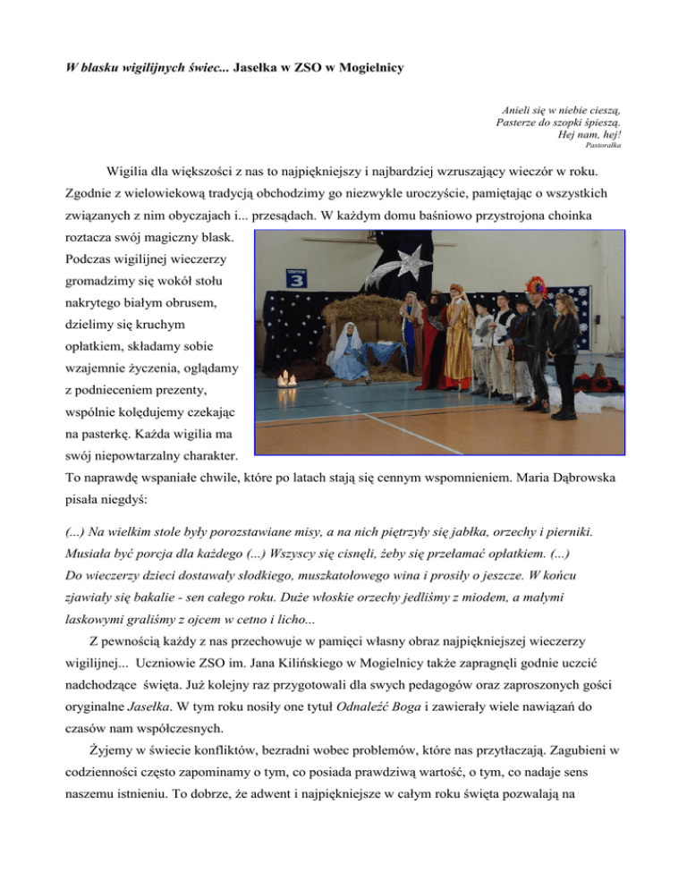 W blasku wigilijnych świec... Jasełka w ZSO w Mogielnicy Anieli się w niebie cieszą, Pasterze do szopki śpieszą. Hej nam, hej! Pastorałka Wigilia dla większości z nas to najpiękniejszy i najbardziej wzruszający wieczór w roku. Zgodnie z wielowiekową tradycją obchodzimy go niezwykle uroczyście, pamiętając o wszystkich związanych z nim obyczajach i... przesądach. W każdym domu baśniowo przystrojona choinka roztacza swój magiczny blask. Podczas wigilijnej wieczerzy gromadzimy się wokół stołu nakrytego białym obrusem, dzielimy się kruchym opłatkiem, składamy sobie wzajemnie życzenia, oglądamy z podnieceniem prezenty, wspólnie kolędujemy czekając na pasterkę. Każda wigilia ma swój niepowtarzalny charakter. To naprawdę wspaniałe chwile, które po latach stają się cennym wspomnieniem. Maria Dąbrowska pisała niegdyś: (...) Na wielkim stole były porozstawiane misy, a na nich piętrzyły się jabłka, orzechy i pierniki. Musiała być porcja dla każdego (...) Wszyscy się cisnęli, żeby się przełamać opłatkiem. (...) Do wieczerzy dzieci dostawały słodkiego, muszkatołowego wina i prosiły o jeszcze. W końcu zjawiały się bakalie - sen całego roku. Duże włoskie orzechy jedliśmy z miodem, a małymi laskowymi graliśmy z ojcem w cetno i licho... Z pewnością każdy z nas przechowuje w pamięci własny obraz najpiękniejszej wieczerzy wigilijnej... Uczniowie ZSO im. Jana Kilińskiego w Mogielnicy także zapragnęli godnie uczcić nadchodzące święta. Już kolejny raz przygotowali dla swych pedagogów oraz zaproszonych gości oryginalne Jasełka. W tym roku nosiły one tytuł Odnaleźć Boga i zawierały wiele nawiązań do czasów nam współczesnych. Żyjemy w świecie konfliktów, bezradni wobec problemów, które nas przytłaczają. Zagubieni w codzienności często zapominamy o tym, co posiada prawdziwą wartość, o tym, co nadaje sens naszemu istnieniu. To dobrze, że adwent i najpiękniejsze w całym roku święta pozwalają na wewnętrzne wyciszenie, skłaniają do zastanowienia: Do czego dążymy? Co chcemy osiągnąć? Czego potrzebujemy do szczęścia? Co jest dla nas najważniejsze? Program zaprezentowany przez młodzież ZSO wprowadził uczestników spotkania w uroczystą świąteczną atmosferę. Otoczeni ciepłym blaskiem wigilijnych świec, urzeczeni nieprzemijającym pięknem kolęd poczuliśmy się naprawdę wyjątkowo. Mądre słowa płynące ze szkolnej sceny uświadomiły nam, dlaczego co roku z taką dziecinną ufnością czekamy na Boże Narodzenie. Jakże prostą i jasną odpowiedź podsuwa Anselm Grun, pisząc: Narodziny Jezusa w betlejemskiej stajence wzbudzają w każdym z nas tęsknotę za bardziej ludzkim światem, w którym miłość jest silniejsza od nienawiści, a światło rozprasza ciemność. Narodziny Jezusa są obietnicą, że nie wszystko zostanie po staremu, że Bóg dokona w tym świecie czegoś nowego, że odnowi świat dzięki miłości (...). Szkolną wigilię zakończyły życzenia, które w imieniu wszystkich uczniów złożyli przedstawiciele Samorządu Uczniowskiego. Po części artystycznej uroczystości p. dyrektor Dariusz Sańpruch podziękował młodym artystom oraz ich opiekunom (p. dyrektor Urszuli Tomali-Kujat, p. dyrektor Jolancie Tomczyk, p. Marioli Kuźmie, p. Annie Woźnicy, p. Marii Lenart, p. Mirosławie Koperskiej, p. Jolancie Ścisłowskiej) za przygotowanie interesującej akademii. Dyrektor nie zapomniał także o życzeniach dla uczniów, nauczycieli oraz gości, którzy przybyli na naszą uroczystość. Wśród zaproszonych nie zabrakło: Burmistrza G. i M. Mogielnica – p. Sławomira Chmielewskiego, wiceprzewodniczącego Rady Gminy – p. Wiesława Wilewskiego, licznej reprezentacji radnych, emerytowanych nauczycieli oraz rodziców uczniów, z Przewodniczącym Rady Rodziców – p. Robertem Krawczykiem – na czele. Pan burmistrz wyraził swoją wdzięczność za zaproszenie na Jasełka i skierował do zebranych ciepłe słowa z okazji Świąt Bożego Narodzenia. Podobnie jak rok temu grono pedagogiczne, pracownicy szkoły oraz zaproszeni goście symbolicznie podzielili się opłatkiem, a następnie zasiedli do wspólnej wieczerzy. Na stole królowały ryby i pierogi z grzybami. Towarzyszyły nam najpiękniejsze polskie kolędy. Tradycja – rzecz święta Kiedy Kiedy nasza mama zapala lampki na choince, dom staje się świąteczną latarnią, która pokazuje drogę w ciemności. Kiedy nasza mama kładzie prezenty pod zielonym drzewkiem, czujemy się jak małe dzieci, oczarowane niepojętą tajemnicą Bożego Narodzenia. Kiedy nasza mama trzyma w swych rękach biały opłatek, odłamujemy z niego małe kawałki dobra i przekazujemy je innym. Edyta Mydłowska fot. Jarosław Mydłowski