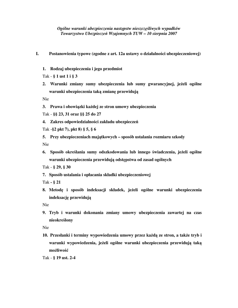 Ogólne warunki ubezpieczenia następstw nieszczęśliwych wypadków Towarzystwo Ubezpieczeń Wzajemnych TUW – 10 sierpnia 2007 I. Postanowienia typowe (zgodne z art. 12a ustawy o działalności ubezpieczeniowej) 1. Rodzaj ubezpieczenia i jego przedmiot Tak - § 1 ust 1 i § 3 2. Warunki zmiany sumy ubezpieczenia lub sumy gwarancyjnej, jeżeli ogólne warunki ubezpieczenia taką zmianę przewidują Nie 3. Prawa i obowiązki każdej ze stron umowy ubezpieczenia Tak - §§ 23, 31 oraz §§ 25 do 27 4. Zakres odpowiedzialności zakładu ubezpieczeń Tak -§2 pkt 7), pkt 8) § 5, § 6 5. Przy ubezpieczeniach majątkowych – sposób ustalania rozmiaru szkody Nie 6. Sposób określania sumy odszkodowania lub innego świadczenia, jeżeli ogólne warunki ubezpieczenia przewidują odstępstwa od zasad ogólnych Tak - § 29, § 30 7. Sposób ustalania i opłacania składki ubezpieczeniowej Tak - § 21 8. Metodę i sposób indeksacji składek, jeżeli ogólne warunki ubezpieczenia indeksację przewidują Nie 9. Tryb i warunki dokonania zmiany umowy ubezpieczenia zawartej na czas nieokreślony Nie 10. Przesłanki i terminy wypowiedzenia umowy przez każdą ze stron, a także tryb i warunki wypowiedzenia, jeżeli ogólne warunki ubezpieczenia przewidują taką możliwość Tak - § 19 ust. 2-4 II. Przedmiot i zakres odpowiedzialności ubezpieczyciela 1. Ochroną ubezpieczeniową objęte są następstwa nieszczęśliwych wypadków zaistniałych w okresie ubezpieczenia, zaistniałych na terytorium RP oraz za granicą. (§ 1 ust. 1 owu) 2. Odpowiedzialność Towarzystwa w pełnym zakresie ochrony obejmuje odpowiedzialność za wypadki, które mogą mieć miejsce podczas pracy zawodowej lub wykonywania innych czynności określonych w umowie ubezpieczenia oraz w drodze do i z pracy oraz życiu prywatnym. (§ 2 pkt 7 owu) 3. Ograniczony zakres ochrony ubezpieczeniowej obejmuje odpowiedzialność Towarzystwa za: a) wypadki które mogą mieć miejsce podczas pracy zawodowej lub wykonywania innych czynności określonych w umowie ubezpieczenia oraz w drodze do i z pracy b) wypadki które mogą mieć miejsce wyłącznie podczas pracy zawodowej lub wykonywania innych czynności określonych w umowie ubezpieczenia (§ 2 pkt 7 owu) 4. Ponadto, na wniosek przedmiot ubezpieczenia może zostać rozszerzony o następstwa powstałe w wyniku ryzyk dodatkowych: (1)zawału serca i udaru mózgu, (2) chorób tropikalnych, (3) działań wojennych, stanu wojennego i stanu wyjątkowego, za wyjątkiem umów ubezpieczeniowych zawieranych w formie pakietów. (§ 1 ust. 1 § 3). III. Wyłączenia bądź ograniczania odpowiedzialności ubezpieczyciela 1. Zgodnie z § 10 ust. 1, z odpowiedzialności Towarzystwa wyłączone są następstwa nieszczęśliwych wypadków powstałych na skutek: 1) Prowadzenia wszelkiego rodzaju pojazdów bez wymaganych uprawnień; 2) Prowadzenia wszelkiego rodzaju pojazdów po spożyciu alkoholu, użyciu narkotyków lub innych środków odurzających; 3) spożycia przez Ubezpieczonego alkoholu, użycia narkotyków lub innych środków odurzających 4) popełnienia lub usiłowania popełnienia przez Ubezpieczonego przestępstwa; 5) popełnienia lub usiłowania popełnienia przez Ubezpieczonego samookaleczenia lub samobójstwa; 6) leczenia lub zabiegów leczniczych, zabiegów kosmetycznych, bez względu na to przez kogo były wykonywane; 7) zaburzeń psychicznych lub napadów epileptycznych Ubezpieczonego; 8) używania statków powietrznych (urządzeń lotniczych) bez napędu motorowego, motolotni, samolotów o lekkiej konstrukcji; 9) wyczynowego uprawiania sportów; 10) działań wojennych, stanu wojennego lub wyjątkowego, chyba że ryzyka te zostały objęte umową ubezpieczenia poprzez opłacenie dodatkowej składki; 11) aktów terrorystycznych; 12) zamieszek, rozruchów, bójek; 13) chorób tropikalnych, chyba że ryzyko to zostało objęte umową ubezpieczenia poprzez opłacenie dodatkowej składki, 14) winy umyślnej lub rażącego niedbalstwa Ubezpieczonego. 2. Z odpowiedzialności Towarzystwa wyłączone są następstwa nieszczęśliwych wypadków, powstałych na skutek prowadzenia wszelkiego rodzaju pojazdów przez osobę trzecią bez wymaganych uprawnień lub po spożyciu alkoholu, użyciu narkotyków lub innych środków odurzających, jeżeli Ubezpieczony o tym wiedział, a miało to wpływ na okoliczności powstania wypadku (§ 10 ust. 2 owu) 3. Z odpowiedzialności Towarzystwa wyłączone są także choroby zawodowe, choroby przewlekłe oraz wszelkie choroby i stany chorobowe nawet takie jak zawal serca i udar mózgu, chyba że ryzyko zawału serca i udaru mózgu zostało objęte umową ubezpieczenia poprzez opłacenie dodatkowej składki. IV. Warto zwrócić uwagę 1) Stosownie do postanowień § 4 ust. 2 i ust. 3 w ubezpieczeniu indywidualnym, zawieranym na rzecz osób: a) w wieku do 30 roku życia przedmiot ubezpieczenia zostaje rozszerzony o ryzyko następstw zawału serca i udaru mózgu bez konieczności opłaty dodatkowej składki, b) które ukończyły 60 rok życia, przedmiot ubezpieczenia może zostać rozszerzony o ryzyko następstw zawału serca i udaru mózgu wyłącznie w przypadku kontynuacji takiej umowy ubezpieczenia w Towarzystwie przez okres co najmniej 2 lat. Umowę ubezpieczenia o rozszerzonym wariancie odpowiedzialności z tytułu następstw zawału serca i udaru mózgu, można kontynuować do 65 roku życia. 2) Postanowienia OWU dotyczące poszczególnych świadczeń w szczególności: a) zwrotu kosztów leczenia i zasiłku dziennego, oraz kosztów operacji plastycznych (§ 8 ust. 1, ust 3 i ust. 4), b) - kosztów naprawy lub nabycia protez, przeszkolenia za-wodowego, dziennego świadczenia szpitalnego (§ 7 ust. 3 4). 3) W przypadku zaistnienia wypadku ubezpieczeniowego Ubezpieczony zobowiązany jest do wykonania szeregu obowiązków, w tym powiadomienia Towarzystwa o zajściu wypadku w terminie 14 dni od daty zaistnienia wypadku (§ 26 ust. 1 i następne). W przyp