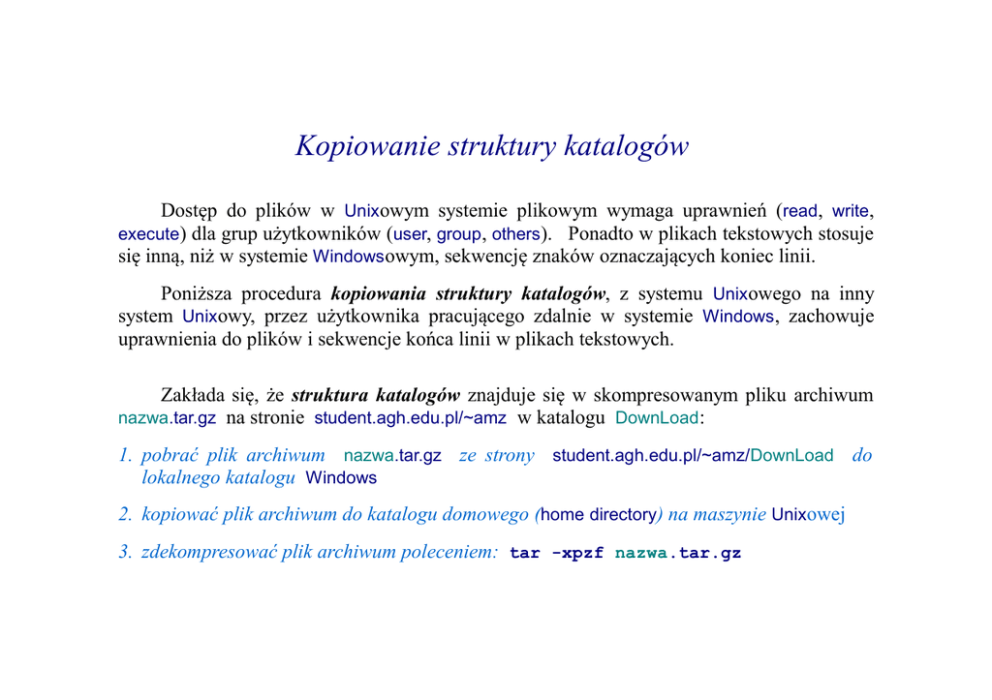 Kopiowanie struktury katalogów Dostęp do plików w Unixowym systemie plikowym wymaga uprawnień (read, write, execute) dla grup użytkowników (user, group, others). Ponadto w plikach tekstowych stosuje się inną, niż w systemie Windowsowym, sekwencję znaków oznaczających koniec linii. Poniższa procedura kopiowania struktury katalogów, z systemu Unixowego na inny system Unixowy, przez użytkownika pracującego zdalnie w systemie Windows, zachowuje uprawnienia do plików i sekwencje końca linii w plikach tekstowych. Zakłada się, że struktura katalogów znajduje się w skompresowanym pliku archiwum nazwa.tar.gz na stronie student.agh.edu.pl/~amz w katalogu DownLoad: 1. pobrać plik archiwum nazwa.tar.gz ze strony student.agh.edu.pl/~amz/DownLoad do lokalnego katalogu Windows 2. kopiować plik archiwum do katalogu domowego (home directory) na maszynie Unixowej 3. zdekompresować plik archiwum poleceniem: tar -xpzf nazwa.tar.gz Można również plik, znajdujący się pod określonym linkiem, pobrać bezpośrednio przy pomocy polecenia wget: wget student.agh.edu.pl/~amz/DownLoad/nazwa.tar.gz