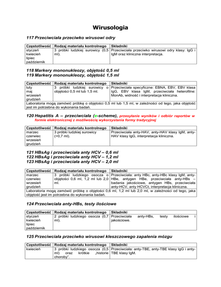 Wirusologia 117 Przeciwciała przeciwko wirusowi odry Częstotliwość Rodzaj materiału kontrolnego Składniki styczeń 3 próbki ludzkiej surowicy (0,5 Przeciwciała przeciwko wirusowi odry klasy: IgG i kwiecień ml). IgM oraz kliniczna interpretacja. lipiec październik 118 Markery mononukleozy, objętość 0,5 ml 119 Markery mononukleozy, objętość 1,5 ml Częstotliwość Rodzaj materiału kontrolnego Składniki luty 3 próbki ludzkiej surowicy o Przeciwciała specyficzne: EBNA, EBV, EBV klasa maj objętości 0,5 ml lub 1,5 ml. IgG, EBV klasa IgM, przeciwciała heterofilne: wrzesień MonAb, widność i interpretacja kliniczna. grudzień Laboratoria mogą zamówić próbkę o objętości 0,5 ml lub 1,5 ml, w zaleŜności od tego, jaka objętość jest im potrzebna do wykonania badań. 120 Hepatitis A – przeciwciała (e-scheme), przesyłanie wyników i odbiór raportów w formie elektronicznej z moŜliwością wykorzystania formy tradycyjnej Częstotliwość Rodzaj materiału kontrolnego marzec 3 próbki ludzkiej surowicy czerwiec (>0,7 ml). wrzesień grudzień Składniki Przeciwciała anty-HAV, anty-HAV klasy IgM, antyHAV klasy IgG, interpretacja kliniczna. 121 HBsAg i przeciwciała anty HCV – 0,6 ml 122 HBsAg i przeciwciała anty HCV – 1,2 ml 123 HBsAg i przeciwciała anty HCV – 2,0 ml Częstotliwość Rodzaj materiału kontrolnego Składniki marzec 3 próbki ludzkiego osocza o Przeciwciała: anty HBc, anty-HBc klasy IgM, antyczerwiec objętości 0,6 ml, 1,2 ml lub 2,0 HBe, antygen HBe, przeciwciała anty-HBs – wrzesień ml. badania jakościowe, antygen HBs, przeciwciała grudzień anty-HCV, anty HCVCt, interpretacja kliniczna. Laboratoria mogą zamówić próbkę o objętości 0,6 ml, 1,2 ml lub 2,0 ml, w zaleŜności od tego, jaka objętość jest im potrzebna do wykonania badań. 124 Przeciwciała anty-HBs, testy ilościowe Częstotliwość Rodzaj materiału kontrolnego Składniki styczeń 2 próbki ludzkiego osocza (0,7 Przeciwciała kwiecień ml). jakościowe. lipiec październik anty-HBs, testy ilościowe i 125 Przeciwciała przeciwko wirusowi kleszczowego zapalenia mózgu Częstotliwość Rodzaj materiału kontrolnego Składniki kwiecień 3 próbki ludzkiego osocza (0,5 Przeciwciała: anty-TBE, anty-TBE klasy IgG i antyml) oraz krótkie „historie TBE klasy IgM. choroby”. 126 Przeciwciała przeciwko wirusowi świnki Częstotliwość Rodzaj materiału kontrolnego styczeń 3 próbki ludzkiej surowicy (0,5 kwiecień ml). lipiec październik Składniki Przeciwciała przeciwko wirusowi świnki „total” (SMumpsAb), przeciwciała klasy: IgG i IgM oraz kliniczna interpretacja. 127 Herpes simplex 1 - przeciwciała Herpes simplex 2 - przeciwciała Częstotliwość marzec czerwiec wrzesień grudzień Rodzaj materiału kontrolnego 3 próbki ludzkiej surowicy (> 0,5 ml) oraz krótkie „historie choroby”. Składniki Przeciwciała: anty-HSV, anty-HSV klasy IgG, antyHSV klasy IgM, anty-HSV1 klasa IgG, anty-HSV2 klasa IgG. 128 Przeciwciała przeciwko wirusowi cytomegalii (e-scheme), przesyłanie wyników i odbiór raportów w formie elektronicznej z moŜliwością wykorzystania formy tradycyjnej Częstotliwość Rodzaj materiału kontrolnego Składniki luty 3 próbki płynnej ludzkiej Przeciwciała przeciwko CMV – całkowite, klasy: maj surowicy (>0,7 ml). IgG, IgM, awidność i interpretacja kliniczna. wrzesień grudzień 129 Przeciwciała HIV, badania przesiewowe i testy potwierdzenia (e-scheme), przesyłanie wyników i odbiór raportów wykorzystania formy tradycyjnej Częstotliwość Rodzaj materiału kontrolnego marzec 4 próbki liofilizowanej ludzkiej czerwiec surowicy (> 0,7 ml). wrzesień grudzień w formie elektronicznej z moŜliwością Składniki Przeciwciała anty–HIV, anty-HIV-1, anty-HIV-2, antygen p 24, anty-HIV+ antygen p 24 (combo), testy przesiewowe i testy potwierdzenia. 130 Detekcja antygenu wirusa grypy (A+B) Częstotliwość Rodzaj materiału kontrolnego styczeń 3 próbki aspiratów z listopad nosogardzieli. Składniki Antygeny InfA, InfB, InfA+BAg. 131 Detekcja antygenu wirusa oddechowego RS Częstotliwość Rodzaj materiału kontrolnego styczeń 3 próbki aspiratów z listopad nosogardzieli. Składniki Antygen wirusa oddechowego RS 132 Antygeny Rota i Adenowirusów Częstotliwość Rodzaj materiału kontrolnego marzec 3 próbki zawiesiny kału. czerwiec wrzesień grudzień Składniki Bezpośrednie wykrywanie antygenów. 133 Wirus róŜyczki Częstotliwość Rodzaj materiału kontrolnego styczeń 3 próbki ludzkiej surowicy (> 0,5 kwiecień ml). lipiec październik Składniki Przeciwciała przeciwko róŜyczce klasy IgG, IgM, awidność i interpretacja kliniczna. 134 Wirus ospy wietrznej Częstotliwość Rodzaj materiału kontrolnego marzec 3 próbki ludzkiej surowicy po > 0,5 ml czerwiec w sprawdzianie. wrzesień grudzień Składniki VZVAb, VZVAbG, VZVAbM i interpretacja kliniczna.