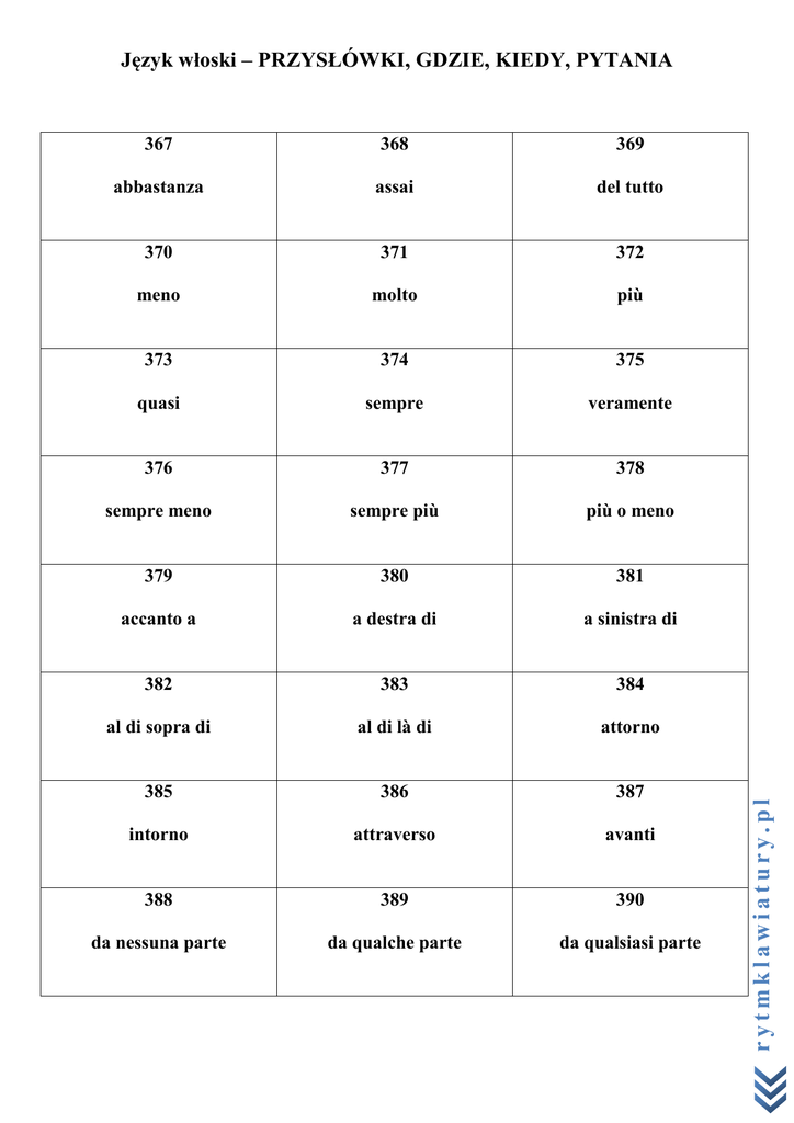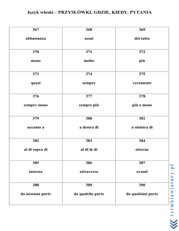 367 368 369 abbastanza assai del tutto 370 371 372 meno molto più 373 374 375 quasi sempre veramente 376 377 378 sempre meno sempre più più o meno 379 380 381 accanto a a destra di a sinistra di 382 383 384 al di sopra di al di là di attorno 385 386 387 intorno attraverso avanti 388 389 390 da nessuna parte da qualche parte da qualsiasi parte rytmklawiatury.pl Język włoski – PRZYSŁÓWKI, GDZIE, KIEDY, PYTANIA 369 368 367 całkiem bardzo, dość dość 372 371 370 więcej bardzo mniej 375 374 373 rzeczwiście zawsze prawie 378 377 376 mniej więcej, średnio coraz więcej, coraz bardziej coraz mniej 381 380 379 po lewej po prawej obok 384 383 382 wokół, dokoła po drugiej stronie, za ponad, nad 387 386 385 w przód, naprzód przez, poprzez wokół, dokoła 390 389 388 gdziekolwiek gdzieś nigdzie rytmklawiatury.pl Język włoski – PRZYSŁÓWKI, GDZIE, KIEDY, PYTANIA 391 392 393 dappertutto davanti a dentro 394 395 396 di fronte a dietro dopo 397 398 399 fuori giù in mezzo 400 401 402 indietro là, lì laggiù 403 404 405 lassù lontano da oltre 406 407 408 prima di qui, qua sopra 409 410 411 sotto su tra, fra 412 413 414 via vicino a adesso rytmklawiatury.pl Język włoski – PRZYSŁÓWKI, GDZIE, KIEDY, PYTANIA 393 392 391 w środku przed wszędzie 396 395 394 po za, z tyłu przed, naprzeciwko 399 398 397 pośrodku, w środku w dół, na dole na zewnątrz 402 401 400 tam w dole tam do tyłu 405 404 403 poza, za daleko od tam w górze 408 407 406 powyżej, nad, na tutaj przed 411 410 409 między, pomiędzy na, nad poniżej, pod 414 413 412 teraz blisko przez rytmklawiatury.pl Język włoski – PRZYSŁÓWKI, GDZIE, KIEDY, PYTANIA 415 416 417 ora al (nel) fine settiamana al giorno d’oggi 418 419 420 alla fine all’inizio allora 421 422 423 l’anno prossimo l’anno scorso di quando in quando 424 425 426 di solito domani dopo 427 428 429 (tre giorni) fa fino a fra una settimana 430 431 432 frattanto già ieri 433 434 435 immediatamente mai nel frattempo 436 437 438 oggi ogni tanto poi rytmklawiatury.pl Język włoski – PRZYSŁÓWKI, GDZIE, KIEDY, PYTANIA 417 416 415 teraz, obecnie podczas weekendu teraz 420 419 418 wówczas, wtedy na początku, początkowo w końcu 423 422 421 od czasu do czasu w ubiegłym roku w przyszłym roku 426 425 424 po, potem, później jutro zazwyczaj, zwykle 429 428 427 za tydzień do (trzy dni) temu 432 431 430 wczoraj już tymczasem 435 434 433 tymczasem nigdy natychmiast 438 437 436 potem, następnie czasami dzisiaj rytmklawiatury.pl Język włoski – PRZYSŁÓWKI, GDZIE, KIEDY, PYTANIA 439 440 441 presto prima (di) qualche volta 442 443 444 quest’anno recentemente la settimana prossima 445 446 447 la settimana scorsa subito tardi 448 449 450 una volta una volta o l’altra verso la fine 451 452 453 come? come è…? Quanto? Quanta? Quanti? Quante? 454 455 456 Come stai? Come sta? Come mai? 457 458 459 Che (cosa)? Che (cosa) desidera? Che (cosa) Ti metti? 460 461 462 Che (cosa) fai? Che tipo di…? Quando? rytmklawiatury.pl Język włoski – PRZYSŁÓWKI, GDZIE, KIEDY, PYTANIA 441 440 439 czasami przed, zanim wkrótce, zaraz 444 443 442 w przyszłym tygodniu ostatnio tego roku 447 446 445 późno natychmiast w ubiegłym tygodniu 450 449 448 pod koniec kiedyś raz, pewnego razu 453 452 451 Ile? jaki jest…? jak? 456 455 454 Jak to (się stało)? Jak się Pan/Pani ma? Jak się masz? 459 458 457 Co na siebie włożysz? Czego sobie Pan/Pani życzy? Co? 462 461 460 Kiedy? Jakiego rodzaju…? Co robisz? rytmklawiatury.pl Język włoski – PRZYSŁÓWKI, GDZIE, KIEDY, PYTANIA Język włoski – PRZYSŁÓWKI, GDZIE, KIEDY, PYTANIA 463 464 465 Quando è la festa? Dove? Di dove się? 466 467 468 Dov’è? Dove ci vediamo? Quale? 469 470 471 Da che parte è? Quale ti piace? Qual è la tua macchina? 472 473 474 Chi? Chi è? Chi va là? 475 476 477 Chi viene (con me)? Di che è? Perchè? 478 rytmklawiatury.pl Perchè się in ritardo? Język włoski – PRZYSŁÓWKI, GDZIE, KIEDY, PYTANIA 465 464 463 Skąd jesteś? Gdzie? Kiedy jest święto, impreza? 468 467 466 Który? Gdzie się spotkamy? Gdzie jest? 471 470 469 Który samochód jest Twój? Który Ci się podoba? Skąd jest? 474 473 472 Kto idzie? Kto to jest? Kto? 477 476 475 Dlaczego? Czyje to jest? Kto idzie (ze mną)? 478 rytmklawiatury.pl Dlaczego się spóźniłeś?