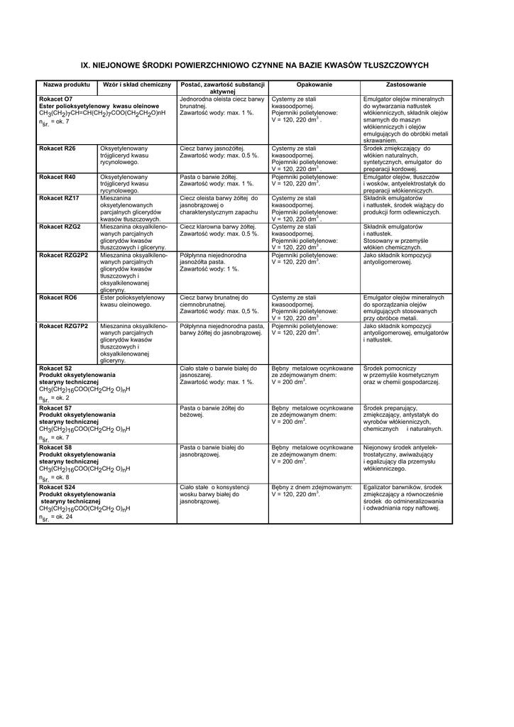 IX. NIEJONOWE ŚRODKI POWIERZCHNIOWO CZYNNE NA BAZIE KWASÓW TŁUSZCZOWYCH Nazwa produktu Wzór i skład chemiczny Rokacet O7 Ester polioksyetylenowy kwasu oleinowe CH3(CH2)7CH=CH(CH2)7COO(CH2CH2O)nH nśr. = ok. 7 Postać, zawartość substancji aktywnej Jednorodna oleista ciecz barwy brunatnej. Zawartość wody: max. 1 %. Rokacet R26 Oksyetylenowany trójgliceryd kwasu rycynolowego. Ciecz barwy jasnożółtej. Zawartość wody: max. 0.5 %. Rokacet R40 Oksyetylenowany trójgliceryd kwasu rycynolowego. Mieszanina oksyetylenowanych parcjalnych glicerydów kwasów tłuszczowych. Mieszanina oksyalkilenowanych parcjalnych glicerydów kwasów tłuszczowych i gliceryny. Mieszanina oksyalkilenowanych parcjalnych glicerydów kwasów tłuszczowych i oksyalkilenowanej gliceryny. Ester polioksyetylenowy kwasu oleinowego. Pasta o barwie żółtej. Zawartość wody: max. 1 %. Mieszanina oksyalkilenowanych parcjalnych glicerydów kwasów tłuszczowych i oksyalkilenowanej gliceryny. Rokacet RZ17 Rokacet RZG2 Rokacet RZG2P2 Ciecz oleista barwy żółtej do jasnobrązowej o charakterystycznym zapachu Ciecz klarowna barwy żółtej. Zawartość wody: max. 0.5 %. Półpłynna niejednorodna jasnożółta pasta. Zawartość wody: 1 %. Opakowanie Cysterny ze stali kwasoodpornej. Pojemniki polietylenowe: V = 120, 220 dm3 . Cysterny ze stali kwasoodpornej. Pojemniki polietylenowe: V = 120, 220 dm3 . Pojemniki polietylenowe: V = 120, 220 dm3. Cysterny ze stali kwasoodpornej. Pojemniki polietylenowe: V = 120, 220 dm3 . Cysterny ze stali kwasoodpornej. Pojemniki polietylenowe: V = 120, 220 dm3 . Pojemniki polietylenowe: V = 120, 220 dm3. Zastosowanie Emulgator olejów mineralnych do wytwarzania natłustek włókienniczych, składnik olejów smarnych do maszyn włókienniczych i olejów emulgujących do obróbki metali skrawaniem. Środek zmiękczający do włókien naturalnych, syntetycznych, emulgator do preparacji kordowej. Emulgator olejów, tłuszczów i wosków, antyelektrostatyk do preparacji włókienniczych. Składnik emulgatorów i natłustek, środek wiążący do produkcji form odlewniczych. Składnik emulgatorów i natłustek. Stosowany w przemyśle włókien chemicznych. Jako składnik kompozycji antyoligomerowej. Półpłynna niejednorodna pasta, barwy żółtej do jasnobrązowej. Cysterny ze stali kwasoodpornej. Pojemniki polietylenowe: V = 120, 220 dm3 . Pojemniki polietylenowe: V = 120, 220 dm3. Emulgator olejów mineralnych do sporządzania olejów emulgujących stosowanych przy obróbce metali. Jako składnik kompozycji antyoligomerowej, emulgatorów i natłustek. Rokacet S2 Produkt oksyetylenowania stearyny technicznej CH3(CH2)16COO(CH2CH2 O)nH nśr. = ok. 2 Ciało stałe o barwie białej do jasnoszarej. Zawartość wody: max. 1 %. Bębny metalowe ocynkowane ze zdejmowanym dnem: V = 200 dm3. Środek pomocniczy w przemyśle kosmetycznym oraz w chemii gospodarczej. Rokacet S7 Produkt oksyetylenowania stearyny technicznej CH3(CH2)16COO(CH2CH2 O)nH nśr. = ok. 7 Pasta o barwie żółtej do beżowej. Bębny metalowe ocynkowane ze zdejmowanym dnem: V = 200 dm3. Środek preparujący, zmiękczający, antystatyk do wyrobów włókienniczych, chemicznych i naturalnych. Rokacet S8 Produkt oksyetylenowania stearyny technicznej CH3(CH2)16COO(CH2CH2 O)nH nśr. = ok. 8 Pasta o barwie białej do jasnobrązowej. Bębny metalowe ocynkowane ze zdejmowanym dnem: V = 200 dm3. Niejonowy środek antyelektrostatyczny, awiważujący i egalizujący dla przemysłu włókienniczego. Rokacet S24 Produkt oksyetylenowania stearyny technicznej CH3(CH2)16COO(CH2CH2 O)nH nśr. = ok. 24 Ciało stałe o konsystencji wosku barwy białej do jasnobrązowej. Bębny z dnem zdejmowanym: V = 120, 220 dm3. Egalizator barwników, środek zmiękczający a równocześnie środek do odmineralizowania i odwadniania ropy naftowej. Rokacet RO6 Rokacet RZG7P2 Ciecz barwy brunatnej do ciemnobrunatnej. Zawartość wody: max. 0,5 %.