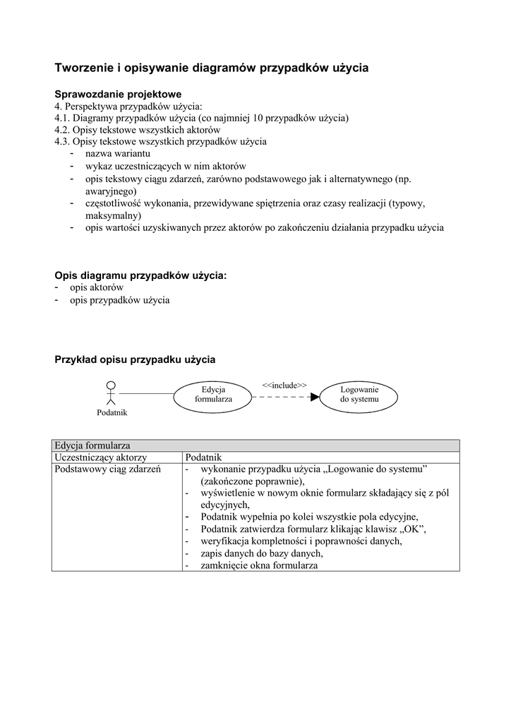 Tworzenie i opisywanie diagramów przypadków użycia Sprawozdanie projektowe 4. Perspektywa przypadków użycia: 4.1. Diagramy przypadków użycia (co najmniej 10 przypadków użycia) 4.2. Opisy tekstowe wszystkich aktorów 4.3. Opisy tekstowe wszystkich przypadków użycia - nazwa wariantu - wykaz uczestniczących w nim aktorów - opis tekstowy ciągu zdarzeń, zarówno podstawowego jak i alternatywnego (np. awaryjnego) - częstotliwość wykonania, przewidywane spiętrzenia oraz czasy realizacji (typowy, maksymalny) - opis wartości uzyskiwanych przez aktorów po zakończeniu działania przypadku użycia Opis diagramu przypadków użycia: - opis aktorów - opis przypadków użycia Przykład opisu przypadku użycia Edycja formularza <<include>> Logowanie do systemu Podatnik Edycja formularza Uczestniczący aktorzy Podstawowy ciąg zdarzeń Podatnik - wykonanie przypadku użycia „Logowanie do systemu” (zakończone poprawnie), - wyświetlenie w nowym oknie formularz składający się z pól edycyjnych, - Podatnik wypełnia po kolei wszystkie pola edycyjne, - Podatnik zatwierdza formularz klikając klawisz „OK”, - weryfikacja kompletności i poprawności danych, - zapis danych do bazy danych, - zamknięcie okna formularza Alternatywne ciągi zdarzeń Parametry czasowe: - częstotliwość wykonania - przewidywane spiętrzenia - typowy czas realizacji Wartości uzyskiwane przez aktorów po zakończeniu przypadku użycia 1. System stwierdza niekompletność lub niepoprawność danych: - wyświetlenie w oknie modalnym komunikatu informującego o błędzie, - Podatnik kilka „OK” umieszczone pod komunikatem, - ustawienie kursora w polu edycyjnym, w którym stwierdzono błąd, - Podatnik wpisuje nową wartość we wskazanym polu, - Podatnik zatwierdza formularz klikając „OK” - ... 2. Podatnik przed zakończeniem wypełniania formularza klika klawisz „Anuluj”: - zamknięcie okna formularza, brak weryfikacji danych i zapisu do bazy, Średnio co 3 uruchomienie systemu, Brak 2 min. Modyfikacja danych w formularzu