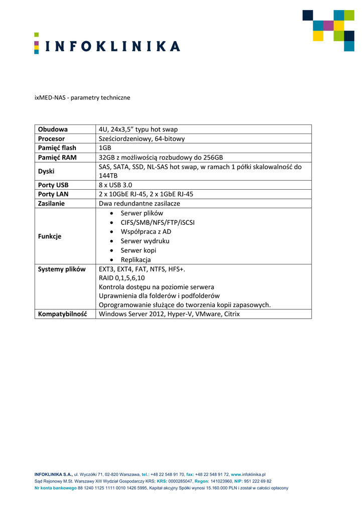 ixMED-NAS - parametry techniczne Obudowa Procesor Pamięć flash Pamięć RAM Dyski Porty USB Porty LAN Zasilanie Funkcje Systemy plików Kompatybilność 4U, 24x3,5” typu hot swap Sześciordzeniowy, 64-bitowy 1GB 32GB z możliwością rozbudowy do 256GB SAS, SATA, SSD, NL-SAS hot swap, w ramach 1 półki skalowalność do 144TB 8 x USB 3.0 2 x 10GbE RJ-45, 2 x 1GbE RJ-45 Dwa redundantne zasilacze Serwer plików CIFS/SMB/NFS/FTP/iSCSI Współpraca z AD Serwer wydruku Serwer kopi Replikacja EXT3, EXT4, FAT, NTFS, HFS+. RAID 0,1,5,6,10 Kontrola dostępu na poziomie serwera Uprawnienia dla folderów i podfolderów Oprogramowanie służące do tworzenia kopii zapasowych. Windows Server 2012, Hyper-V, VMware, Citrix INFOKLINIKA S.A., ul. Wyczółki 71, 02-820 Warszawa, tel.: +48 22 548 91 70, fax: +48 22 548 91 72, www.infoklinika.pl Sąd Rejonowy M.St. Warszawy XIII Wydział Gospodarczy KRS; KRS: 0000285047, Regon: 141023960, NIP: 951 222 69 82 Nr konta bankowego 88 1240 1125 1111 0010 1426 5995, Kapitał akcyjny Spółki wynosi 15.160.000 PLN i został w całości opłacony