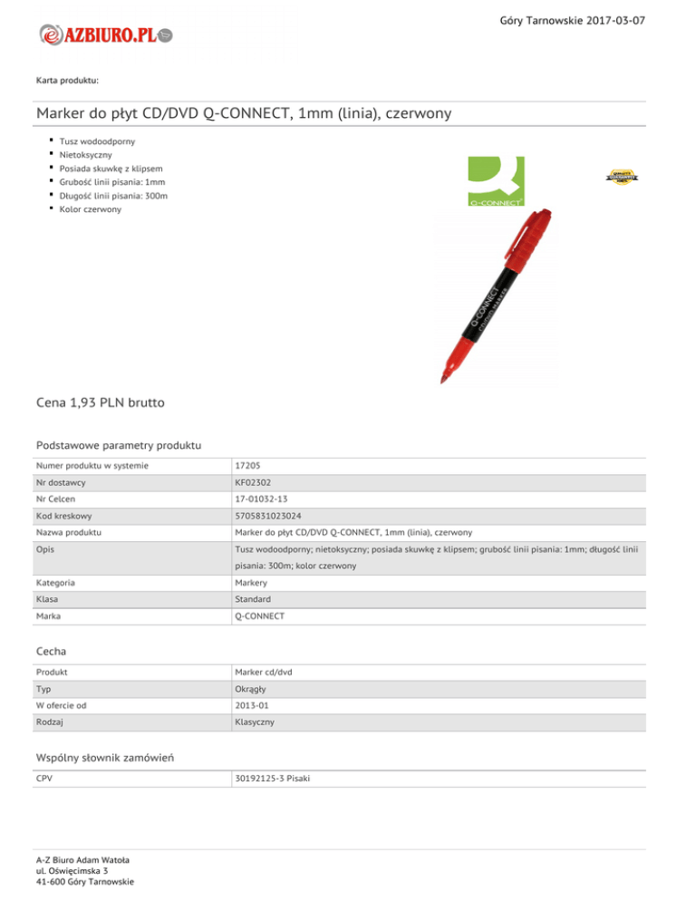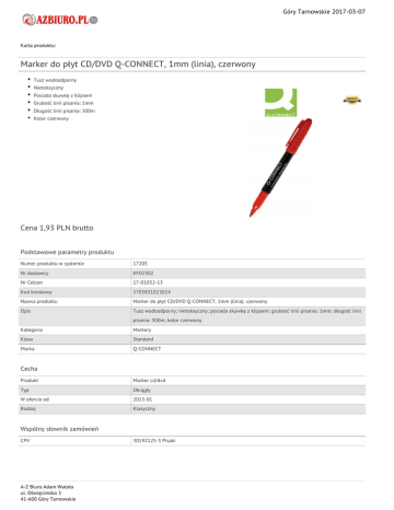 Góry Tarnowskie 2017-03-07 Karta produktu: Marker do płyt CD/DVD Q-CONNECT, 1mm (linia), czerwony Tusz wodoodporny Nietoksyczny Posiada skuwkę z klipsem Grubość linii pisania: 1mm Długość linii pisania: 300m Kolor czerwony Cena 1,93 PLN brutto Podstawowe parametry produktu Numer produktu w systemie 17205 Nr dostawcy KF02302 Nr Celcen 17-01032-13 Kod kreskowy 5705831023024 Nazwa produktu Marker do płyt CD/DVD Q-CONNECT, 1mm (linia), czerwony Opis Tusz wodoodporny; nietoksyczny; posiada skuwkę z klipsem; grubość linii pisania: 1mm; długość linii pisania: 300m; kolor czerwony Kategoria Markery Klasa Standard Marka Q-CONNECT Cecha Produkt Marker cd/dvd Typ Okrągły W ofercie od 2013-01 Rodzaj Klasyczny Wspólny słownik zamówień CPV A-Z Biuro Adam Watoła ul. Oświęcimska 3 41-600 Góry Tarnowskie 30192125-3 Pisaki Góry Tarnowskie 2017-03-07 Karta katalogowa produktu cd. Marker do płyt CD/DVD Q-CONNECT, 1mm (linia), czerwony Certyfikaty Nowy produkt w ofercie Standard Hit Standard Wymiary Końcówka (mm) 1 Dł. linii (m) 300 Grubość linii (mm) 1 Kolor Kolor Pozostałe zdjęcia produktu Serdecznie zapraszamy do współpracy A-Z Biuro Adam Watoła zespół. A-Z Biuro Adam Watoła ul. Oświęcimska 3 41-600 Góry Tarnowskie Czerwony
