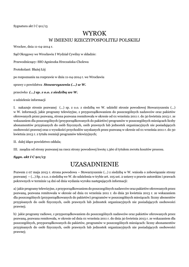 Sygnatura akt I C 911/13 WYROK W IMIENIU RZECZYPOSPOLITEJ POLSKIEJ Wrocław, dnia 11-04-2014 r. Sąd Okręgowy we Wrocławiu I Wydział Cywilny w składzie: Przewodniczący: SSO Agnieszka Hreczańska-Cholewa Protokolant: Błażej Łój po rozpoznaniu na rozprawie w dniu 11-04-2014 r. we Wrocławiu sprawy z powództwa Stowarzyszenia (...) w W. przeciwko (...) sp. z o.o. z siedzibą we W. o udzielenie informacji I. nakazuje stronie pozwanej (...) sp. z o.o. z siedzibą we W. udzielić stronie powodowej Stowarzyszeniu (...) w W. informacji, jakie programy telewizyjne, z przyporządkowaniem do poszczególnych nadawców oraz pakietów oferowanych przez pozwaną, strona pozwana reemitowała w okresie od 01 września 2011 r. do 30 kwietnia 2013 r. ze wskazaniem dla poszczególnych (przyporządkowanych do pakietów) programów w poszczególnych miesiącach liczby abonamentów przypisanych do osób fizycznych, osób prawnych lub jednostek organizacyjnych nie posiadających osobowości prawnej oraz o wysokości przychodów uzyskanych przez pozwaną w okresie od 01 września 2011 r. do 30 kwietnia 2013 r. z tytułu reemisji programów telewizyjnych; II. dalej idące powództwo oddala; III. zasądza od strony pozwanej na rzecz strony powodowej kwotę 1.360 zł tytułem zwrotu kosztów procesu. Sygn. akt I C 911/13 UZASADNIENIE Pozwem z 07 maja 2013 r. strona powodowa – Stowarzyszenie (...) z siedzibą w W. wniosła o zobowiązanie strony pozwanej – (...) Sp. z o.o. z siedzibą we W. do udzielenia w trybie art. 105 ust. 2 ustawy o prawie autorskim i prawach pokrewnych w terminie 14 dni od dnia wydania wyroku następujących informacji: a) jakie programy telewizyjne, z przyporządkowaniem do poszczególnych nadawców oraz pakietów oferowanych przez pozwaną, pozwana remitowała w okresie od dnia 01 września 2011 r. do dnia 30 kwietnia 2013 r. ze wskazaniem dla poszczególnych (przyporządkowanych do pakietów) programów w poszczególnych miesiącach: liczny abonentów przypisanych do osób fizycznych, osób prawnych lub jednostek organizacyjnych nie posiadających osobowości prawnej; b) jakie programy radiowe, z przyporządkowaniem do poszczególnych nadawców oraz pakietów oferowanych przez pozwaną, pozwana remitowała, w okresie od dnia 01 września 2011 r. do dnia 30 kwietnia 2013 r. ze wskazaniem dla poszczególnych, przyporządkowanych do pakietów, programów w poszczególnych miesiącach: liczny abonamentów przypisanych do osób fizycznych, osób prawnych lub jednostek organizacyjnych nie posiadających osobowości prawnej; c) o wysokości przychodów uzyskanych przez pozwaną w okresie od dnia 01 września 2011 r. do dnia 30 kwietnia 2013 r. z tytułu reemisji programów telewizyjnych i radiowych, o których mowa w lit. a i b. Ponadto strona powodowa wniosła o zasądzenia na jej rzecz kosztów postępowania w tym kosztów zastępstwa procesowego według norm przepisanych. W uzasadnieniu pozwu strona powodowa wskazała, że jest organizacją, która zbiorowo zarządza prawami artystów wykonawców utworów muzycznych i słowno-muzycznych na takich polach eksploatacji jak utrwalanie, zwielokrotnianie egzemplarzy artystycznych wykonań, reemitowanie. Pozwany jest operatorem sieci kablowych, oferującym w sposób profesjonalny na rynku usługi polegające na remitowaniu w sieciach kablowych programów radiowych i telewizyjnych, w ramach których eksploatowane są artystyczne wykonania artystów wykonawców reprezentowanych przez powoda. Działalność wykonywana przez pozwanego wypełnia dyspozycję art. 6 ust. 1 pkt 5 prawa autorskie, zgodnie z którym reemitowaniem utworu jest jego rozpowszechnianie przez inny podmiot niż pierwotnie nadający, drogą przejmowania w całości i bez zmian programu organizacji radiowej lub telewizyjnej oraz równoczesnego i integralnego przekazywania tego programu do powszechnego odbioru. Strona powodowa wskazywała, że pozwany, w ramach prowadzonej działalności dokonuje masowej eksploatacji artystycznych wykonań z repertuaru powoda na polu reemisji. Działalność na tym polu prowadzi od szeregu lat. Jak wynika z informacji widniejących na stronie internetowej pozwanej, w jej ofercie dostępne są programy telewizyjne nadawców polskich ((...), (...) (...)) oraz zagranicznych. Strona powodowa wyjaśniała, że w przeszłości strony łączyła umowa z dnia 01 października 2007 r., która w wyniku wypowiedzenia jej przez pozwaną wygasła. Do dnia 31 sierpnia 2011 r. ww. umowa regulowała zobowiązania wynikające z reemisji dokonywanej przez pozwaną. Obecnie eksploatacja ta ma charakter bezumowny. W następstwie wypowiedzenia umowy, powód podjął rozmowy celem uregulowania stanu bezumownej eksploatacji artystycznych wykonań ze swojego repertuaru. Pozwana odrzuciła jednak możliwość ugodowego rozwiązania zaistniałego sporu, ignorując przy tym wezwanie do przedstawienia informacji, zawarte w piśmie z dnia 18 czerwca 2012 r. Strona powodowa podkreślała, że w zakresie wykonywanej działalności, na podstawie art. 105 prawa autorskiego służy jej uprawnienie do domagania się uzyskania informacji oraz udostępnienia dokumentów niezbędnych do określenia wysokości dochodzonych wynagrodzeń i opłat. Powód zaznaczał, że nie zna ilości reemitowanych programów telewizyjnych i radiowych ani liczby abonamentów przypisanych do osób fizycznych, prawnych lub jednostek organizacyjnych nie posiadających osobowości prawnej. Z kolei są to niezbędne kryteria, na podstawie których może wyliczyć wysokość wynagrodzenia. Strona powodowa wskazywała, że do wyliczenia należnego jej wynagrodzenia konieczne jest oparcie się na Tabelach Stawek Wynagrodzeń Stowarzyszenia (...), zgodnie z którymi wysokość wynagrodzenia za reemisję zależna jest od liczby abonamentów, przy czym Tabele przewidują alternatywnie wysokość wynagrodzenia uzależnioną od wpływów pozwanej. Z uwagi na to, iż pozwana jest dysponentem informacji, któryc