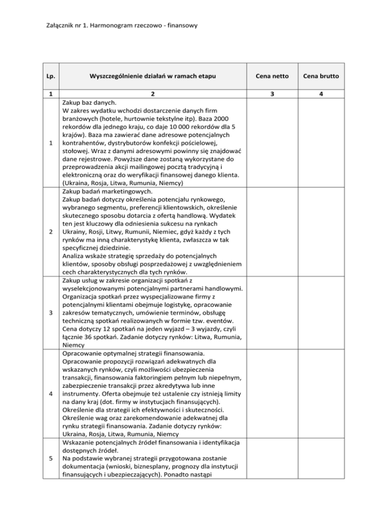 Załącznik nr 1. Harmonogram rzeczowo - finansowy Lp. Wyszczególnienie działań w ramach etapu Cena netto Cena brutto 1 2 3 4 1 2 3 4 5 Zakup baz danych. W zakres wydatku wchodzi dostarczenie danych firm branżowych (hotele, hurtownie tekstylne itp). Baza 2000 rekordów dla jednego kraju, co daje 10 000 rekordów dla 5 krajów). Baza ma zawierać dane adresowe potencjalnych kontrahentów, dystrybutorów konfekcji pościelowej, stołowej. Wraz z danymi adresowymi powinny się znajdować dane rejestrowe. Powyższe dane zostaną wykorzystane do przeprowadzenia akcji mailingowej pocztą tradycyjną i elektroniczną oraz do weryfikacji finansowej danego klienta. (Ukraina, Rosja, Litwa, Rumunia, Niemcy) Zakup badań marketingowych. Zakup badań dotyczy określenia potencjału rynkowego, wybranego segmentu, preferencji klientowskich, określenie skutecznego sposobu dotarcia z ofertą handlową. Wydatek ten jest kluczowy dla odniesienia sukcesu na rynkach Ukrainy, Rosji, Litwy, Rumunii, Niemiec, gdyż każdy z tych rynków ma inną charakterystykę klienta, zwłaszcza w tak specyficznej dziedzinie. Analiza wskaże strategię sprzedaży do potencjalnych klientów, sposoby obsługi posprzedażowej z uwzględnieniem cech charakterystycznych dla tych rynków. Zakup usług w zakresie organizacji spotkań z wyselekcjonowanymi potencjalnymi partnerami handlowymi. Organizacja spotkań przez wyspecjalizowane firmy z potencjalnymi klientami obejmuje logistykę, opracowanie zakresów tematycznych, umówienie terminów, obsługę techniczną spotkań realizowanych w formie tzw. eventów. Cena dotyczy 12 spotkań na jeden wyjazd – 3 wyjazdy, czyli łącznie 36 spotkań. Zadanie dotyczy rynków: Litwa, Rumunia, Niemcy Opracowanie optymalnej strategii finansowania. Opracowanie propozycji rozwiązań adekwatnych dla wskazanych rynków, czyli możliwości ubezpieczenia transakcji, finansowania faktoringiem pełnym lub niepełnym, zabezpieczenie transakcji przez akredytywa lub inne instrumenty. Oferta obejmuje też ustalenie czy istnieją limity na dany kraj (dot. firmy w instytucjach finansujących). Określenie dla strategii ich efektywności i skuteczności. Określenie wag oraz zarekomendowanie adekwatnej dla rynku strategii finansowania. Zadanie dotyczy rynków: Ukraina, Rosja, Litwa, Rumunia, Niemcy Wskazanie potencjalnych źródeł finansowania i identyfikacja dostępnych źródeł. Na podstawie wybranej strategii przygotowana zostanie dokumentacja (wnioski, biznesplany, prognozy dla instytucji finansujących i ubezpieczających). Ponadto nastąpi Załącznik nr 1. Harmonogram rzeczowo - finansowy 6 7 wskazanie optymalnego źródła finansowania, co wymaga złożenia dokumentacji do kilku instytucji finansujących i ubezpieczycieli. Zadanie dotyczy rynków: Ukraina, Rosja, Litwa, Rumunia, Niemcy Opracowanie strategii wprowadzenia nowych produktów na rynki docelowe, w tym: analiza cyklu życia produktu na wybranych rynkach docelowych, analiza wyglądu produktu pod kątem potrzeb wybranych rynków docelowych, analiza wyglądu i bezpieczeństwa produktu oraz opakowania. Opracowanie wizerunku przedsiębiorcy będzie adekwatne do charakterystyki i oczekiwań klientów na wybranych rynkach zagranicznych. W związku z tym, iż firma będzie rozwijać od podstaw sprzedaż musi podjąć działania budujące wizerunek przedsiębiorstwa oraz oferowanych produktów. Zadanie dotyczy rynków: Ukraina, Rosja, Litwa, Rumunia, Niemcy Organizacja misji gospodarczych przedsiębiorców zagranicznych u przedsiębiorcy (dla trzech osób reprezentujących jednego przedsiębiorcę zagranicznego). Zlecenie organizacji misji u przedsiębiorcy. Koszty obejmują organizację noclegu, pobytu oraz wypożyczenie samochodu z kierowcą. Liczba planowanych misji u przedsiębiorcy - 6. RAZEM -