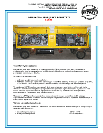 WOJSKOWE CENTRALNE BIURO KONSTRUKCYJNO - TECHNOLOGICZNE S.A. 00-908 WARSZAWA ul. Gen. Sylwestra KALISKIEGO 2 Tel. +48 22 683-94-91; Fax +48 22 666 81 62, +48 22 683 72 14 http://www.wcbkt.pl; e-mail: [email protected] LOTNISKOWA SPRĘŻARKA POWIETRZA LSP/N Charakterystyka urządzenia: Lotniskowa sprężarka powietrza na niskim podwoziu LSP/N przeznaczona jest do napełniania dystrybutorów sprężonego powietrza, butli lub innych zbiorników wysokociśnieniowych sprężonym powietrzem o ciśnieniu do 35MPa. W skład urządzenia wchodzą: • podwozie specjalne dwuosiowe z holem, • nadwozie zamknięte specjalne, zawierające wszystkie zespoły realizujące proces sprężania, oczyszczania, osuszania i wydawania powietrza oraz podstawowe wyposażenie obsługowe. W urządzeniu LSP/N zastosowane zostały dwie czterostopniowe sprężarki wysokiego ciśnienia chłodzone powietrzem i napędzane jednym silnikiem wysokoprężnym. Urządzenie wyposażone jest w dwa zbiorniki wysokociśnieniowe o pojemności 50 dm3 każdy, przeznaczone do napełniania, przechowywania i wydawania sprężonego powietrza. Urządzenie LSP/N przystosowane jest do transportu powietrznego samolotem An-26 lub jego odpowiednikiem oraz do holowania po lotniskowych drogach kołowania za pojazdem mechanicznym z maksymalną prędkością 20km/h . Warunki eksploatacji urządzenia: Lotniskowa sprężarka powietrza LSP/N może być eksploatowana w terenie odkrytym w następujących warunkach klimatycznych: • zakres temperatur pracy • maksymalna wilgotność -30°C ÷ +55°C 98% w temp +25°C WOJSKOWE CENTRALNE BIURO KONSTRUKCYJNO - TECHNOLOGICZNE S.A. 00-908 WARSZAWA ul. Gen. Sylwestra KALISKIEGO 2 Tel. +48 22 683-94-91; Fax +48 22 666 81 62, +48 22 683 72 14 http://www.wcbkt.pl; e-mail: [email protected] LOTNISKOWA SPRĘŻARKA POWIETRZA LSP/N Parametry wyjściowe urządzenia: Parametry instalacji powietrznej: • rodzaj gazu sprężone powietrze wg normy PN-91/L-01261 • max. ciśnienie wydawanego powietrza 35 MPa • max. temperatura wydawanego powietrza: +70°C • ”punkt rosy” wydawanego powietrza przy ciśnieniu 0,1 Mpa nie więcej niż -55°C • dokładność filtrowania 10µm • wydajność (dla ciśnienia wydawczego gazu 35 MPa i przy temperaturze otoczenia +20° C) • pojemność zbiorników wysokociśnieniowych • max. ciśnienie w zbiornikach wysokociśnieniowych • zapas powietrza w dwóch zbiornikach wysokociśnieniowych (dla 35MPa) 3 125 Nm /h 2x50 dm3 35MPa 35 Nm3 Ciśnienia robocze wydawanego powietrza: • 35 MPa • 23MPa • 15MPa Parametry zewnętrzne urządzenia: Wymiary: • długość (bez holu) • długość (z holem) • szerokość • wysokość 4000 mm 5885 mm 1860 mm 1565 mm Masa urządzenia: 3492 kg