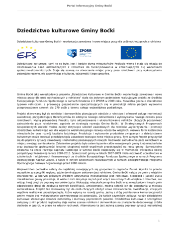 Portal Informacyjny Gminy Boćki Dziedzictwo kulturowe Gminy Boćki Dziedzictwo kulturowe Gminy Boćki - reorientacja zawodowa i nowe miejsca pracy dla osób odchodzących z rolnictwa Dziedzictwo kulturowe, czyli to co było, jest i będzie dumą mieszkańców Podlasia winno i staje się okazją do dostosowania osób odchodzących z rolnictwa do funkcjonowania w zmieniających się warunkach społeczno-ekonomicznych. Staje się szansą na utworzenie miejsc pracy poza rolnictwem przy wykorzystaniu potencjału regionu, nie zapominając o kulturze, tożsamości i jego specyfice. Gmina Boćki jako wnioskodawca projektu „Dziedzictwo Kulturowe w Gminie Boćki- reorientacja zawodowa i nowe miejsca pracy dla osób odchodzących z rolnictwa” stała się jedynym podmiotem realizującym projekt ze środków Europejskiego Funduszu Społecznego w ramach Działania 2.3 ZPORR w 2009 roku. Niewielka gmina o charakterze typowo rolniczym, z przewagą gospodarstw specjalizujących się w produkcji mleka podjęła wyzwanie przeprowadzenie szkoleń dla 270 osób z terenu całego województwa podlaskiego. Projekt skierowany był do rolników i domowników planujących odejście z rolnictwa i oferował usługę reorientacji zawodowej, przygotowującą Beneficjentów do zdobycia nowego zatrudnienia i wykonywania nowego zawodu poza rolnictwem. Myślą przewodnią Projektu było aktywizowanie i ukierunkowanie rolników chcących poszukiwać zatrudnienia poza rolnictwem, zgodnie ze strategią rozwoju Gminy Boćki. W Strategicznych Programach Gospodarczych znaleźć można zapisy dotyczące szkoleń zawodowych dla rolników ,wykorzystania i promocji dziedzictwa kulturowego wsi dla wsparcia wielofunkcyjnego rozwoju obszarów wiejskich, rozwoju form kształcenia mieszkańców oraz rozwój kapitału ludzkiego. Produkcja i wykonanie produktów związanych z dziedzictwem kulturowym może kreować przedsięwzięcia zawodowe tworzące nowe miejsca pracy. Tym samym Projekt przyczyniał się do poprawy sytuacji zawodowej i materialnej poszukujących nowych możliwości zatrudnienia poza rolnictwem w miejscu swojego zamieszkania. Założeniem projektu było zatem łączenie celów rozwojowych gminy i jej mieszkańców oraz budowanie społeczności lokalnej skupionej wokół wspólnych przedsięwzięć na rzecz gminy. Samodzielne działania na rzecz rozwoju kapitału ludzkiego w Gminie Boćki rozpoczęły się w momencie wdrożenia nowej perspektywy finansowej na lata 2007-2013. Społeczność gminy w latach 2007-2009 miała możliwość uczestnictwa w szkoleniach i inicjatywach finansowanych ze środków Europejskiego Funduszu Społecznego w ramach Programu Operacyjnego Kapitał Ludzki, a także w innych szkoleniach realizowanych w ramach Zintegrowanego Programu Operacyjnego Rozwoju Regionalnego przed 2008 rokiem. Województwo podlaskie należy do najsłabiej rozwijających się gospodarczo regionów Polski. Wynika to przede wszystkim za specyfiki regionu, gdzie dominującym sektorem jest rolnictwo. Gmina Boćki należy do gmin o wiejskim charakterze, w którym głównym źródłem utrzymania mieszkańców jest rolnictwo. Standard i jakość życia mieszkańców gminy powoduje, iż wielu z nich decyduje się lub jest wręcz zmuszonych do odejścia z rolnictwa, nie widząc innej drogi do poprawy warunków życia. Wskazując mieszkańcom gminy Boćki oraz mieszkańcom innych gmin odpowiednie drogi do zdobycia nowych kwalifikacji, umiejętności, można skłonić ich do pozostania w miejscu zamieszkania. Projekt ten skierowany był do osób chcących zdobyć nowe doświadczenia, kwalifikacje, chcących wspólnie realizować przedsięwzięcia, które wpłyną na rozwój gminy. Jedną z dróg podniesienia konkurencyjności gminy mogło być wykorzystanie wewnętrznego jej potencjału. Do takich czynników zaliczyć należy dziedzictwo kulturowe stanowiące dorobek materialny i duchowy poprzednich pokoleń. Dziedzictwo kulturowe a szczególnie związany z nim produkt regionalny daje realne szanse rolnikom i domownikom na znalezienie dodatkowego źródła dochodu w oparciu o prace na własny rachunek. Alternatywa ta jest jedyną szansą poprawy sytuacji materialnej 1 Portal Informacyjny Gminy Boćki rolników i domowników planujących odejście z rolnictwa i pozostanie tych osób w miejscu zamieszkania. Kultura oprócz tego, iż stanowi „korzenie” stanowi też „kapitał”, który można wykorzystać do rozwoju gospodarczego gminy. „Kapitał” ten jest często nadal niezauważany lub niszczony. Należy, zatem dostrzec to, co można jeszcze ocalić i co może stanowić atrakcję gminy. Mieszkańcy gminy są spadkobiercami bogatego dorobku kulturowego poprzednich pokoleń, na który składają się obyczaje, język, wyroby rękodzieła, stroje ludowe, potrawy tradycyjnej kuchni. Odmienność regionalna wiejskiej kultury materialnej i niematerialnej może stać się istotnym elementem rozwoju gminy, wpływając na zasobność jej mieszkańców i powodując zgodny z naturą rozwój gospodarczy obszarów wiejskich. Obecnie w wielu rejonach Polski dorobek kulturowy stanowi ważny element rozwoju turystyki wiejskiej a także jest czynnikiem sprzyjającym pełnieniu przez obszary wiejskie funkcji osiedleńczych. Istotne jest, aby w celu ochrony dziedzictwa kulturowego gminy zaktywizować mieszkańców do realizacji wspólnych przedsięwzięć. To z kolei wpłynie na pozostanie mieszkańców na wsi oraz na polepszenie warunków życia i wzrost dochodów, poprzez stworzenie nowych miejsc pracy. Ważne jest skierowanie odpowiedniego impulsu celem aktywizacji grup mieszkańców. Odbywać się to może m.in. poprzez skupienie środowiska lokalnego wokół pracowni kuchni regionalnej i pracowni stroju regionalnego . Samoaktywizacja mieszkańców polegać także może na samo- zatrudnieniu się poprzez nabycie umiejętności łączenia tradycyjnych zawodów tj. np. dekarz czy zdun z wytwarzaniem zarówno tradycyjnych jak i nowych pr