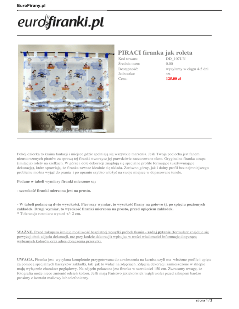 EuroFirany.pl PIRACI firanka jak roleta Kod towaru: Średnia ocen: Dostępność: Jednostka: Cena: DD_107UN 0.00 wysyłamy w ciągu 4-5 dni szt. 125.00 zł Pokój dziecka to kraina fantazji i miejsce gdzie spełniają się wszystkie marzenia. Jeśli Twoja pociecha jest fanem nieustarszonych piratów za sprawą tej firanki stworzysz jej prawdziwie zaczarowane okno. Oryginalna firanka atrapa (imitacja) rolety na szelkach. W górze i dole dekoracji znajdują się specjalne profile formujące (usztywniające dekorację), które sprawiają, że firanka zawsze idealnie się układa. Zarówno górny, jak i dolny profil bez najmniejszego problemu można wyjąć do prania i po upraniu szybko włożyć na swoje miejsce w dopasowane tunele. Podane w tabeli wymiary firanki mierzone są: - szerokość firanki mierzona jest na prosto. - W tabeli podane są dwie wysokości. Pierwszy wymiar, to wysokość firany na gotowo tj. po spięciu poziomych zakładek. Drugi wymiar, to wysokość firanki mierzona na prosto, przed upięciem zakładek. * Tolerancja rozmiaru wynosi +/- 2 cm. WAŻNE. Przed zakupem istnieje możliwość bezpłatnej wysyłki próbek tkanin - zadaj pytanie (formularz znajduje się powyżej obok zdjęcia dekoracji, tuż przy kodzie dekoracji) wpisując w treści wiadomości informację dotyczącą wybranych kolorów oraz adres doręczenia przesyłki. UWAGA. Firanka jest wysyłana kompletnie przygotowana do zawieszenia na karnisz czyli ma włożone profile i upięte za pomocą specjalnych haczyków zakładki, tak jak to widać na zdjęciach. Zdjęcia dekoracji zamieszczone w sklepie mają wyłącznie charakter poglądowy. Na zdjęciu pokazana jest firanka w szerokości 150 cm. Zwracamy uwagę, że fotografia może nieco zmienić odcień koloru. Jeśli mają Państwo jakiekolwiek wątpliwości przed zakupem bardzo prosimy o kontakt mailowy lub telefoniczny. strona 1 / 2 EuroFirany.pl Zamów przez telefon: 85 651 35 35 (poniedziałek-piątek w godz.10-18) Zamów mailem: [email protected] 24h Istnieje możliwość uszycia dekoracji wg. życzeń klienta. Zainteresowanych prosimy o kontakt w celu ustalenia indywidualnych szczegółów zamówienia i oferty. Informacja dotycząca sposobu konserwacji dekoracji: UWAGA ! Dozując proszek do prania należy zwracać uwagę na zalecane ilości, zgodnie ze stopniami zabrudzenia tekstyliów. Informację dotyczącą zalecanych ilości można znaleźć na każdym opakowaniu proszku do prania. strona 2 / 2 Powered by TCPDF (www.tcpdf.org)