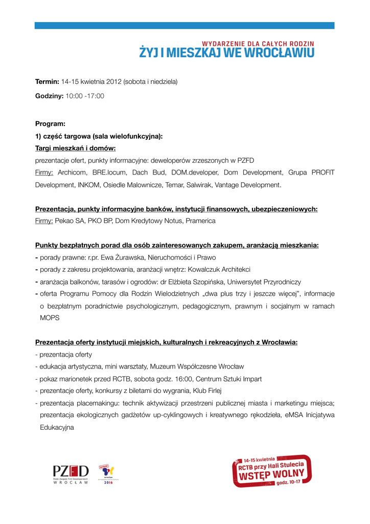 Termin: 14-15 kwietnia 2012 (sobota i niedziela) Godziny: 10:00 -17:00 Program: 1) część targowa (sala wielofunkcyjna): Targi mieszkań i domów: prezentacje ofert, punkty informacyjne: deweloperów zrzeszonych w PZFD Firmy: Archicom, BRE.locum, Dach Bud, DOM.developer, Dom Development, Grupa PROFIT Development, INKOM, Osiedle Malownicze, Temar, Salwirak, Vantage Development. Prezentacja, punkty informacyjne banków, instytucji finansowych, ubezpieczeniowych: Firmy: Pekao SA, PKO BP, Dom Kredytowy Notus, Pramerica Punkty bezpłatnych porad dla osób zainteresowanych zakupem, aranżacją mieszkania: - porady prawne: r.pr. Ewa Żurawska, Nieruchomości i Prawo - porady z zakresu projektowania, aranżacji wnętrz: Kowalczuk Architekci - aranżacja balkonów, tarasów i ogrodów: dr Elżbieta Szopińska, Uniwersytet Przyrodniczy - oferta Programu Pomocy dla Rodzin Wielodzietnych „dwa plus trzy i jeszcze więcej”, informacje o bezpłatnym poradnictwie psychologicznym, pedagogicznym, prawnym i socjalnym w ramach MOPS Prezentacja oferty instytucji miejskich, kulturalnych i rekreacyjnych z Wrocławia: - prezentacja oferty - edukacja artystyczna, mini warsztaty, Muzeum Współczesne Wrocław - pokaz marionetek przed RCTB, sobota godz. 16:00, Centrum Sztuki Impart - prezentacje oferty, konkursy z biletami do wygrania, Klub Firlej - prezentacja placemakingu: technik aktywizacji przestrzeni publicznej miasta i marketingu miejsca; prezentacja ekologicznych gadżetów up-cyklingowych i kreatywnego rękodzieła, eMSA Inicjatywa Edukacyjna Instytucje: Teatr Polski, Muzeum Narodowe, Muzeum Etnograficzne, Panorama Racławicka, Muzeum Współczesne, Miejski Ośrodek Pomocy Społecznej, CIRS - Młodzieżowe Centrum Informacji i Rozwoju, Wrocławianie na Polanie, Wrocław 360, Miejska Biblioteka Publiczna, Firlej, Wojskowa Komisja Uzupełnień, eMSA Inicjatywa Edukacyjna, ZOO Wrocław Oferta dla osób prowadzących aktywny tryb życia, oferta rekreacyjna miasta: - Firmy: AcTeam, DuoTrip, WKS Śląsk Wrocław - bezpłatna wypożyczalnia tandemów - turnieje FIFA 2012 na PlayStation 3 organizowane przez WKS Śląsk Wrocław - bezpłatne treningi Nordic Walking: Bezpłatny trening Nordic Walking dla Początkujących Sobota i Niedziela godz. 14 Gdzie: Pergola Każda osoba, która przyjdzie na trening dla początkujących otrzyma na czas treningu kije oraz zaproszenie- karnet na pierwszą lekcję Nordic Walking do szkoły Nordic Walking prowadzonej przez Acteam. Osoby, które nie zdążą się zapisać mejlowo ani telefonicznie, prosimy o przybycie do stoiska firmy Acteam, na pół godziny przed rozpoczęciem treningu. Bezpłatny trening Nordic Walking dla Zaawansowanych. Specjalna Edycja Wiosenna. Sobota i Niedziela, godz. 15 Gdzie: Pergola Zapisy: [email protected] oraz telefonicznie: 508 287 007 Punkt wydawania kijów: stoisko firmy Acteam Warsztaty i zabawy dla dzieci: - zabawa: Między Halą a Iglicą, Muzeum Narodowe - zajęcia dla dzieci: Muzeum Współczesne Wrocławia - głośne czytanie bajek, warsztaty plastyczne, zabawy ruchowe, Miejska Biblioteka Publiczna - Wrocław 360 - wirtualny space po Wrocławiu, zdjęcia panoramiczne najciekawszych miejsc Wrocławia Dodatkowo: prezentacja pojazdów wojskowych: Wystawcy: Wojskowa Komenda Uzupełnień: - możliwość zapoznania się propozycją służby w wojsku, min. służby przygotowawczej, Narodowych Sił Rezerwowych i szkolnictwa wojskowego - 12.00 – 15.00 Spotkania z przedstawicielem Stowarzyszenia Kombatantów Misji Pokojowych ONZ i Stowarzyszenia Rannych i Poszkodowanych w Misjach Poza Granicami Kraju Dodatkowo, przed RCTB: Sobota, 14 kwietnia 2012: 12.00 – 15.00 – pokaz sprzętu wojskowego z 10 Pułku Dowodzenia: - radiostacja na pojeździe terenowym Tarpan Hooker - wóz kablowy na pojeździe 12.00 – 15.00 – pokaz sprzętu historycznego z Twierdzy Wrocław, m.in.: Gaz 69, UAZ, Jeep, Motory M 72, ścigacze - namiot z gadżetami: kolorowanki, ulotki, długopisy, opaski odblaskowe 2) część wystawowa (foyer): Część organizowana przez Instytucję Kultury Wrocław 2016 - wystawa: galeria „Dom dla sztuki - sztuka dla domu”, której celem jest otwarcie przestrzeni naszych mieszkań - przestrzeni zwyczajnej, intymnej i codziennej - na piękno sztuki - warsztaty dla dzieci „kids dizajn”, pokazujące możliwości wykorzystania przedmiotów obecnych w naszym otoczeniu do zaprojektowania i wykonania np. elementów dekoracyjnych, zabawek i innych form - warsztaty dla dorosłych, na temat opłacalności inwestycji w sztukę, które poprowadzi przedstawiciel domu aukcyjnego Abbey House Wstęp wolny! Zapraszamy!