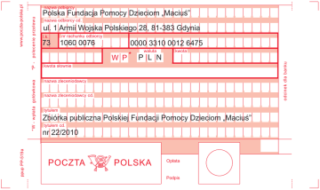 ppup PP-519a nazwa odbiorcy cd. ul. 1 Armii Wojska Polskiego 28, 81-383 Gdynia l.k. 73 nr rachunku odbiorcy 1060 0076 0000 3310 0012 6475 waluta W P* P L N kwota odcinek dla banku *P - polecenie przelewu *W - wpłata gotówkowa www.poczta-polska.pl nazwa odbiorcy Polska Fundacja Pomocy Dzieciom „Maciuś” kwota słownie nazwa zleceniodawcy nazwa zleceniodawcy cd. tytułem Zbiórka publiczna Polskiej Fundacji Pomocy Dzieciom „Maciuś” tytułem cd. nr 22/2010 POCZTA POLSKA Opłata Podpis nazwa odbiorcy cd. ul. 1 Armii Wojska Polskiego 28, 81-383 Gdynia l.k. 73 nr rachunku odbiorcy 1060 0076 0000 3310 0012 6475 waluta W P* P L N kwota kwota słownie nazwa zleceniodawcy nazwa zleceniodawcy cd. tytułem Zbiórka publiczna Polskiej Fundacji Pomocy Dzieciom „Maciuś” tytułem cd. nr 22/2010 POCZTA POLSKA Opłata Podpis odcinek dla posiadacza rachunku *P - polecenie przelewu *W - wpłata gotówkowa ppup PP-519a Wyprodukowano w 2003 r. Gwarantowana zdolność kopiowania 3 lata. nazwa odbiorcy Polska Fundacja Pomocy Dzieciom „Maciuś” nazwa odbiorcy cd. ul. 1 Armii Wojska Polskiego 28, 81-383 Gdynia l.k. 73 nr rachunku odbiorcy 1060 0076 0000 3310 0012 6475 waluta W P* P L N kwota odcinek dla poczty *P - polecenie przelewu *W - wpłata gotówkowa ppup PP-519a Wyprodukowano w 2003 r. Gwarantowana zdolność kopiowania 3 lata. nazwa odbiorcy Polska Fundacja Pomocy Dzieciom „Maciuś” kwota słownie nazwa zleceniodawcy nazwa zleceniodawcy cd. tytułem Zbiórka publiczna Polskiej Fundacji Pomocy Dzieciom „Maciuś” tytułem cd. nr 22/2010 POCZTA POLSKA Opłata Podpis nazwa odbiorcy cd. ul. 1 Armii Wojska Polskiego 28, 81-383 Gdynia l.k. 73 nr rachunku odbiorcy 1060 0076 0000 3310 0012 6475 waluta W P* P L N kwota odcinek dla wpłacającego *P - polecenie przelewu *W - wpłata gotówkowa ppup PP-519a Wyprodukowano w 2003 r. Gwarantowana zdolność kopiowania 3 lata. nazwa odbiorcy Polska Fundacja Pomocy Dzieciom „Maciuś” kwota słownie nazwa zleceniodawcy nazwa zleceniodawcy cd. tytułem Zbiórka publiczna Polskiej Fundacji Pomocy Dzieciom „Maciuś” tytułem cd. nr 22/2010 POCZTA POLSKA Opłata Podpis