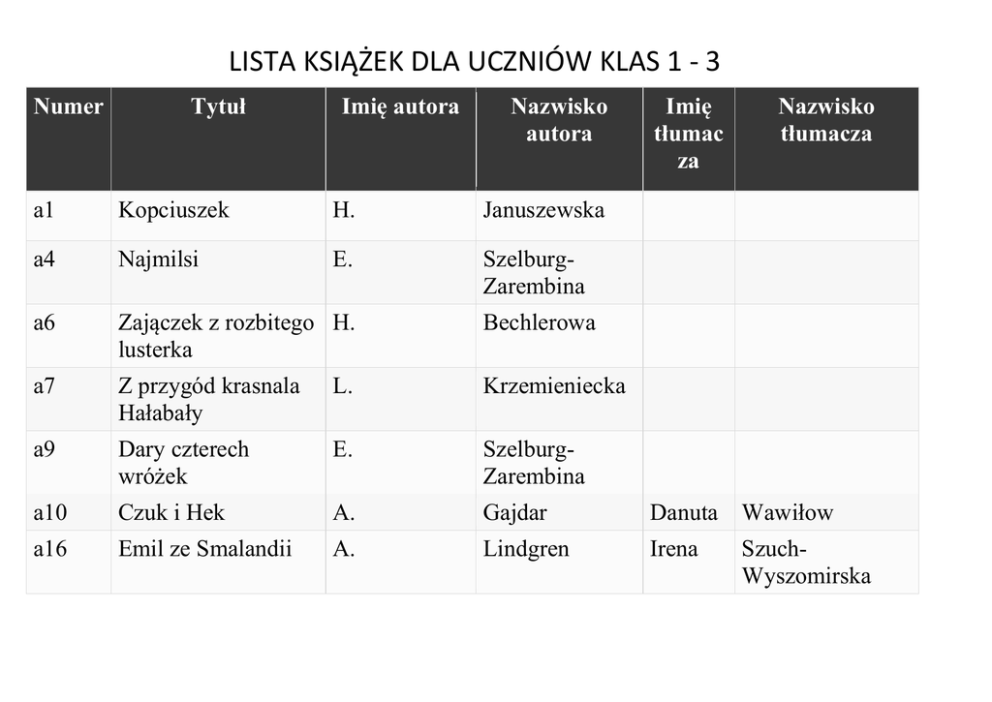 LISTA KSIĄŻEK DLA UCZNIÓW KLAS 1 - 3 Numer Tytuł Imię autora Nazwisko autora Imię tłumac za Nazwisko tłumacza a1 Kopciuszek H. Januszewska a4 Najmilsi E. SzelburgZarembina a6 Zajączek z rozbitego H. lusterka Bechlerowa a7 Z przygód krasnala Hałabały L. Krzemieniecka a9 Dary czterech wróżek E. SzelburgZarembina a10 Czuk i Hek A. Gajdar Danuta Wawiłow a16 Emil ze Smalandii A. Lindgren Irena SzuchWyszomirska LISTA KSIĄŻEK DLA UCZNIÓW KLAS 1 - 3 a22 Jak Wojtek został strażakiem Cz. Janczarski a23 Pilot i ja A. Bahdaj a24 Nie płacz koziołku S. Michałkow a25 Pippi Pończoszanka A. Lindgren a27 Anaruk chłopiec z Grenlandii Cz. Centkiewicz a28 Cudaczek Wyśmiewaczek J. Duszyńska a29 Dziecię elfów H.Ch. Andersen a30 Oto jest Kasia M. Jaworczakowa a38 O psie, który jeździł R. koleją a43 Afryka Kazika Ł. Wierzbicki a44 120 Przygód Kornel Marian Pisarski Irena SzuchWyszomirska Cecylia Niewiadomska LISTA KSIĄŻEK DLA UCZNIÓW KLAS 1 - 3 a45 Koziołka Matołka Makuszyński Walentynowicz Kuba i Buba czyli awantura do kwadratu Grzegorz Kasdepke
