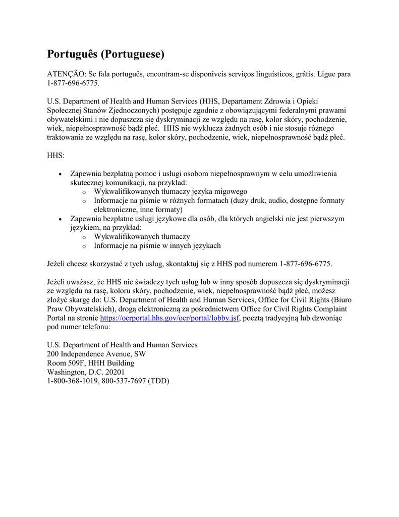 Português (Portuguese) ATENÇÃO: Se fala português, encontram-se disponíveis serviços linguísticos, grátis. Ligue para 1-877-696-6775. U.S. Department of Health and Human Services (HHS, Departament Zdrowia i Opieki Społecznej Stanów Zjednoczonych) postępuje zgodnie z obowiązującymi federalnymi prawami obywatelskimi i nie dopuszcza się dyskryminacji ze względu na rasę, kolor skóry, pochodzenie, wiek, niepełnosprawność bądź płeć. HHS nie wyklucza żadnych osób i nie stosuje różnego traktowania ze względu na rasę, kolor skóry, pochodzenie, wiek, niepełnosprawność bądź płeć. HHS: Zapewnia bezpłatną pomoc i usługi osobom niepełnosprawnym w celu umożliwienia skutecznej komunikacji, na przykład: o Wykwalifikowanych tłumaczy języka migowego o Informacje na piśmie w różnych formatach (duży druk, audio, dostępne formaty elektroniczne, inne formaty) Zapewnia bezpłatne usługi językowe dla osób, dla których angielski nie jest pierwszym językiem, na przykład: o Wykwalifikowanych tłumaczy o Informacje na piśmie w innych językach Jeżeli chcesz skorzystać z tych usług, skontaktuj się z HHS pod numerem 1-877-696-6775. Jeżeli uważasz, że HHS nie świadczy tych usług lub w inny sposób dopuszcza się dyskryminacji ze względu na rasę, koloru skóry, pochodzenie, wiek, niepełnosprawność bądź płeć, możesz złożyć skargę do: U.S. Department of Health and Human Services, Office for Civil Rights (Biuro Praw Obywatelskich), drogą elektroniczną za pośrednictwem Office for Civil Rights Complaint Portal na stronie https://ocrportal.hhs.gov/ocr/portal/lobby.jsf, pocztą tradycyjną lub dzwoniąc pod numer telefonu: U.S. Department of Health and Human Services 200 Independence Avenue, SW Room 509F, HHH Building Washington, D.C. 20201 1-800-368-1019, 800-537-7697 (TDD)