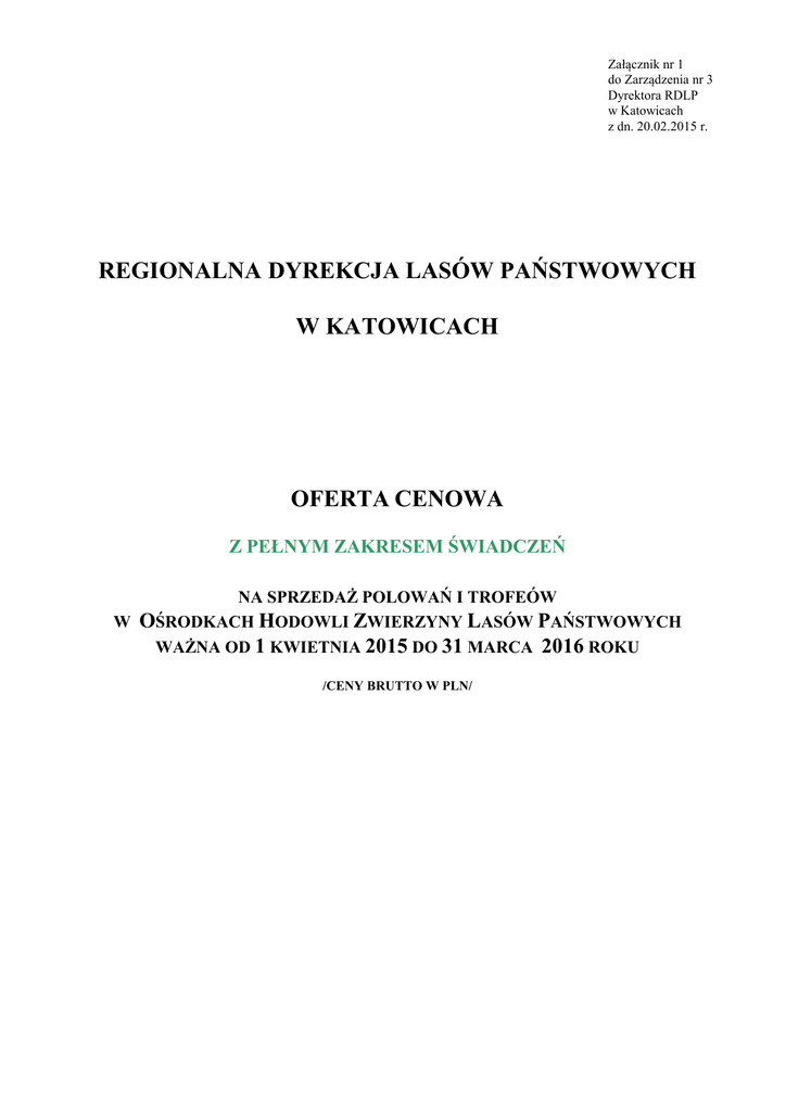 Załącznik nr 1 do Zarządzenia nr 3 Dyrektora RDLP w Katowicach z dn. 20.02.2015 r. REGIONALNA DYREKCJA LASÓW PAŃSTWOWYCH W KATOWICACH OFERTA CENOWA Z PEŁNYM ZAKRESEM ŚWIADCZEŃ NA SPRZEDAŻ POLOWAŃ I TROFEÓW W OŚRODKACH HODOWLI ZWIERZYNY LASÓW PAŃSTWOWYCH WAŻNA OD 1 KWIETNIA 2015 DO 31 MARCA 2016 ROKU /CENY BRUTTO W PLN/ SPIS TREŚCI I. ŚWIADCZENIA POBYTOWE STR. 2 II. USŁUGI TURYSTYCZNE – ORGANIZACJA POLOWAŃ STR. 2 III. ZWIERZYNA – TROFEA STR. 4 IV. OPUSTY I RABATY STR. 10 V. ŚWIADCZENIA DODATKOWE STR. 10 VI. UWAGI STR. 10 1 I. ŚWIADCZENIA POBYTOWE 1. Pobyt myśliwego lub osoby towarzyszącej /PKWiU 55/ VAT 8% Cenę ustala zarządca OHZ LP. II. USŁUGI TURYSTYCZNE – ORGANIZACJA POLOWAŃ 1. Ceny za organizację polowania /PKWiU 01.70.10.0/ VAT 23%: 1.1 Organizacja polowania indywidualnego Opłata obejmuje: - przygotowanie łowiska; - zapewnienie 1 podprowadzającego dla każdego myśliwego; - transport tuszy pozyskanej zwierzyny; - koszty opracowania dokumentacji. Cena wynosi od każdego myśliwego dziennie: na ptactwo, drapieżniki, dzikie króliki i piżmaki - 44,00 na pozostałą zwierzynę - 132,00 1.2 Organizacja polowania zbiorowego Opłata obejmuje: - przygotowania łowiska; - niezbędną liczbę naganiaczy oraz psów; - transport podczas polowania na terenie zarządzanym przez Nadleśnictwo organizujące polowanie; - posiłek w lesie; - pokot zwierzyny po polowaniu; - koszty opracowania dokumentacji. Cena wynosi od każdego myśliwego dziennie: 1.2.1 polowanie na zwierzynę grubą dla małych grup /do 9 myśliwych - 550,00 dla dużych grup /od 10 myśliwych - 460,00 1.2.2 polowanie na zwierzynę drobną (bażanty, dzikie kaczki, zające, inne) - 33,00 1.2.3 polowanie zbiorowe dla myśliwych krajowych w OHZ LP może odbywać się wyłącznie za zgodą Dyrektora RDLP. 2 2. Kwoty doliczane do organizacji polowania /PKWiU 01.70.10.0/ VAT 23%: 2.1 Za postrzelenie jelenia szlachetnego: jeleń byk jeleń łania, jeleń cielę - 415,00 122,00 - 443,00 122,00 - 415,00 122,00 - 208,00 51,00 - 84,00 2.2 Za postrzelenie jelenia sika: Jeleń sika byk jeleń sika łania lub cielę 2.3 Za postrzelenie daniela: daniel byk daniel łania lub cielę 2.4 Za postrzelenie sarny: sarna rogacz sarna koza lub koźlę 2.5 Za postrzelenie dzika: dzik (odyniec, warchlak, przelatek, wycinek, locha) 3. Sprzedaż pakietowa i ryczałtowa polowań Za zgodą Dyrektora RDLP - warunki uzgadniane będą indywidualnie i potwierdzone umową pomiędzy zarządcą OHZ LP a nabywcą polowania. 3 II. ZWIERZYNA – TROFEA 1 1. JELEŃ 1.1 Cena za pozyskane trofeum /PKWiU 10.11.60.0/ VAT 23%: 1.1.1 JELEŃ BYK Okres polowań na jelenia szlachetnego - od 21 sierpnia 2015 r. do końca lutego 2016 r. Trofeum - wieniec i grandle Cena za trofeum wg wagi wieńca wraz z czaszką, kością nosową i potyliczną oraz górną szczęką: do 2,00 kg (w tym szpicak) od 2,01 kg do 2,49 kg od 2,50 kg do 2,99 kg od 3,00 kg do 3,49 kg od 3,50 kg do 3,99 kg od 4,00 kg do 4,49 kg od 4,50 kg do 4,99 kg od 5,00 kg do 5,99 kg od 6,00 kg do 6,99 kg od 7,00 kg do 7,99 kg od 8,00 kg - 277,00 415,00 657,00 1 014,00 1 484,00 1 702,00 1 945,00 2 073,00 2 773,00 4 223,00 5 723,00 + 7,00 za każdy 0,01 kg powyżej 5 kg + 14,50 za każdy 0,01 kg powyżej 6 kg + 15,00 za każdy 0,01 kg powyżej 7 kg + 16,50 za każdy 0,01 kg powyżej 8 kg Kwota za trofeum zostanie powiększona o 50% w przypadku dokonania na polowaniu zbiorowym odstrzału nagannego jelenia byka (2 punkty czerwone wg kryteriów oceny prawidłowości odstrzału PZŁ). 1.1.2 JELEŃ ŁANIA Okres polowań - od 1 października 2015 r. do 15 stycznia 2016 r. Cena za trofeum - grandle, rapcie 31,00 1.1.3 JELEŃ CIELĘ Okres polowań – od 1 października 2015 r. do końca lutego 2016 r. Cena za trofeum - grandle, rapcie 31,00 1 Cena za trofeum zawiera koszty przygotowania trofeum do preparowania, koszty preparacji i przechowania oraz koszty wydania certyfikatu o miejscu pozyskania trofeum, jego wadze i wstępnej wycenie według formuły CIC. Certyfikat wydawany jest obligatoryjnie dla trofeów, które w trakcie wyceny wstępnej zakwalifikowane zostały jako trofea medalowe. W przypadku trofeów nie spełniających tych kryteriów, certyfikat może być wydany na prośbę myśliwego. 4 2. JELEŃ SIKA 2.1 Cena za pozyskane trofeum /PKWiU 10.11.60.0/ VAT 23%: 2.1.1 JELEŃ SIKA BYK Okres polowań - od 1 października 2015 r. do 15 stycznia 2016 r. Trofeum - poroże Cena za trofeum wg wagi wieńca wraz z czaszką, kością nosową i potyliczną oraz górną szczęką: do 1,49 kg (w tym szpicak) od 1,50 kg do 2,49 kg - od 2,50 kg - do 2,99 kg od 3,00 kg 443,00 777,00 + 4,00 za każde 0,01 kg powyżej 1,50 kg 1 177,00 + 6,50 za każde 0,01 kg powyżej 2,50 kg 1 502,00 + 8,00 za każde 0,01 kg powyżej 3,00 kg - 2.1.2 JELEŃ SIKA ŁANIA lub CIELĘ Okres polowań - od 1 października 2015 r. do 15 stycznia 2016 r. Cena za trofeum - grandle, rapcie 46,00 5 3. DANIEL 3.1 Cena za pozyskane trofeum /PKWiU 10.11.60.0/ VAT 23%: 3.1.1 DANIEL BYK Okres polowań - od 1 października 2015 r. do 31 stycznia 2016 r. Trofeum - poroże Cena za trofeum wg wagi łopat wraz z czaszką, kością nosową i potyliczną oraz górną szczęką: do 1,49 kg (w tym szpicak) od 1,50 kg do 2,49 kg - od 2,50 kg - do 2,99 kg od 3,00 kg 415,00 738,00 + 3,00 za każde 0,01 kg powyżej 1,50 kg 1 038,00 + 5,50 za każde 0,01 kg powyżej 2,50 kg 1 313,00 + 7,00 za każde 0,01 kg powyżej 3,00 kg - 3.1.2 DANIEL ŁANIA lub CIELĘ Okres polowań - od 1 października 2015 r. do 15 stycznia 2016 r. Cena za trofeum - grandle, rapcie: - 41,00 6 4. SARNA 4.1 Cena za pozyskane trofeum /PKWiU 10.11.60.0/ VAT 23%: 4.1.1 SARNA ROGACZ Okres polowań - od 11 maja 2015 r. do 30 września 2015 r. Trofeum - parostki Cena za trofeum wg wagi parostków wraz z czaszką, kością nosową i potyliczną oraz górną szczęką - po odjęciu 90 g do 149 g (w tym szpicak i guzikarz) 139,00 od 150 g do 199 g 208,00 od 200 g do 299 g 277,00 od 30