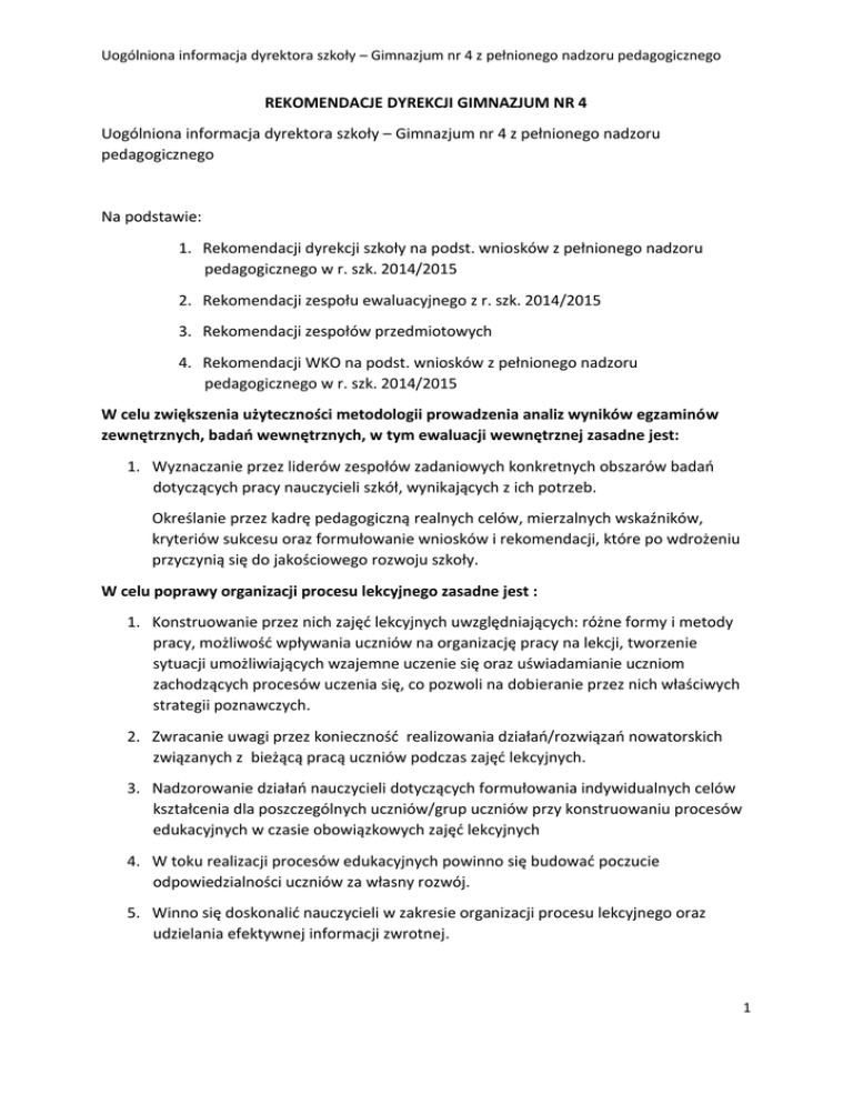Uogólniona informacja dyrektora szkoły – Gimnazjum nr 4 z pełnionego nadzoru pedagogicznego REKOMENDACJE DYREKCJI GIMNAZJUM NR 4 Uogólniona informacja dyrektora szkoły – Gimnazjum nr 4 z pełnionego nadzoru pedagogicznego Na podstawie: 1. Rekomendacji dyrekcji szkoły na podst. wniosków z pełnionego nadzoru pedagogicznego w r. szk. 2014/2015 2. Rekomendacji zespołu ewaluacyjnego z r. szk. 2014/2015 3. Rekomendacji zespołów przedmiotowych 4. Rekomendacji WKO na podst. wniosków z pełnionego nadzoru pedagogicznego w r. szk. 2014/2015 W celu zwiększenia użyteczności metodologii prowadzenia analiz wyników egzaminów zewnętrznych, badań wewnętrznych, w tym ewaluacji wewnętrznej zasadne jest: 1. Wyznaczanie przez liderów zespołów zadaniowych konkretnych obszarów badań dotyczących pracy nauczycieli szkół, wynikających z ich potrzeb. Określanie przez kadrę pedagogiczną realnych celów, mierzalnych wskaźników, kryteriów sukcesu oraz formułowanie wniosków i rekomendacji, które po wdrożeniu przyczynią się do jakościowego rozwoju szkoły. W celu poprawy organizacji procesu lekcyjnego zasadne jest : 1. Konstruowanie przez nich zajęć lekcyjnych uwzględniających: różne formy i metody pracy, możliwość wpływania uczniów na organizację pracy na lekcji, tworzenie sytuacji umożliwiających wzajemne uczenie się oraz uświadamianie uczniom zachodzących procesów uczenia się, co pozwoli na dobieranie przez nich właściwych strategii poznawczych. 2. Zwracanie uwagi przez konieczność realizowania działań/rozwiązań nowatorskich związanych z bieżącą pracą uczniów podczas zajęć lekcyjnych. 3. Nadzorowanie działań nauczycieli dotyczących formułowania indywidualnych celów kształcenia dla poszczególnych uczniów/grup uczniów przy konstruowaniu procesów edukacyjnych w czasie obowiązkowych zajęć lekcyjnych 4. W toku realizacji procesów edukacyjnych powinno się budować poczucie odpowiedzialności uczniów za własny rozwój. 5. Winno się doskonalić nauczycieli w zakresie organizacji procesu lekcyjnego oraz udzielania efektywnej informacji zwrotnej. 1 Uogólniona informacja dyrektora szkoły – Gimnazjum nr 4 z pełnionego nadzoru pedagogicznego W celu kształcenia umiejętności logicznego – matematycznego myślenia zasadne jest : 1. Kontrolowanie zamieszczania przez nauczycieli w planach kształcenia każdego przedmiotu sposobu kształcenia umiejętności logicznego myślenia, w tym umiejętność wykorzystania narzędzi matematyki i statystyki w życiu codziennym oraz formułowania sądów opartych na rozumowaniu matematycznym. 2. Sprawowanie skutecznego nadzoru pedagogicznego nad cyklicznym kształceniem umiejętności kluczowych, w tym myślenia matematycznego, oraz ich pogłębianiem i rozwijaniem. Pozostałe rekomendacje. Zasadne jest : 1. Realizowanie różnorodnych projektów edukacyjnych, w tym unijnych, w celu poszerzania horyzontów poznawczych oraz umiejętności kluczowych młodzieży szkolnej. 2. Kontynuowanie przez dyrektora, zespoły nauczycieli tworzenia oferty edukacyjnej szkoły uwzględniającej różnorodne potrzeby rozwojowe i zainteresowania uczniów oraz potrzeby zgłaszane przez rodziców. Wnioski z ewaluacji: 1. Należy uwzględnić w realizacji koncepcji pracy szkoły rozwój wszystkich uczniów. 2. Realizacja wniosków z analiz sprawdzianów zewnętrznych i innych diagnoz przeprowadzanych w szkole powinna dotyczyć przede wszystkim: - modyfikacji planów dydaktycznych, - dostosowania realizowanych programów do możliwości uczniów, zmiany metod prowadzenia zajęć oraz sposobów realizacji umiejętności słabo opanowanych przez uczniów, - zmiany prowadzenia zajęć dodatkowych dla uczniów z problemami edukacyjnymi. 3. Wszystkim dojeżdżającym uczniom należy zapewnić możliwość pełnego uczestniczenia w zajęciach pozalekcyjnych poprzez prawidłową organizację zajęć. 4. W drugim półroczu należy diagnozować stopień realizacji podstawy programowej u wszystkich uczniów. 5. Nauczyciele powinni podczas lekcji angażować do współpracy wszystkich uczniów. 6. W drugim półroczu należy przeprowadzić kontrolę w zakresie zaangażowania nauczycieli w pracę zespołów uczących w tym samym oddziale. 2 Uogólniona informacja dyrektora szkoły – Gimnazjum nr 4 z pełnionego nadzoru pedagogicznego WNIOSKI i REKOMENDACJE DYREKCJI GIMNAZJUM NR 4 Na podstawie pełnionego nadzoru pedagogicznego ustala się następujące wnioski i rekomendacje do realizacji w r. szk. 2015-2016. Zasadne jest, aby dokonać: 1. Modyfikacji kryteriów i wymagań przedmiotowych zgodnie z zapisami w statucie i WZO. 2. Przekazywać uczniom i ich rodzicom do 10 września szczegółowych wymagań przedmiotowych oraz kryteriów oceniania z poszczególnych przedmiotów oraz zachowania. 3. Dostosować wymagania przedmiotowe do możliwości i potrzeb uczniów z uwzględnieniem: orzeczeń i zaleceń PPP, sytuacji ucznia i jego możliwości poznawczych, modyfikacja IPET-ów, modyfikacja programów nauczania i zapisów w rozkładach nauczania zgodnie ze zmianami w prawie oświatowym. 4. Organizować procesy uczenia się, tak aby stwarzać możliwość wpływania uczniów na organizację pracy na zajęciach lekcyjnych poprzez tworzenie sytuacji umożliwiających wzajemne uczenie się uczniów oraz uświadamianie uczniom zachodzących procesów uczenia się. 5. Dokonywać diagnozy i formułowania indywidualnych celów kształcenia dla poszczególnych uczniów/grup uczniów przy konstruowaniu procesów edukacyjnych w czasie obowiązkowych zajęć lekcyjnych – w tym także z WF, muzyki, plastyki, techniki i informatyki. 6. Udzielać efektywnej informacji zwrotnej dla uczniów i rodziców. 7. Zamieszczać w planach nauczania – rozkładach materiału każdego przedmiotu sposobu kształcenia umiejętności logicznego myślenia, w tym umiejętność wykorzystania narzędzi matematyki i statystyki w życiu codziennym oraz form