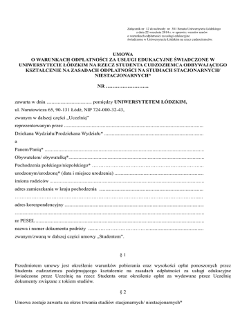 Załącznik nr 12 do uchwały nr 381 Senatu Uniwersytetu Łódzkiego z dnia 22 września 2014 r. w sprawie: wzorów umów o warunkach odpłatności za usługi edukacyjne świadczone w Uniwersytecie Łódzkim na rzecz cudzoziemców. UMOWA O WARUNKACH ODPŁATNOŚCI ZA USŁUGI EDUKACYJNE ŚWIADCZONE W UNIWERSYTECIE ŁÓDZKIM NA RZECZ STUDENTA CUDZOZIEMCA ODBYWAJĄCEGO KSZTAŁCENIE NA ZASADACH ODPŁATNOŚCI NA STUDIACH STACJONARNYCH/ NIESTACJONARNYCH* NR …………………….. zawarta w dniu .................................... pomiędzy UNIWERSYTETEM ŁÓDZKIM, ul. Narutowicza 65, 90-131 Łódź, NIP 724-000-32-43, zwanym w dalszej części „Uczelnią” reprezentowanym przez ............................................................................................................... Dziekana Wydziału/Prodziekana Wydziału* ............................................................................... a Panem/Panią* ............................................................................................................................... Obywatelem/ obywatelką*............................................................................................................ Pochodzenia polskiego/niepolskiego* ………………………………………………..………... urodzonym/urodzoną* (data i miejsce urodzenia) ....................................................................... imiona rodziców ........................................................................................................................... adres zamieszkania w kraju pochodzenia ................................................................................... ………………………………………………………………………………………………...... adres korespondencyjny ............................................................................................................... ....................................................................................................................................................... nr PESEL ...................................................................................................................................... nazwa i numer dokumentu podróży .......…………………………............................................. zwanym/zwaną w dalszej części umowy „Studentem”. §1 Przedmiotem umowy jest określenie warunków pobierania oraz wysokości opłat ponoszonych przez Studenta cudzoziemca podejmującego kształcenie na zasadach odpłatności za usługi edukacyjne świadczone przez Uczelnię na rzecz Studenta oraz określenie opłat za wydawane przez Uczelnię dokumenty związane z tokiem studiów. §2 Umowa zostaje zawarta na okres trwania studiów stacjonarnych/ niestacjonarnych* pierwszego stopnia/ drugiego stopnia/ jednolitych magisterskich* na Wydziale ................................................................................................................................. kierunek, specjalność ................................................................................................................... począwszy od roku akademickiego .............................................................................................. zwanych dalej studiami. §3 1. Student zobowiązuje się uiszczać na rzecz Uczelni opłaty za odpłatne usługi edukacyjne świadczone na jego rzecz oraz opłaty za wydawane przez Uczelnię dokumenty związane z tokiem studiów, określone w ustawie z dnia 27 lipca 2005 r. Prawo o szkolnictwie wyższym (t.j. Dz. U. z 2012 r. poz. 572 ze zm.), przepisach wykonawczych do ww. ustawy oraz przepisach wewnętrznych obowiązujących w Uczelni: a) ustaloną Zarządzeniem Rektora UŁ opłatę za kształcenie na studiach, o których mowa w § 2 w wysokości …………………………………. EURO za cały okres studiów. Opłata wnoszona jest jednorazowo za cały okres nauki, w terminie do dnia rozpoczęcia kształcenia lub przystąpienia do egzaminu. W uzasadnionych przypadkach rektor może przedłużyć termin wniesienia opłaty lub wyrazić zgodę na wniesienie opłat w ratach, odrębnie za każdy rok akademicki lub semestr nauki. b) przewidzianą w przepisach Rozporządzenia Ministra Nauki i Szkolnictwa Wyższego z dnia 12 października 2006 r. w sprawie podejmowania i odbywania przez cudzoziemców studiów i szkoleń oraz ich uczestniczenia w badaniach naukowych i pracach rozwojowych (Dz. U. Nr 164, poz. 1365, ze zm.), opłatę w wysokości 200 EURO pobieraną od cudzoziemców przyjmowanych na studia na zasadach odpłatności, c) opłatę za powtarzanie zajęć z powodu niezadawalających wyników w nauce, w tym za powtarzanie zajęć objętych zaliczeniem warunkowym w wysokości …………………………… zł d) opłatę za zajęcia nieobjęte planem studiów w wysokości …………………………………….. zł e) inne opłaty przewidziane przepisami prawa powszechnie obowiązującego, w tym opłatę za wydanie legitymacji studenckiej, indeksu, jeśli stanowi on na tym wydziale formę dokumentowania przebiegu studiów, dyplomu oraz ich duplikatów w wysokości przewidzianej w ww. przepisach lub w przepisach obowiązujących w Uniwersytecie Łódzkim, wydanych w celu wykonania przepisów powszechnie obowiązujących. 2. Suma opłat związanych z powtarzaniem zajęć z powodu niezadowalających wyników w nauce nie może być wyższa niż: na pierwszym semestrze / roku* - ................................................................…………………….zł , na drugim semestrze / roku* - ................................................................………………………..zł , na trzecim semestrze / roku* - ................................................................………………………..zł , na czwartym semestrze / roku* - ................................................................………………