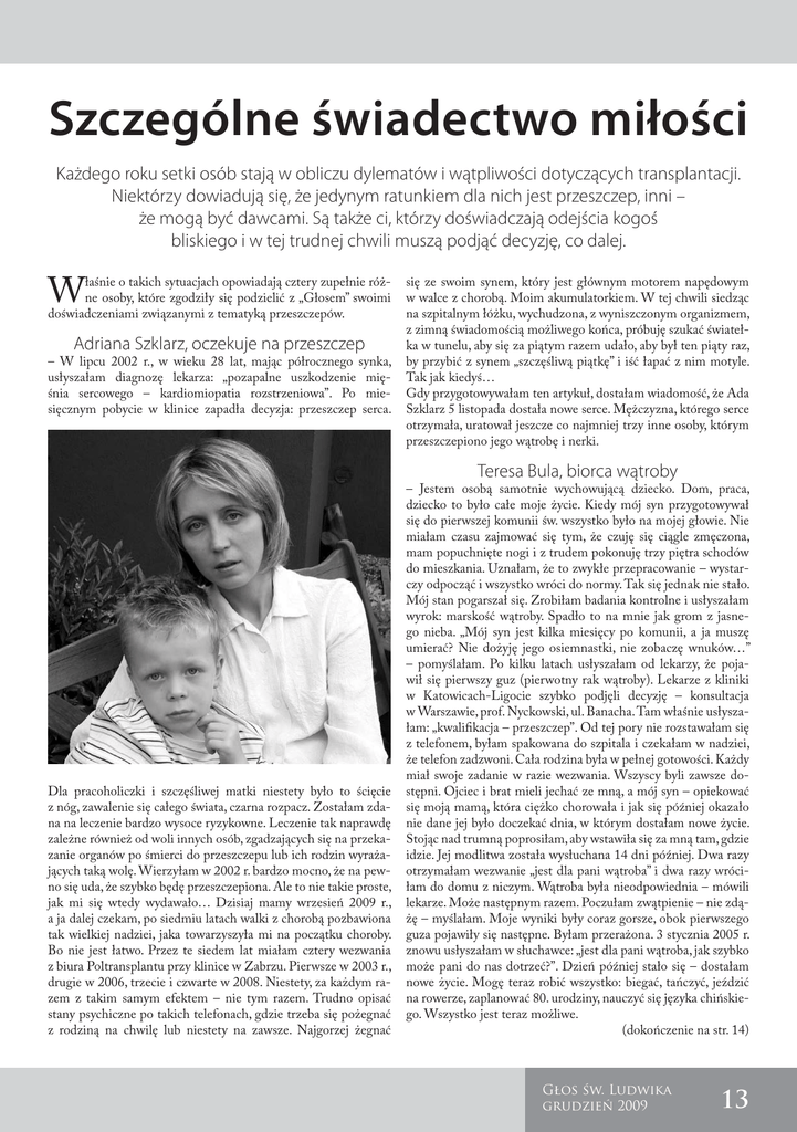 Szczególne świadectwo miłości Każdego roku setki osób stają w obliczu dylematów i wątpliwości dotyczących transplantacji. Niektórzy dowiadują się, że jedynym ratunkiem dla nich jest przeszczep, inni – że mogą być dawcami. Są także ci, którzy doświadczają odejścia kogoś bliskiego i w tej trudnej chwili muszą podjąć decyzję, co dalej. W łaśnie o takich sytuacjach opowiadają cztery zupełnie różne osoby, które zgodziły się podzielić z „Głosem” swoimi doświadczeniami związanymi z tematyką przeszczepów. Adriana Szklarz, oczekuje na przeszczep – W lipcu 2002 r., w wieku 28 lat, mając półrocznego synka, usłyszałam diagnozę lekarza: „pozapalne uszkodzenie mięśnia sercowego – kardiomiopatia rozstrzeniowa”. Po miesięcznym pobycie w klinice zapadła decyzja: przeszczep serca. się ze swoim synem, który jest głównym motorem napędowym w walce z chorobą. Moim akumulatorkiem. W tej chwili siedząc na szpitalnym łóżku, wychudzona, z wyniszczonym organizmem, z zimną świadomością możliwego końca, próbuję szukać światełka w tunelu, aby się za piątym razem udało, aby był ten piąty raz, by przybić z synem „szczęśliwą piątkę” i iść łapać z nim motyle. Tak jak kiedyś… Gdy przygotowywałam ten artykuł, dostałam wiadomość, że Ada Szklarz 5 listopada dostała nowe serce. Mężczyzna, którego serce otrzymała, uratował jeszcze co najmniej trzy inne osoby, którym przeszczepiono jego wątrobę i nerki. Teresa Bula, biorca wątroby Dla pracoholiczki i szczęśliwej matki niestety było to ścięcie z nóg, zawalenie się całego świata, czarna rozpacz. Zostałam zdana na leczenie bardzo wysoce ryzykowne. Leczenie tak naprawdę zależne również od woli innych osób, zgadzających się na przekazanie organów po śmierci do przeszczepu lub ich rodzin wyrażających taką wolę. Wierzyłam w 2002 r. bardzo mocno, że na pewno się uda, że szybko będę przeszczepiona. Ale to nie takie proste, jak mi się wtedy wydawało… Dzisiaj mamy wrzesień 2009 r., a ja dalej czekam, po siedmiu latach walki z chorobą pozbawiona tak wielkiej nadziei, jaka towarzyszyła mi na początku choroby. Bo nie jest łatwo. Przez te siedem lat miałam cztery wezwania z biura Poltransplantu przy klinice w Zabrzu. Pierwsze w 2003 r., drugie w 2006, trzecie i czwarte w 2008. Niestety, za każdym razem z takim samym efektem – nie tym razem. Trudno opisać stany psychiczne po takich telefonach, gdzie trzeba się pożegnać z rodziną na chwilę lub niestety na zawsze. Najgorzej żegnać – Jestem osobą samotnie wychowującą dziecko. Dom, praca, dziecko to było całe moje życie. Kiedy mój syn przygotowywał się do pierwszej komunii św. wszystko było na mojej głowie. Nie miałam czasu zajmować się tym, że czuję się ciągle zmęczona, mam popuchnięte nogi i z trudem pokonuję trzy piętra schodów do mieszkania. Uznałam, że to zwykłe przepracowanie – wystarczy odpocząć i wszystko wróci do normy. Tak się jednak nie stało. Mój stan pogarszał się. Zrobiłam badania kontrolne i usłyszałam wyrok: marskość wątroby. Spadło to na mnie jak grom z jasnego nieba. „Mój syn jest kilka miesięcy po komunii, a ja muszę umierać? Nie dożyję jego osiemnastki, nie zobaczę wnuków…” – pomyślałam. Po kilku latach usłyszałam od lekarzy, że pojawił się pierwszy guz (pierwotny rak wątroby). Lekarze z kliniki w Katowicach-Ligocie szybko podjęli decyzję – konsultacja w Warszawie, prof. Nyckowski, ul. Banacha. Tam właśnie usłyszałam: „kwalifikacja – przeszczep”. Od tej pory nie rozstawałam się z telefonem, byłam spakowana do szpitala i czekałam w nadziei, że telefon zadzwoni. Cała rodzina była w pełnej gotowości. Każdy miał swoje zadanie w razie wezwania. Wszyscy byli zawsze dostępni. Ojciec i brat mieli jechać ze mną, a mój syn – opiekować się moją mamą, która ciężko chorowała i jak się później okazało nie dane jej było doczekać dnia, w którym dostałam nowe życie. Stojąc nad trumną poprosiłam, aby wstawiła się za mną tam, gdzie idzie. Jej modlitwa została wysłuchana 14 dni później. Dwa razy otrzymałam wezwanie „jest dla pani wątroba” i dwa razy wróciłam do domu z niczym. Wątroba była nieodpowiednia – mówili lekarze. Może następnym razem. Poczułam zwątpienie – nie zdążę – myślałam. Moje wyniki były coraz gorsze, obok pierwszego guza pojawiły się następne. Byłam przerażona. 3 stycznia 2005 r. znowu usłyszałam w słuchawce: „jest dla pani wątroba, jak szybko może pani do nas dotrzeć?”. Dzień później stało się – dostałam nowe życie. Mogę teraz robić wszystko: biegać, tańczyć, jeździć na rowerze, zaplanować 80. urodziny, nauczyć się języka chińskiego. Wszystko jest teraz możliwe. (dokończenie na str. 14) Głos św. Ludwika grudzień 2009 13 ROZWAŻANIA WOKÓŁ NAS 6.01.2010 Uroczystość Objawienia Pańskiego (dokończenie ze str. 13) Iz 60,1-6 Ps 72 Ef 3,2-3a.5-6 Mt 2,1-12 P rzychodzący Mesjasz jest źródłem światłości w świecie rządzonym przez ciemność i grzech: „Ciemność okrywa ziemię i gęsty mrok spowija ludy, a ponad tobą jaśnieje Pan” (Iz 60,2). Wcielony Bóg ma moc jednoczenia wszystkich ludzi, do wszystkich bowiem przyszedł i za wszystkich umrze. Otwiera ludzkie serca i uzdalnia je do dobra i ofiarności (por. Iz 60, 6). Łaska zaś, jakiej udziela, owocuje oświeceniem i zrozumieniem przez Ducha Świętego. Odtąd każdy wierzący staje się współdziedzicem i współuczestnikiem Bożej obietnicy w Jezusie Chrystusie. Mając łaskę można oczami wiary dostrzec, że w tym małym dziecięciu, które objawiło się w Betlejem, zawiera się całość miłości Bożej. Zawiera się cały sens ludzkiego istnienia, wszystkie dzieje człowieka, który szukał utraconego Boga, a teraz Go odnajduje, a wraz z Nim szczęście i nadzieję życia wiecznego. Bóg objaw
