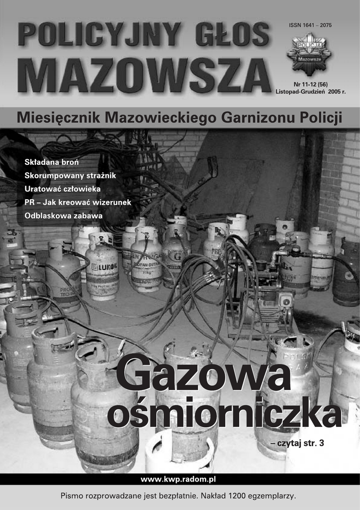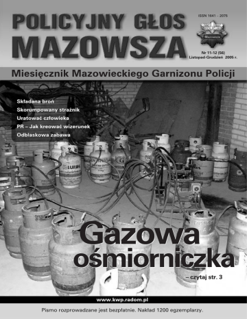 Foto: KPP Gostynin AKTUALNOŚCI Długa przerwa Święta Bożego Narodzenia to najpiękniejsza chwila w roku. Obecność najbliższych, spokój oraz magiczna chwila łamania się opłatkiem, wypełniają w tym dniu nasze serca niezwykłą radością. Życzę, wszystkim Policjantkom, Policjantom i Pracownikom Policji, aby nadchodzące dni przyniosły nie tylko wiele chwil spędzonych w ciepłej i rodzinnej atmosferze, ale i siłę oraz nadzieję na przyszłość. Niech ten wyjątkowy wieczór przyniesie Wam spokój, radość i zdrowie, a nadchodzący Nowy Rok 2006 niech będzie czasem pokoju oraz realizacji osobistych zamierzeń. nadinsp. Bogdan Klimek Komendant Wojewódzki Policji zs. w Radomiu Policjanci sekcji poszukiwawczej Wydziału Kryminalnego mazowieckiej KWP zatrzymali 31-letniego mężczyznę (Arkadiusza G.), który od kilku miesięcy ukrywał się przed wymiarem sprawiedliwości. Zatrzymany został w 1995 roku skazany wyrokiem Sądu Wojewódzkiego w Skierniewicach na karę 25 lat pozbawienia wolności za potrójne zabójstwo. W lipcu 2004 roku, decyzją sądu, Arkadiusz G. wyszedł na wolność na dziewięciomiesięczną przerwę w odbywaniu kary. W marcu 2005 r. mężczyzna nie wrócił jednak do ZK we Włocławku. Od tamtej pory był poszukiwany nakazem doprowadzenia wydanym przez sąd w Łodzi. Drodzy Policjanci, Policjantki, Pracownicy Policji Szanowni Państwo! Przeżyjemy jeszcze raz wydarzenie Nocy Betlejemskiej, która pogłębi naszą rodzinną więź. To wydarzenie zwiastowało nam radość wielką wyrażającą się w słowach „Chwała na wysokości Bogu, a na ziemi pokój ludziom dobrej woli”. W świątecznym nastroju pragniemy uzmysłowić sobie na nowo, że tymi słowami modlimy się podczas każdej Mszy Św. I wyrażamy głęboką prawdę, że każdy z nas żyje i służy ku większej Bożej chwale i pożytkowi bliźnich. Święta Bożego Narodzenia to czas wyjątkowej radości: Bóg przychodzi na Ziemię, włącza się w naszą powszedniość, staje się jednym z nas. Cóż więcej nam potrzeba? To nas napełnia radością, optymizmem i nadzieją. Ale smutne byłyby te Święta, gdyby Bóg nie narodził się w sercu człowieka. A nasz wieszcz narodowy Adam Mickiewicz pisze: „Chrystus narodził się w betlejemskim żłobie, ale biada Ci, gdyby nie narodził się w Tobie”. Moi drodzy! Życzę Wam, aby Chrystus na nowo narodził się w Waszych sercach, w Waszych rodzinach, w miejscu pracy i służbie. Z każdym z Was łamie się w dniu opłatkiem symbolem miłości, jedności i pokoju. Niech Nowy Rok, który przed nami, będzie obfity w Boże błogosławieństwo, zdrowie, wszelką pomyślność w życiu osobistym i rodzinnym. Szczęść Boże Ks. Mirosław Dragiel Kapelan Policji Garnizonu Mazowieckiego Radom, 6/7.12.2005r. – We wtorek 6.12 po godz. 14 do KMP Radom zgłosiła się kobieta, która poinformowała, że jej 15-letnia córka ze szkoły do której chodzi wyszła w towarzystwie starszego mężczyzny. Ustalono, że dziewczynka i jej 14-letnia koleżanka mogą przebywać w mieszkaniu przy ul. Wolanowskiej w towarzystwie dwóch mężczyzn (26 i 38 lat, mieszkańcy Radomia, notowani wcześniej za przestępstwa kryminalne). Policjanci próbowali wejść do mieszkania, jednak nie zostali wpuszczeni i zdecydowano się wezwać na miejsce jednostkę antyterrorystyczną KWP, której funkcjonariusze przy pomocy piły mechanicznej sforsowali drzwi ok. godz. 2 w nocy. W mieszkaniu było dwóch mężczyzn, obie dziewczynki oraz 12-letni syn jednego z mężczyzn. Ostrołęka, 05.12.2005, godz. 18:45 – Policjanci z KMP w Ostrołęce zatrzymali trzech nastolatków (15 i 16 lat), którzy przewrócili i przytrzymali 25 letnią kobietę, a następnie skradli jej torbę z telefonem komórkowym, pieniędzmi oraz butami sportowymi. Zatrzymani chłopcy zostali przekazani rodzicom. Ustalono również, że sprawcami zdarzenia byli jeszcze trzej nastoletni mieszkańcy Ostrołęki. 2 Pionki, powiat radomski, 3.12.2005, godz. 2:30 – Dwaj sprawcy usiłowali okraść z pieniędzy 43-letniego mężczyznę. Kiedy ten stawił im zdecydowany opór - uciekli. Poinformowani o zdarzeniu policjanci zatrzymali dwóch mieszkańców Pionek (18 i 22 l.) podejrzewanych o ten napad. Węgrów, 28.11.2005, godz. 10:00 – 63-letnia kobieta po odejściu od bankomatu została zaatakowana przez nieznanego mężczyznę, który usiłował ukraść jej torebkę. Kobieta zdołała się jednak obronić przed rozbojem. Sprawca uciekł, ale kilkanaście minut później został zatrzymany przez policyjny patrol i osadzony w PIDz. Zatrzymany to piętnastolatek, mieszkaniec powiatu węgrowskiego. Sadykierz, powiat Maków Maz. 26.11.2005, godz. 22:20 – Czterej nieznani sprawcy położyli na jezdni drewniany kloc, czym doprowadzili do zatrzymania się kierowcy Mercedesa. Samochodem podróżowali dwaj obywatele Litwy. Sprawcy zastraszyli mężczyzn i usiłowali ich okraść, zostali jednak spłoszeni przez nadjeżdżający radiowóz policyjny. Sprawcy nic nie skradli i zbiegli do pobliskiego lasu. Do zatrzymania poszukiwanego doszło 29 października w Sochaczewie, gdzie wynajmował mieszkanie. Mężczyzna został zatrzymany na ulicy, w pobliżu swojego miejsca zamieszkania. Podczas zatrzymania nie stawiał oporu. (tk) Ka w dziupli 23 października 2005 roku około południa policjanci z KPP w Ciechanowie i Rewiru Dzielnicowych w Sońsku weszli na teren prywatnej posesji należącej do 38 letniego mieszkańca Sarnowej Góry gm. Sońsk. W pomieszczeniach gospodarczych znaleziono samochód Ford Ka - skradziony z terenu KPP Żyrardów, Peugota 307 i części samochodów: Ford Fusjon, Honda Civic, Skoda Felicja, Ford Scorpio, pochodzące z aut kradzionych na terenie Warszawy i okolic. Mężczyzna został tymczasowo aresztowany. (goź) Radom, Ostrołęka, 29.11.2005, godz. 6:00 - Policjanci z ostrołęckiej sekcji Wydziału dw. z PG KWP zs. w Radomiu realizując czynności operacyjnośledcze w sprawie przyj