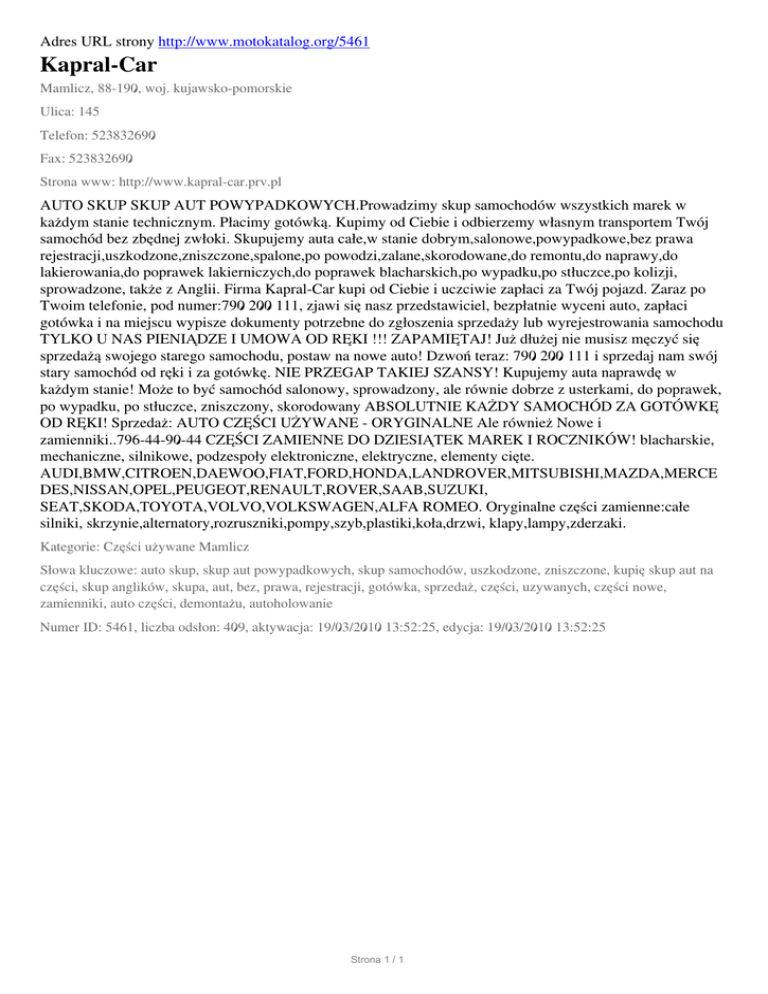 Adres URL strony http://www.motokatalog.org/5461 Kapral-Car Mamlicz, 88-190, woj. kujawsko-pomorskie Ulica: 145 Telefon: 523832690 Fax: 523832690 Strona www: http://www.kapral-car.prv.pl AUTO SKUP SKUP AUT POWYPADKOWYCH.Prowadzimy skup samochodów wszystkich marek w każdym stanie technicznym. Płacimy gotówką. Kupimy od Ciebie i odbierzemy własnym transportem Twój samochód bez zbędnej zwłoki. Skupujemy auta całe,w stanie dobrym,salonowe,powypadkowe,bez prawa rejestracji,uszkodzone,zniszczone,spalone,po powodzi,zalane,skorodowane,do remontu,do naprawy,do lakierowania,do poprawek lakierniczych,do poprawek blacharskich,po wypadku,po stłuczce,po kolizji, sprowadzone, także z Anglii. Firma Kapral-Car kupi od Ciebie i uczciwie zapłaci za Twój pojazd. Zaraz po Twoim telefonie, pod numer:790 200 111, zjawi się nasz przedstawiciel, bezpłatnie wyceni auto, zapłaci gotówka i na miejscu wypisze dokumenty potrzebne do zgłoszenia sprzedaży lub wyrejestrowania samochodu TYLKO U NAS PIENIĄDZE I UMOWA OD RĘKI !!! ZAPAMIĘTAJ! Już dłużej nie musisz męczyć się sprzedażą swojego starego samochodu, postaw na nowe auto! Dzwoń teraz: 790 200 111 i sprzedaj nam swój stary samochód od ręki i za gotówkę. NIE PRZEGAP TAKIEJ SZANSY! Kupujemy auta naprawdę w każdym stanie! Może to być samochód salonowy, sprowadzony, ale równie dobrze z usterkami, do poprawek, po wypadku, po stłuczce, zniszczony, skorodowany ABSOLUTNIE KAŻDY SAMOCHÓD ZA GOTÓWKĘ OD RĘKI! Sprzedaż: AUTO CZĘŚCI UŻYWANE - ORYGINALNE Ale również Nowe i zamienniki..796-44-90-44 CZĘŚCI ZAMIENNE DO DZIESIĄTEK MAREK I ROCZNIKÓW! blacharskie, mechaniczne, silnikowe, podzespoły elektroniczne, elektryczne, elementy cięte. AUDI,BMW,CITROEN,DAEWOO,FIAT,FORD,HONDA,LANDROVER,MITSUBISHI,MAZDA,MERCE DES,NISSAN,OPEL,PEUGEOT,RENAULT,ROVER,SAAB,SUZUKI, SEAT,SKODA,TOYOTA,VOLVO,VOLKSWAGEN,ALFA ROMEO. Oryginalne części zamienne:całe silniki, skrzynie,alternatory,rozruszniki,pompy,szyb,plastiki,koła,drzwi, klapy,lampy,zderzaki. Kategorie: Części używane Mamlicz Słowa kluczowe: auto skup, skup aut powypadkowych, skup samochodów, uszkodzone, zniszczone, kupię skup aut na części, skup anglików, skupa, aut, bez, prawa, rejestracji, gotówka, sprzedaż, części, uzywanych, części nowe, zamienniki, auto części, demontażu, autoholowanie Numer ID: 5461, liczba odsłon: 409, aktywacja: 19/03/2010 13:52:25, edycja: 19/03/2010 13:52:25 Strona 1 / 1