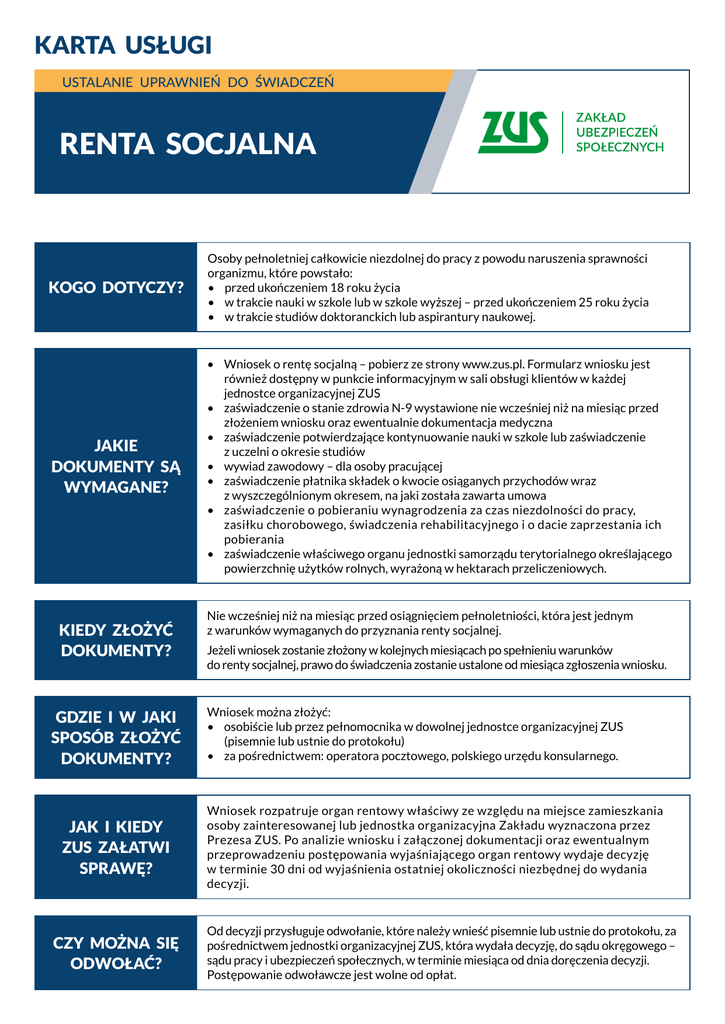 KARTA USŁUGI USTALANIE UPRAWNIEŃ DO ŚWIADCZEŃ RENTA SOCJALNA KOGO DOTYCZY? Osoby pełnoletniej całkowicie niezdolnej do pracy z powodu naruszenia sprawności organizmu, które powstało: • przed ukończeniem 18 roku życia • w trakcie nauki w szkole lub w szkole wyższej – przed ukończeniem 25 roku życia • w trakcie studiów doktoranckich lub aspirantury naukowej. JAKIE DOKUMENTY SĄ WYMAGANE? • Wniosek o rentę socjalną – pobierz ze strony www.zus.pl. Formularz wniosku jest również dostępny w punkcie informacyjnym w sali obsługi klientów w każdej jednostce organizacyjnej ZUS • zaświadczenie o stanie zdrowia N-9 wystawione nie wcześniej niż na miesiąc przed złożeniem wniosku oraz ewentualnie dokumentacja medyczna • zaświadczenie potwierdzające kontynuowanie nauki w szkole lub zaświadczenie z uczelni o okresie studiów • wywiad zawodowy – dla osoby pracującej • zaświadczenie płatnika składek o kwocie osiąganych przychodów wraz z wyszczególnionym okresem, na jaki została zawarta umowa • zaświadczenie o pobieraniu wynagrodzenia za czas niezdolności do pracy, zasiłku chorobowego, świadczenia rehabilitacyjnego i o dacie zaprzestania ich pobierania • zaświadczenie właściwego organu jednostki samorządu terytorialnego określającego powierzchnię użytków rolnych, wyrażoną w hektarach przeliczeniowych. KIEDY ZŁOŻYĆ DOKUMENTY? GDZIE I W JAKI SPOSÓB ZŁOŻYĆ DOKUMENTY? JAK I KIEDY ZUS ZAŁATWI SPRAWĘ? CZY MOŻNA SIĘ ODWOŁAĆ? Nie wcześniej niż na miesiąc przed osiągnięciem pełnoletniości, która jest jednym z warunków wymaganych do przyznania renty socjalnej. Jeżeli wniosek zostanie złożony w kolejnych miesiącach po spełnieniu warunków do renty socjalnej, prawo do świadczenia zostanie ustalone od miesiąca zgłoszenia wniosku. Wniosek można złożyć: • osobiście lub przez pełnomocnika w dowolnej jednostce organizacyjnej ZUS (pisemnie lub ustnie do protokołu) • za pośrednictwem: operatora pocztowego, polskiego urzędu konsularnego. Wniosek rozpatruje organ rentowy właściwy ze względu na miejsce zamieszkania osoby zainteresowanej lub jednostka organizacyjna Zakładu wyznaczona przez Prezesa ZUS. Po analizie wniosku i załączonej dokumentacji oraz ewentualnym przeprowadzeniu postępowania wyjaśniającego organ rentowy wydaje decyzję w terminie 30 dni od wyjaśnienia ostatniej okoliczności niezbędnej do wydania decyzji. Od decyzji przysługuje odwołanie, które należy wnieść pisemnie lub ustnie do protokołu, za pośrednictwem jednostki organizacyjnej ZUS, która wydała decyzję, do sądu okręgowego – sądu pracy i ubezpieczeń społecznych, w terminie miesiąca od dnia doręczenia decyzji. Postępowanie odwoławcze jest wolne od opłat. Osoba, która była uprawniona do renty socjalnej i której prawo do tej renty ustało w związku z osadzeniem w areszcie wskutek tymczasowego aresztowania lub w zakładzie karnym w celu odbycia kary pozbawienia wolności, może zgłosić wniosek o przyznanie renty socjalnej w wysokości 50% kwoty tej renty. W tym przypadku renta przysługuje tylko takiej osobie, która spełnia łącznie następujące warunki: • jest osobą samotnie gospodarującą • nie posiada innego przychodu • nie ma ustalonego prawa do renty rodzinnej • jest właścicielem lokalu mieszkalnego (domku jednorodzinnego) albo przysługuje jej spółdzielcze prawo do lokalu lub jest najemcą lokalu mieszkalnego wchodzącego w skład mieszkaniowego zasobu gminy, innych jednostek samorządu terytorialnego albo stanowiącego własność skarbu państwa lub państwowych osób prawnych oraz zobowiąże się pisemnie, że z kwoty tej renty będzie dokonywała opłat z tytułu czynszu lub innych należności za lokal mieszkalny (dom jednorodzinny), a w lokalu tym (domu jednorodzinnym) nie przebywają inne osoby. Nie dotyczy to osoby odbywającej karę pozbawienia wolności w systemie dozoru elektronicznego. INFORMACJE DODATKOWE Osoba mająca ustalone prawo do renty socjalnej oraz dyrektor aresztu śledczego lub zakładu karnego ma obowiązek powiadomić pisemnie właściwą jednostkę organizacyjną Zakładu lub organ emerytalno-rentowy o tymczasowym aresztowaniu lub odbywaniu kary pozbawienia wolności, podając datę osadzenia w areszcie lub datę rozpoczęcia odbywania kary pozbawienia wolności. Prawo do renty socjalnej zawiesza się za miesiąc, w którym zostały osiągnięte przychody: • z tytułu działalności podlegającej obowiązkowi ubezpieczenia społecznego • podlegające opodatkowaniu na zasadach określonych w ustawie o podatku dochodowym od osób fizycznych • z tytułu najmu, podnajmu, dzierżawy, poddzierżawy lub innych umów o podobnym charakterze, opodatkowanych na podstawie przepisów o zryczałtowanym podatku dochodowym od niektórych przychodów osiąganych przez osoby fizyczne w łącznej kwocie wyższej niż 70% przeciętnego miesięcznego wynagrodzenia za kwartał kalendarzowy ostatnio ogłoszonego przez Prezesa GUS do celów emerytalnych. Wniosek może zostać wycofany, jednakże nie później niż do dnia uprawomocnienia się decyzji organu rentowego, tj. w przypadku, gdy nie zostało złożone odwołanie do sądu – w terminie miesiąca od daty doręczenia decyzji. Przy załatwianiu formalności można skorzystać z pomocy pracowników ZUS: • w Centrum Obsługi Telefonicznej —— pod numerem telefonu 22 560 16 00 (opłata za połączenie jest zgodna z planem taryfikacyjnym danego operatora) —— za pośrednictwem e-maila [email protected] —— przez komunikator Skype na stronie www.zus.pl lub pod zus_centrum_obslugi_tel —— przez czat na stronie www.zus.pl konsultanci są dostępni w dni robocze: pon.– pt. w godz. 7.00–18.00 • w najbliższej jednostce organizacyjnej ZUS lub uzyskać informację na stronie internetowej www.zus.pl. PODSTAWA PRAWNA • Ustawa z dnia 27 czerwca 2003 r. o rencie socjalnej • Rozporządzenie Ministra G