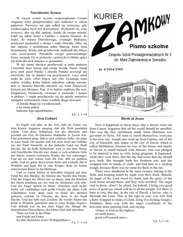 Narodzenie Jezusa W owym czasie wyszło rozporządzenie Cezara Augusta, żeby przeprowadzić spis ludności w całym państwie. Pierwszy ten spis odbył się wówczas, gdy wielkorządcą Syrii był Kwiryniusz. Wybierali się więc wszyscy, aby się dać zapisać, każdy do swego miasta. Udał się także Józef z Galilei, z miasta Nazaret, do Judei, do miasta Dawidowego, zwanego Betlejem, ponieważ pochodził z domu i rodu Dawida, żeby się dać zapisać z poślubioną sobie Maryją, która była brzemienna. Kiedy tam przebywali, nadszedł dla Maryi czas rozwiązania. Porodziła swego pierworodnego Syna, owinęła Go w pieluszki i położyła w żłobie, gdyż nie było dla nich miejsca w gospodzie. W tej samej okolicy przebywali w polu pasterze i trzymali straż nocną nad swoją trzodą. Naraz stanął przy nich anioł Pański i chwała Pańska zewsząd ich oświeciła, tak że bardzo się przestraszyli. Lecz anioł rzekł do nich: «Nie bójcie się! Oto zwiastuję wam radość wielką, która będzie udziałem całego narodu: dziś w mieście Dawida narodził się wam Zbawiciel, którym jest Mesjasz, Pan. A to będzie znakiem dla was: Znajdziecie Niemowlę, owinięte w pieluszki i leżące w żłobie». I nagle przyłączyło się do anioła mnóstwo zastępów niebieskich, które wielbiły Boga słowami: «Chwała Bogu na wysokościach, a na ziemi pokój ludziom Jego upodobania». Łk. 2, 1-14 Jesu Geburt Es begab sich aber zu der Zeit, daß ein Gebot von dem Kaiser Augustus ausging, daß alle Welt geschätzt würde. Und diese Schätzung war die allererste und geschah zur Zeit, da Quirinius Statthalter in Syrien war. Und jedermann ging, daß er sich schätzen ließe, ein jeder in seine Stadt. Da machte sich auf auch Josef aus Galiläa, aus der Stadt Nazareth, in das jüdische Land zur Stadt Davids, die da heißt Bethlehem, weil er aus dem Hause und Geschlechte Davids war, damit er sich schätzen ließe mit Maria, seinem vertrauten Weibe; die war schwanger. Und als sie dort waren, kam die Zeit, daß sie gebären sollte. Und sie gebar ihren ersten Sohn und wickelte ihn in Windeln und legte ihn in eine Krippe; denn sie hatten sonst keinen Raum in der Herberge. Und es waren Hirten in derselben Gegend auf dem Felde bei den Hürden, die hüteten des Nachts ihre Herde. Und der Engel des Herrn trat zu ihnen, und die Klarheit des Herrn leuchtete um sie; und sie fürchteten sich sehr. Und der Engel sprach zu ihnen: «Fürchtet euch nicht! Siehe, ich verkündige euch große Freude, die allem Volk widerfahren wird; denn euch ist heute der Heiland geboren, welcher ist Christus, der Herr, in der Stadt Davids. Und das habt zum Zeichen: ihr werdet finden das Kind in Windeln gewickelt und in einer Krippe liegen.» Und alsbald war da bei dem Engel die Menge der himmlischen Heerscharen, die lobten Gott und sprachen: « Ehre sei Gott in der Höhe und Friede auf Erden bei den Menschen seines Wohlgefallens.» Łk. 2, 1-14 Birth of Jesus Now it happened in those days, that a decree went out from Caesar Augustus that all the world should be enrolled. This was the first enrollment made when Quirinius was governor of Syria. All went to enroll themselves, everyone to his own city. Joseph also went up from Galilee, out of the city of Nazareth, into Judea, to the city of David, which is called Bethlehem, because he was of the house and family of David; to enroll himself with Miriam, who was pledged to be married to him as wife, being pregnant. It happened, while they were there, that the day had come that she should give birth. She brought forth her firstborn son, and she wrapped him in bands of cloth, and laid him in a feeding trough, because there was no room for them in the inn. There were shepherds in the same country staying in the field, and keeping watch by night over their flock. Behold, an angel of the Lord stood by them, and the glory of the Lord shone around them, and they were terrified. The angel said to them, «Don’t be afraid, for behold, I bring you good news of great joy which will be to all the people. For there is born to you, this day, in the city of David, a Savior, who is Messiah the Lord. This is the sign to you: you will find a baby wrapped in strips of cloth, lying in a feeding trough.» Suddenly, there was with the angel a multitude of the heavenly army praising God, and saying, «Glory to God in the highest, on earth peace, good will toward men.» Łk. 2, 1-14 2 „Kurier Zamkowy” nr 4/2004/2005 POTRAWY WIGILIJNE Piernik Składniki:50 dag mąki krupczatki, 25 dag pszczelego miodu, 12 dag masła roślinnego, 3 jajka, ½ szklanki cukru, 1,5 szklanki wody, czubata łyżeczka sody oczyszczonej, torebka przypraw do pierników, bakalie. Wlać do rondla wodę, dodać cukier, miód, tłuszcz i podgrzewając rozpuścić, następnie przestudzić, tak by roztwór był letni. Wsypać do makutry mąkę, sodę i przyprawę do pierników, wymieszać. Zrobić w środku dołek, do którego wlewać po trochu przygotowany roztwór lekko mieszając, następnie dodawać po jednym żółtku, a białka składać do salaterki. Dokładnie rozetrzeć ciasto, by nie było grudek, dodać ubite na piankę białka i bakalie. Blaszkę do ciasta wysmarować masłem roślinnym, wysypać mąką i wlać ciasto (powinno sięgać do połowy wysokości blaszki). Piec w piekarniku nagrzanym do temp. 170oC ok. 30 minut, a następnie sprawdzić – gdy ładnie rośnie i zaczyna się rumienić można wzmocnić płomień i dopiec jeszcze przez około 30 minut. Polewa czekoladowa Składniki:6 dag masła, 4 łyżki cukru, łyżka kakao, łyżka wody lub mleka. Wszystkie składniki razem wymieszać i zagotować na małym ogniu, mieszając, żeby się nie przypaliło. Po ostudzeniu polewać piernik. (Można posypać wiórkami kokosowymi lub migdałami sparzonymi, obranymi ze skórki i posiekanymi). Potrawka z królika w sosie cytrynowym Składniki: 2 przodki królicze, włoszczyzna z kapustą, 1 żółtko, szczypta mielonego 