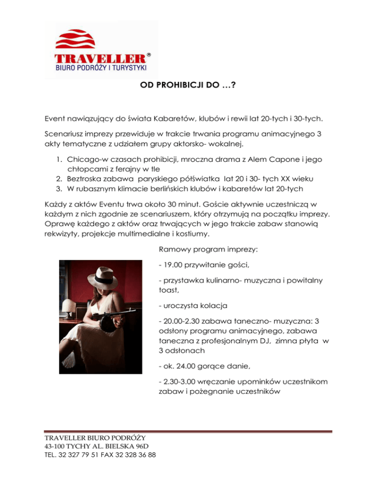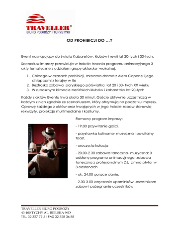 OD PROHIBICJI DO …? Event nawiązujący do świata Kabaretów, klubów i rewii lat 20-tych i 30-tych. Scenariusz imprezy przewiduje w trakcie trwania programu animacyjnego 3 akty tematyczne z udziałem grupy aktorsko- wokalnej. 1. Chicago-w czasach prohibicji, mroczna drama z Alem Capone i jego chłopcami z ferajny w tle 2. Beztroska zabawa paryskiego półświatka lat 20 i 30- tych XX wieku 3. W rubasznym klimacie berlińskich klubów i kabaretów lat 20-tych KaŜdy z aktów Eventu trwa około 30 minut. Goście aktywnie uczestniczą w kaŜdym z nich zgodnie ze scenariuszem, który otrzymują na początku imprezy. Oprawę kaŜdego z aktów oraz trwających w jego trakcie zabaw stanowią rekwizyty, projekcje multimedialne i kostiumy. Ramowy program imprezy: - 19.00 przywitanie gości, - przystawka kulinarno- muzyczna i powitalny toast, - uroczysta kolacja - 20.00-2.30 zabawa taneczno- muzyczna: 3 odsłony programu animacyjnego, zabawa taneczna z profesjonalnym DJ, zimna płyta w 3 odsłonach - ok. 24.00 gorące danie, - 2.30-3.00 wręczanie upominków uczestnikom zabaw i poŜegnanie uczestników TRAVELLER BIURO PODRÓŻY 43-100 TYCHY AL. BIELSKA 96D TEL. 32 327 79 51 FAX 32 328 36 88