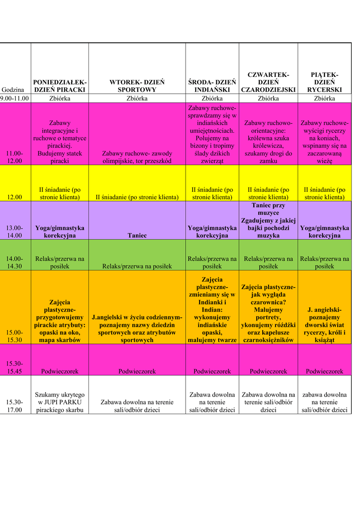 PONIEDZIAŁEKGodzina DZIEŃ PIRACKI 9.00-11.00 Zbiórka WTOREK- DZIEŃ SPORTOWY Zbiórka CZWARTEKPIĄTEKŚRODA- DZIEŃ DZIEŃ DZIEŃ INDIAŃSKI CZARODZIEJSKI RYCERSKI Zbiórka Zbiórka Zbiórka Zabawy ruchowesprawdzamy się w indiańskich Zabawy ruchowo- Zabawy ruchoweumiejętnościach. orientacyjne: wyścigi rycerzy Polujemy na królewna szuka na koniach, bizony i tropimy królewicza, wspinamy się na ślady dzikich szukamy drogi do zaczarowaną zwierząt zamku wieżę 11.0012.00 Zabawy integracyjne i ruchowe o tematyce pirackiej. Budujemy statek piracki 12.00 II śniadanie (po stronie klienta) II śniadanie (po stronie klienta) 13.0014.00 Yoga/gimnastyka korekcyjna Taniec 14.0014.30 Relaks/przerwa na posiłek Relaks/przerwa na posiłek 15.0015.30 Zajęcia plastyczneZajęcia plastycznezmieniamy się w jak wygląda Zajęcia Indianki i czarownica? plastyczneIndian: Malujemy przygotowujemy J.angielski w życiu codziennymwykonujemy portrety, pirackie atrybuty: poznajemy nazwy dziedzin indiańskie ykonujemy róźdźki opaski na oko, sportowych oraz atrybutów opaski, oraz kapelusze mapa skarbów sportowych malujemy twarze czarnoksiężników Zabawy ruchowe- zawody olimpijskie, tor przeszkód II śniadanie (po stronie klienta) II śniadanie (po II śniadanie (po stronie klienta) stronie klienta) Taniec przy muzyce Zgadujemy z jakiej Yoga/gimnastyka bajki pochodzi Yoga/gimnastyka korekcyjna muzyka korekcyjna Relaks/przerwa na posiłek Relaks/przerwa na posiłek Relaks/przerwa na posiłek J. angielskipoznajemy dworski świat rycerzy, króli i książąt 15.3015.45 Podwieczorek Podwieczorek Podwieczorek Podwieczorek Podwieczorek 15.3017.00 Szukamy ukrytego w JUPI PARKU pirackiego skarbu Zabawa dowolna na terenie sali/odbiór dzieci Zabawa dowolna na terenie sali/odbiór dzieci Zabawa dowolna na terenie sali/odbiór dzieci zabawa dowolna na terenie sali/odbiór dzieci 17.0018.00 Quiz- co wiesz o piratach? Pasowanie na pirata Pantomima- zgadnij jaki to sport! Indiańskie podchodytropimy skarb Quiz wiedzy o disneyowskich królewnach i księżniczkach Zajęcia edukacyjne połączone z quizem- jakimi cechami powinien odznaczać się rycerz