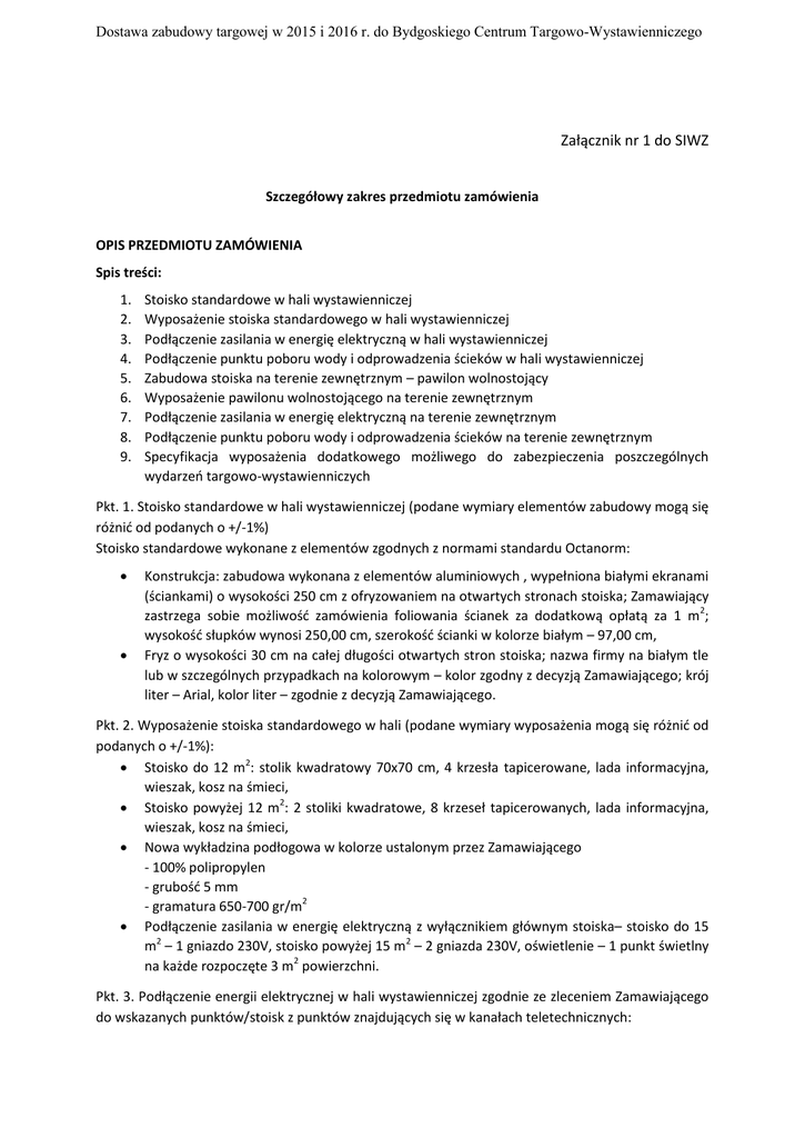 Dostawa zabudowy targowej w 2015 i 2016 r. do Bydgoskiego Centrum Targowo-Wystawienniczego Załącznik nr 1 do SIWZ Szczegółowy zakres przedmiotu zamówienia OPIS PRZEDMIOTU ZAMÓWIENIA Spis treści: 1. 2. 3. 4. 5. 6. 7. 8. 9. Stoisko standardowe w hali wystawienniczej Wyposażenie stoiska standardowego w hali wystawienniczej Podłączenie zasilania w energię elektryczną w hali wystawienniczej Podłączenie punktu poboru wody i odprowadzenia ścieków w hali wystawienniczej Zabudowa stoiska na terenie zewnętrznym – pawilon wolnostojący Wyposażenie pawilonu wolnostojącego na terenie zewnętrznym Podłączenie zasilania w energię elektryczną na terenie zewnętrznym Podłączenie punktu poboru wody i odprowadzenia ścieków na terenie zewnętrznym Specyfikacja wyposażenia dodatkowego możliwego do zabezpieczenia poszczególnych wydarzeń targowo-wystawienniczych Pkt. 1. Stoisko standardowe w hali wystawienniczej (podane wymiary elementów zabudowy mogą się różnić od podanych o +/-1%) Stoisko standardowe wykonane z elementów zgodnych z normami standardu Octanorm: Konstrukcja: zabudowa wykonana z elementów aluminiowych , wypełniona białymi ekranami (ściankami) o wysokości 250 cm z ofryzowaniem na otwartych stronach stoiska; Zamawiający zastrzega sobie możliwość zamówienia foliowania ścianek za dodatkową opłatą za 1 m 2; wysokość słupków wynosi 250,00 cm, szerokość ścianki w kolorze białym – 97,00 cm, Fryz o wysokości 30 cm na całej długości otwartych stron stoiska; nazwa firmy na białym tle lub w szczególnych przypadkach na kolorowym – kolor zgodny z decyzją Zamawiającego; krój liter – Arial, kolor liter – zgodnie z decyzją Zamawiającego. Pkt. 2. Wyposażenie stoiska standardowego w hali (podane wymiary wyposażenia mogą się różnić od podanych o +/-1%): Stoisko do 12 m2: stolik kwadratowy 70x70 cm, 4 krzesła tapicerowane, lada informacyjna, wieszak, kosz na śmieci, Stoisko powyżej 12 m2: 2 stoliki kwadratowe, 8 krzeseł tapicerowanych, lada informacyjna, wieszak, kosz na śmieci, Nowa wykładzina podłogowa w kolorze ustalonym przez Zamawiającego - 100% polipropylen - grubość 5 mm - gramatura 650-700 gr/m2 Podłączenie zasilania w energię elektryczną z wyłącznikiem głównym stoiska– stoisko do 15 m2 – 1 gniazdo 230V, stoisko powyżej 15 m2 – 2 gniazda 230V, oświetlenie – 1 punkt świetlny na każde rozpoczęte 3 m2 powierzchni. Pkt. 3. Podłączenie energii elektrycznej w hali wystawienniczej zgodnie ze zleceniem Zamawiającego do wskazanych punktów/stoisk z punktów znajdujących się w kanałach teletechnicznych: Dostawa zabudowy targowej w 2015 i 2016 r. do Bydgoskiego Centrum Targowo-Wystawienniczego 1-3 kW (zabezpieczenie 1x16A) 3-6 kW (zabezpieczenie 1x16A) 6-9 kW (zabezpieczenie 3x16A) 9-14 kW (zabezpieczenie 3x25A) 14-18 kW (zabezpieczenie 3x32A) Powyżej 18 kW (zabezpieczenie 3x63A) Podłączenie energii elektrycznej 24 h Pkt. 4. Podłączenie wskazanych punktów na hali do punktu poboru wody i punktu odprowadzania ścieków znajdujących się w kanałach teletechnicznych. Pkt. 5. Zabudowa stoiska na terenie zewnętrznym – pawilon wolnostojący (domek) w systemie oktagonalnym o powierzchni 9 m2 (3x3 m): ściany zewnętrzne (przynajmniej jedna ściana szklana, dach na całej powierzchni, sufit rastrowy, drzwi wejściowe zamykane na klucz, gniazdo elektryczne 230V. Konstrukcja aluminiowa z białymi ściankami o wysokości 250,00 cm oraz z fryzem. Nazwa firmy na fryzie: na białym tle; krój liter – Arial, kolor liter – zgodnie z decyzją Zamawiającego. Wykładzina podłogowa: - 100% polipropylen - grubość 5 mm - gramatura 657-700 gr/m2 Podane wymiary poszczególnych elementów mogą się różnić od podanych o +/-1%. Pkt. 6. Wyposażenie pawilonu wolnostojącego na terenie zewnętrznym (podane wymiary wyposażenia mogą się różnić od podanych o +/-1%): Instalacja elektryczna z wyłącznikiem głównym stoiska 2 gniazda wtykowe 230V Oświetlenie – 3 punkty świetlne Nowa wykładzina podłogowa w kolorze ustalonym przez Zamawiającego ułożona na odpowiednio wypoziomowanym podeście 1 stolik 70x70 cm, 4 krzesła składane, wieszak, kosz na śmieci Pkt. 7. Podłączenie zasilania w energię elektryczną na terenie zewnętrznym w punktach wskazanych przez Zamawiającego: 1-3 kW (zabezpieczenie 1x16A) 3-6 kW (zabezpieczenie 1x16A) 6-9 kW (zabezpieczenie 3x16A) 9-14 kW (zabezpieczenie 3x25A) 14-18 kW (zabezpieczenie 3x32A) Powyżej 18 kW (zabezpieczenie 3x63A) Zasilanie 24 h Pkt. 8. Podłączenie punktów poboru wody z hydrantów przeciwpożarowych wskazanych przez Zamawiającego i po otrzymaniu pisemnej zgody odpowiednich służb oraz punkty odprowadzenia ścieków na terenie zewnętrznym. Dostawa zabudowy targowej w 2015 i 2016 r. do Bydgoskiego Centrum Targowo-Wystawienniczego Pkt. 9. Wyposażenie dodatkowe możliwe do zabezpieczenia poszczególnych wydarzeń targowowystawienniczych: 1. Drzwi harmonijkowe 2. Ścianki działowe (np. do zbudowania zaplecza) 3. Foliowanie ścian (kolor wybrany przez Zamawiającego) 4. Stół okrągły (ø70 cm) 5. Stół kwadratowy (70x70 cm) 6. Stół barowy 7. Krzesło składane 8. Krzesło tapicerowane 9. Hocker 10. Stojak na prospekty 11. Dodatkowy punkt świetlny 12. Lodówka (min. 130 l.) 13. Komplet naczyń (dzbanek na wodę - 1 szt., szklanki do soku - 6 szt., szklanki do piwa - 6 szt., szklanki do drinków - 6 szt., kieliszki do koniaku - 6 szt., kieliszki do wódki - 6 szt., filiżanki z podstawkami - 6 szt., talerzyki deserowe - 6 szt., łyżeczki - 6 szt., miseczki - 2 szt., półmisek - 1 szt., taca - 1 szt., cukiernica - 1 szt.) 14. Czajnik bezprzewodowy 15. Szafka systemowa 16. Szafka z termą i zlewozmywakiem 17. Lada informacyjna 18. Lada łukowa 19. Podest ekspozycyjny 100x100x100 cm 20. Podest wzmocniony 21. Regał systemowy 22. Półka wisząca 23. Wentylator Wszystkie elementy zabudowy muszą posiadać atesty niezbędne dla użytkowani