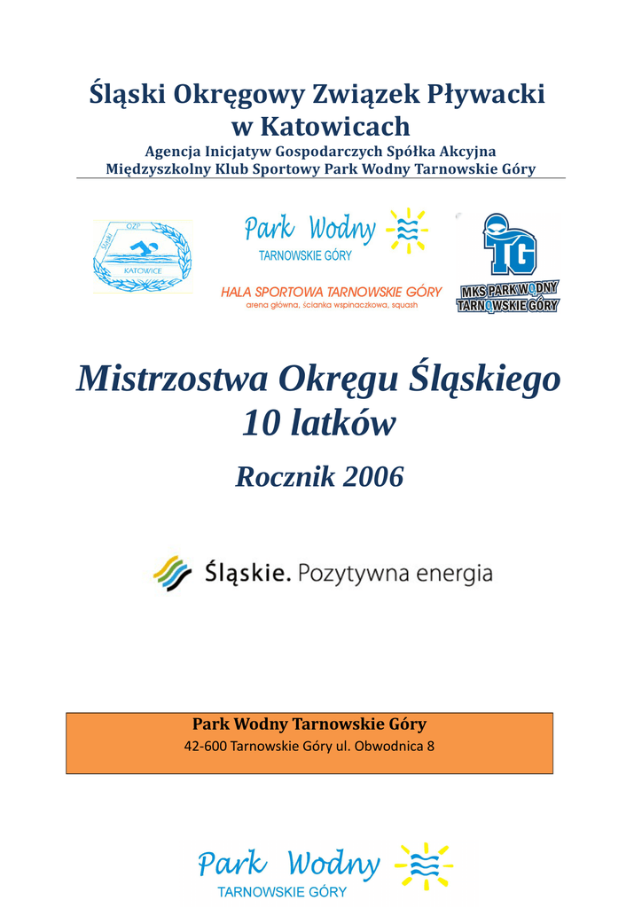 Śląski Okręgowy Związek Pływacki w Katowicach Agencja Inicjatyw Gospodarczych Spółka Akcyjna Międzyszkolny Klub Sportowy Park Wodny Tarnowskie Góry Mistrzostwa Okręgu Śląskiego 10 latków Rocznik 2006 Park Wodny Tarnowskie Góry 42-600 Tarnowskie Góry ul. Obwodnica 8 1.TERMIN ZAWODÓW: 16 grudnia 2016r I BLOK - Rozgrzewka 8.00 Starty 9.00 II BLOK – Rozgrzewka – do ustalenia Starty – do ustalenia 2. MIEJSCE ZAWODÓW: • Park Wodny Tarnowskie Góry ul. Obwodnica 8, 42-600 Tarnowskie Góry 3. INFORMACJE TECHNICZNE: • • • • Pływalnia 25m; 6 torów, temperatura wody: 27°C Pomiar czasu: ręczny, Zawody rozgrywane są zgodnie z przepisami FINA, PZP. Zawody rozgrywane są seriami na czas od najsłabszej do najmocniejszej wg nadesłanych czasów zgłoszeń. 4. ORGANIZATORZY: • • Na zlecenie Śląskiego Okręgowego Związku Pływackiego: Agencja Inicjatyw Gospodarczych S.A. MKS Park Wodny Tarnowskie Góry 5. KIEROWNICTWO ZAWODÓW: • Komisja sędziowska, komisja odwoławcza. 6. ZASADY FINANSOWANIA: • • • • • Koszty organizacyjne pokrywa Śląski Okręgowy Związek Pływacki Uczestnicy przyjeżdżają na koszt własny Obligatoryjna opłata za komunikat 20 zł od zgłoszonego klubu Opłata startowa wynosi 10 zł od osobo startu oraz 10 zł od zgłoszonego zespołu sztafetowego. Ewentualne skreślenia, bez ponoszenia opłaty startowej, możliwe do 13.12.2016 r. (wtorek) godz. 10.00 7. ZASADY UCZESTNICTWA: • • • • • W zawodach mogą uczestniczyć zawodnicy urodzeni w 2006r , zgłoszeni przez kluby zrzeszone w Śląskim Okręgowym Związku Pływackim, posiadający numery kodowe nadane przez PZP. Każdy zawodnik ma prawo startu w 2 konkurencjach indywidualnych i sztafecie w każdym bloku zawodów. Wszyscy zgłoszeni zawodnicy muszą być zarejestrowani w PZP i posiadać numery licencji. Wszyscy zgłoszeni zawodnicy zobowiązani są do posiadania badań lekarskich (krat sportowca), za ich posiadanie odpowiedzialni są trenerzy lub opiekunowie ekip. Wszyscy uczestnicy zobowiązani są do posiadania ubezpieczenia. 8. ZGŁOSZENIA DO ZAWODÓW: • • • • Zaproszenie do pobrania ze strony: www.megatiming.pl Zgłoszenie musi zawierać: imię i nazwisko zawodnika, pełną datę urodzenia (DD/MM/RRRR), nazwę klubu, numer licencji PZP (bez numeru licencji wyniki zawodnika nie będą wysyłane na ranking europejski), konkurencję wraz z najlepszym wynikiem zawodnika na danym dystansie uzyskanym w ostatnich 12-tu miesiącach. Zawodnicy bez numeru licencji nie będą wysyłani na ranking europejski. Każdy zawodnik musi posiadać licencje PZP oraz aktualne badania lekarskie do weryfikacji organizatora zawodów. Zgłoszenia prosimy kierować na adres: [email protected] – każde zgłoszenie będzie potwierdzone e-mailem zwrotnym w razie braku potwierdzenia proszę o kontakt: Łukasz Widzik 660-749-175 Termin zgłoszeń: 11.12.2016r. do godz. 18.00 – skreślenia do 13.12.2016 r. godz. 10.00 9. WYNIKI: • Publikowane będą na stronach: www.megatiming.pl 10. PROGRAM ZAWODÓW: 1. 3. 5. 7. 9. Blok I – Rozgrzewka 8.00 Dziewczęta, 8.25 Chłopcy Starty – 9.00 Dziewczyny Chłopcy 50 stylem dowolny 2. 50 stylem dowolny 100 stylem klasyczny 4. 100 stylem klasyczny 50 stylem motylkowym 6. 50 stylem motylkowym 100 stylem grzbietowym 8. 100 stylem grzbietowym 4x50 stylem dowolnym 10. 4x50 stylem dowolnym Blok II – Rozgrzewka do ustalenia Starty – do ustalenia 11. 13. 15. 17. 19. Dziewczyny 50 stylem grzbietowym 100 stylem zmiennym 50 stylem klasycznym 100 stylem dowolnym 4x50 stylem zmiennym 12. 14. 16. 18. 20. Chłopcy 50 stylem grzbietowym 100 stylem zmiennym 50 stylem klasycznym 100 stylem dowolnym 4x50 stylem zmiennym 11. NAGRODY • • Dyplomy i Medale za 3 pierwsze miejsca w każdej konkurencji Statuetka dla najlepszego zawodnika za 2 starty wg FINA 13. POSTANOWIENIA KOŃCOWE: • • • W sprawach nie objętych komunikatem lub Regulaminem Imprez PZP decyduje naczelnik i sędzia główny zawodów. Nie dopuszcza się startów poza konkurencją. Podczas imprezy wszystkich uczestników i kibiców obowiązuje regulamin obiektu. 15. Wyżywienie • • Rezerwacji obiadów dla zawodników można dokonywać bezpośrednio w Restauracji Kura Domowa (na 1 piętrze pływalni), adres mailowy [email protected] , lub pod numerem telefonu +48 502-877-535 (Pani Katarzyna Stachura). Zgłoszenia obiadów do dnia 13.12.2016 do godziny 10:00. 14. Kontakt z organizatorem • • Sprawy organizacyjne: Tomasz Pąchalski Tel. 600-365-944 Zgłoszenia, lista startowa, wyniki : Łukasz Widzik Tel. 660-749-175 Zapraszamy do Parku Wodnego w Tarnowskich Górach!