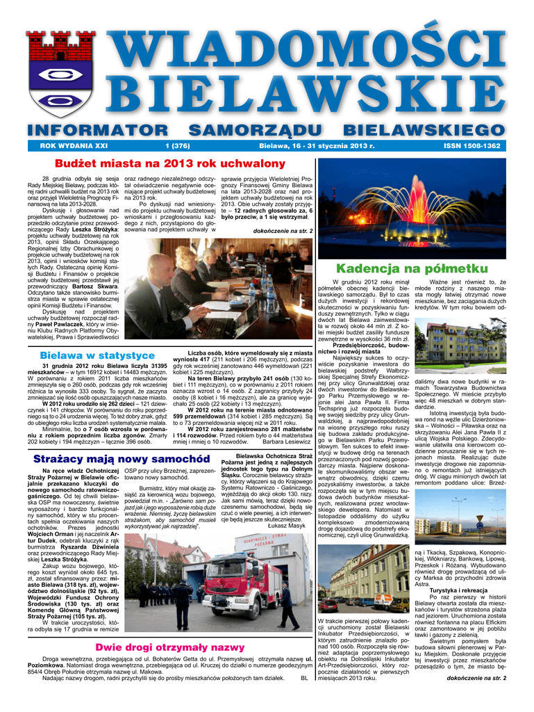 INFORMATOR ROK WYDANIA XXI SAMORZĄDU BIELAWSKIEGO Bielawa, 16 - 31 stycznia 2013 r. 1 (376) ISSN 1508-1362 Budżet miasta na 2013 rok uchwalony 28 grudnia odbyła się sesja Rady Miejskiej Bielawy, podczas której radni uchwalili budżet na 2013 rok oraz przyjęli Wieloletnią Prognozę Finansową na lata 2013-2028. Dyskusję i głosowanie nad projektem uchwały budżetowej poprzedziło odczytanie przez przewodniczącego Rady Leszka Stróżyka: projektu uchwały budżetowej na rok 2013, opinii Składu Orzekającego Regionalnej Izby Obrachunkowej o projekcie uchwały budżetowej na rok 2013, opinii i wniosków komisji stałych Rady. Ostateczną opinię Komisji Budżetu i Finansów o projekcie uchwały budżetowej przedstawił jej przewodniczący Bartosz Skwara. Odczytano także stanowisko burmistrza miasta w sprawie ostatecznej opinii Komisji Budżetu i Finansów. Dyskusję nad projektem uchwały budżetowej rozpoczął radny Paweł Pawlaczek, który w imieniu Klubu Radnych Platformy Obywatelskiej, Prawa i Sprawiedliwości oraz radnego niezależnego odczytał oświadczenie negatywnie oceniające projekt uchwały budżetowej na 2013 rok. Po dyskusji nad wniesionymi do projektu uchwały budżetowej wnioskami i przegłosowaniu każdego z nich, przystąpiono do głosowania nad projektem uchwały w dokończenie na str. 2 Kadencja na półmetku Bielawa w statystyce 31 grudnia 2012 roku Bielawa liczyła 31395 mieszkańców – w tym 16912 kobiet i 14483 mężczyzn. W porównaniu z rokiem 2011 liczba mieszkańców zmniejszyła się o 260 osób, podczas gdy rok wcześniej różnica ta wynosiła 333 osoby. To sygnał, że zaczyna zmniejszać się ilość osób opuszczających nasze miasto. W 2012 roku urodziło się 262 dzieci – 121 dziewczynek i 141 chłopców. W porównaniu do roku poprzedniego są to o 24 urodzenia więcej. To też dobry znak, gdyż do ubiegłego roku liczba urodzeń systematycznie malała. Minimalnie, bo o 7 osób wzrosła w porównaniu z rokiem poprzednim liczba zgonów. Zmarły 202 kobiety i 194 mężczyzn – łącznie 396 osób. Liczba osób, które wymeldowały się z miasta wyniosła 417 (211 kobiet i 206 mężczyzn), podczas gdy rok wcześniej zanotowano 446 wymeldowań (221 kobiet i 225 mężczyzn). Na teren Bielawy przybyło 241 osób (130 kobiet i 111 mężczyzn), co w porównaniu z 2011 rokiem oznacza wzrost o 14 osób. Z zagranicy przybyły 24 osoby (8 kobiet i 16 mężczyzn), ale za granicę wyjechało 25 osób (22 kobiety i 13 mężczyzn). W 2012 roku na terenie miasta odnotowano 599 przemeldowań (314 kobiet i 285 mężczyzn). Są to o 73 przemeldowania więcej niż w 2011 roku. W 2012 roku zarejestrowano 281 małżeństw i 114 rozwodów. Przed rokiem było o 44 małżeństwa mniej i mniej o 10 rozwodów. Barbara Lesiewicz Strażacy mają nowy samochód Na ręce władz Ochotniczej Straży Pożarnej w Bielawie oficjalnie przekazano kluczyki do nowego samochodu ratowniczogaśniczego. Od tej chwili bielawska OSP ma nowoczesny, świetnie wyposażony i bardzo funkcjonalny samochód, który w stu procentach spełnia oczekiwania naszych ochotników. Prezes jednostki Wojciech Orman i jej naczelnik Artur Dudek, odebrali kluczyki z rąk burmistrza Ryszarda Dźwiniela oraz przewodniczącego Rady Miejskiej Leszka Stróżyka. Zakup wozu bojowego, którego koszt wyniósł około 645 tys. zł, został sfinansowany przez: miasto Bielawa (318 tys. zł), województwo dolnośląskie (92 tys. zł), Wojewódzki Fundusz Ochrony Środowiska (130 tys. zł) oraz Komendę Główną Państwowej Straży Pożarnej (105 tys. zł). W trakcie uroczystości, która odbyła się 17 grudnia w remizie sprawie przyjęcia Wieloletniej Prognozy Finansowej Gminy Bielawa na lata 2013-2028 oraz nad projektem uchwały budżetowej na rok 2013. Obie uchwały zostały przyjęte – 12 radnych głosowało za, 6 było przeciw, a 1 się wstrzymał. OSP przy ulicy Brzeżnej, zaprezentowano nowy samochód. Burmistrz, który miał okazję zasiąść za kierownicą wozu bojowego, powiedział m.in. - „Zarówno sam pojazd jak i jego wyposażenie robią duże wrażenie. Niemniej, życzę bielawskim strażakom, aby samochód musieli wykorzystywać jak najrzadziej”. Bielawska Ochotnicza Straż Pożarna jest jedną z najlepszych jednostek tego typu na Dolnym Śląsku. Corocznie bielawscy strażacy, którzy włączeni są do Krajowego Systemu Ratowniczo - Gaśniczego, wyjeżdżają do akcji około 130. razy. Jak sami mówią, teraz dzięki nowoczesnemu samochodowi, będą się czuć o wiele pewniej, a ich interwencje będą jeszcze skuteczniejsze. Łukasz Masyk W grudniu 2012 roku minął półmetek obecnej kadencji bielawskiego samorządu. Był to czas dużych inwestycji i rekordowej skuteczności w pozyskiwaniu funduszy zewnętrznych. Tylko w ciągu dwóch lat Bielawa zainwestowała w rozwój około 44 mln zł. Z kolei miejski budżet zasiliły fundusze zewnętrzne w wysokości 36 mln zł. Przedsiębiorczość, budownictwo i rozwój miasta Największy sukces to oczywiście pozyskanie inwestora do bielawskiej podstrefy Wałbrzyskiej Specjalnej Strefy Ekonomicznej przy ulicy Grunwaldzkiej oraz dwóch inwestorów do Bielawskiego Parku Przemysłowego w rejonie alei Jana Pawła II. Firma Techspring już rozpoczęła budowę swojej siedziby przy ulicy Grunwaldzkiej, a najprawdopodobniej na wiosnę przyszłego roku ruszy się budowa zakładu produkcyjnego w Bielawskim Parku Przemysłowym. Ten sukces to efekt inwestycji w budowę dróg na terenach przeznaczonych pod rozwój gospodarczy miasta. Najpierw doskonale skomunikowaliśmy obszar wewnątrz obwodnicy, dzięki czemu pozyskaliśmy inwestorów, a także rozpoczęła się w tym miejscu budowa dwóch budynków mieszkalnych, realizowana przez wrocławskiego dewelopera. Natomiast w listopadzie oddaliśmy do użytku kompleksowo zmodernizowaną drogę dojazdową do podstrefy ekonomicznej, czyli ulicę Grunwaldzką. W trakcie pierwszej połowy kadencji uruchomiony został Bi