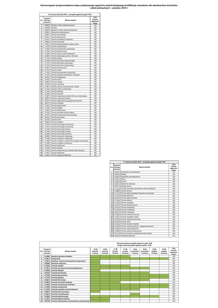 Harmonogram przeprowadzania etapu praktycznego egzaminu potwierdzającego kwalifikacje zawodowe dla absolwentów techników i szkół policealnych - czerwiec 2015 r. 16 czerwca (wtorek) 2015 r. początek egzaminu godz. 9.00 Symbol Lp. cyfrowy zawodu 1 2 3 4 5 6 7 8 9 10 11 12 13 14 15 16 17 18 19 20 21 22 23 24 25 26 27 28 29 30 31 32 33 34 35 36 37 38 39 40 41 42 43 44 45 46 47 48 49 50 51 52 53 54 55 56 346[02] 347[09] 346[04] 346[03] 343[01] 341[01] 321[07] 348[02] 315[01] 311[04] 311[05] 311[45] 311[06] 342[03] 311[12] 321[06] 311[14] 311[15] 321[01] 311[16] 311[18] 311[19] 522[02] 321[02] 342[04] 311[20] 515[01] 311[24] 311[26] 321[03] 313[07] 342[01] 341[07] 322[13] 311[27] 311[28] 315[02] 311[53] 321[12] Nazwa zawodu Asystent osoby niepełnosprawnej Florysta Opiekun w domu pomocy społecznej Opiekunka środowiskowa Technik administracji Technik agrobiznesu Technik architektury krajobrazu Technik archiwista Technik bezpieczeństwa i higieny pracy Technik budownictwa Technik budownictwa okrętowego Technik drogownictwa Technik dróg i mostów kolejowych Technik eksploatacji portów i terminali Technik geolog Technik górnictwa odkrywkowego Technik górnictwa otworowego Technik górnictwa podziemnego Technik hodowca koni Technik hutnik Technik instrumentów muzycznych Technik inżynierii środowiska i melioracji Technik księgarstwa Technik leśnik Technik logistyk Technik mechanik Technik ochrony fizycznej osób i mienia Technik ochrony środowiska Technik odlewnik Technik ogrodnik Technik organizacji produkcji filmowej i telewizyjnej Technik organizacji reklamy Technik organizacji usług gastronomicznych Technik ortopeda Technik papiernictwa Technik poligraf Technik pożarnictwa Technik przeróbki kopalin stałych Technik przetwórstwa mleczarskiego Technik pszczelarz Technik rolnik Technik spedytor Technik technologii ceramicznej Technik technologii chemicznej Technik technologii drewna Technik technologii odzieży Technik technologii żywności Technik transportu drogowego Technik transportu kolejowego Technik urządzeń i systemów energetyki odnawialnej Technik urządzeń sanitarnych Technik weterynarii Technik wiertnik 321[04] 321[05] 342[02] 311[30] 311[31] 311[32] 311[34] 321[09] 342[05] 311[38] 311[56] 311[39] 322[14] 311[40] 311[42] Technik włókienniczych wyrobów dekoracyjnych 311[41] Technik włókiennik 314[02] Technik żeglugi śródlądowej czas trwania egzaminu [min] 180 180 180 180 180 180 180 180 180 180 180 180 180 180 180 180 180 180 180 180 180 180 180 180 180 180 180 180 180 180 180 180 180 180 180 180 180 180 180 180 180 180 180 180 180 180 180 180 180 180 180 180 180 180 180 180 17 czerwca (środa) 2015 r. początek egzaminu godz. 9.00 Symbol Lp. cyfrowy zawodu 1 2 3 4 5 6 7 8 9 10 11 12 13 14 15 16 17 18 19 20 21 22 23 24 25 26 27 28 322[01] 322[20] 322[03] 512[01] 512[02] 322[21] 322[17] 311[46] 314[06] 311[47] 311[07] 322[19] 311[08] 311[54] 322[10] 341[03] 341[04] 322[12] 314[05] 314[01] 341[05] 322[16] 341[08] 311[94] 514[02] 514[03] 321[10] 322[15] czas trwania egzaminu [min] 240 240 240 240 240 240 240 240 240 240 240 240 240 240 240 240 240 240 240 240 240 240 240 240 240 240 240 240 Nazwa zawodu Asystentka stomatologiczna Dietetyk Higienistka stomatologiczna Kelner Kucharz Opiekunka dziecięca Protetyk słuchu Technik automatyk sterowania ruchem kolejowym Technik awionik Technik elektroenergetyk transportu szynowego Technik elektronik Technik elektroradiolog Technik elektryk Technik energetyk Technik farmaceutyczny Technik handlowiec Technik hotelarstwa Technik masażysta Technik mechanik lotniczy Technik nawigator morski Technik obsługi turystycznej Technik optyk Technik turystyki wiejskiej Technik usług bankowych i ubezpieczeniowych Technik usług fryzjerskich Technik usług kosmetycznych Technik żywienia i gospodarstwa domowego Terapeuta zajęciowy Pierwsza zmiana początek egzaminu godz. 9.00 Druga zmiana początek egzaminu godz. 15.00 Symbol Lp. cyfrowy zawodu 1 2 3 4 5 6 7 8 9 10 11 12 13 14 15 16 17 18 19 20 313[06] 313[01] 311[01] 322[06] 311[02] 311[51] 313[08] 341[02] 311[55] 311[10] 312[01] 314[03] 311[22] 311[50] 311[52] 419[01] 412[01] 312[02] 311[37] 347[10] Nazwa zawodu Asystent operatora dźwięku Fototechnik Korektor i stroiciel instrumentów muzycznych Ratownik medyczny Technik analityk Technik cyfrowych procesów graficznych Technik dźwięku Technik ekonomista Technik gazownictwa Technik geodeta Technik informatyk Technik mechanik okrętowy Technik mechanizacji rolnictwa Technik mechatronik Technik pojazdów samochodowych Technik prac biurowych Technik rachunkowości Technik teleinformatyk Technik telekomunikacji Technik sztukatorstwa i kamieniarstwa artystycznego 16.06 (wtorek) I zmiana 16.06 (wtorek) II zmiana 17.06 (środa) I zmiana 17.06 (środa) II zmiana 18.06 (czwartek) I zmiana 18.06 (czwartek) II zmiana 19.06 (piątek) I zmiana 19.06 (piątek) II zmiana czas trwania egzaminu [min] 240 240 240 240 240 240 240 240 240 240 240 240 240 240 240 240 240 240 240 240
