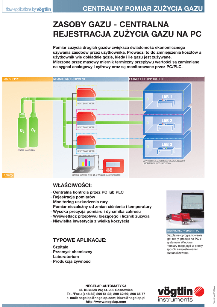 CENTRALNY POMIAR ZUŻYCIA GAZU flow-applications by ZASOBY GAZU - CENTRALNA REJESTRACJA ZUŻYCIA GAZU NA PC Pomiar zużycia drogich gazów zwiększa świadomość ekonomicznego używania zasobów przez użytkownika. Prowadzi to do zmniejszenia kosztów a użytkownik wie dokładnie gdzie, kiedy i ile gazu jest zużywane. Mierzone przez masowy miernik termiczny przepływu wartości są zamieniane na sygnał analogowy i cyfrowy oraz są monitorowane przez PC/PLC. GAS SUPPLY MEASURING EQUIPMENT EXAMPLE OF APPLICATION LAB 1 RED-Y SMART METER LAB 2 RED-Y SMART METER LAB 3 CENTRAL GAS SUPPLY RED-Y SMART METER DEPARTMENTS, E.G. HOSPITALS, CHEMICAL INDUSTRY, LABORATORIES, FOOD PRODUCTION CENTRAL CONTROL AT PC OR AT ANALYSIS ELECTRONICS/PLC WŁAŚCIWOŚCI: _ _ _ _ _ _ _ Centralna kontrola przez PC lub PLC Rejestracja pomiarów Monitoring uszkodzenia rury Pomiar niezależny od zmian ciśnienia i temperatury Wysoka precyzja pomiaru i dynamika zakresu Wyświetlacz przepływu bieżącego i licznik zużycia Niewielka inwestycja z wielką korzyścią MIERNIK RED-Y SMART I PC _ _ _ _ Szpitale Przemysł chemiczny Laboratorium Produkcja żywności NEGELAP-AUTOMATYKA ul. Kukułek 26; 41-200 Sosnowiec Tel./Fax.: (+48 32) 299 51 22; 299 62 69; 290 65 77 e-mail: [email protected]; [email protected] http://www.negelap.com Bezpłatne oprogramowanie ‘get red-y’ pracuje na PC z systemem Windows. Pomiary mogą być w prosty sposób zarejestrowane i przeanalizowane. Version 0507en TYPOWE APLIKACJE: