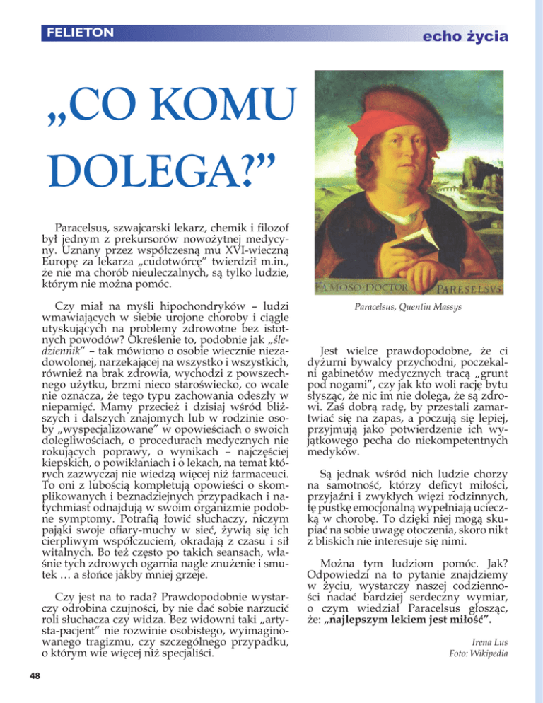 FELIETON echo życia „CO KOMU DOLEGA?” Paracelsus, szwajcarski lekarz, chemik i filozof był jednym z prekursorów nowożytnej medycyny. Uznany przez współczesną mu XVI-wieczną Europę za lekarza „cudotwórcę” twierdził m.in., że nie ma chorób nieuleczalnych, są tylko ludzie, którym nie można pomóc. Czy miał na myśli hipochondryków – ludzi wmawiających w siebie urojone choroby i ciągle utyskujących na problemy zdrowotne bez istotnych powodów? Określenie to, podobnie jak „śledziennik” – tak mówiono o osobie wiecznie niezadowolonej, narzekającej na wszystko i wszystkich, również na brak zdrowia, wychodzi z powszechnego użytku, brzmi nieco staroświecko, co wcale nie oznacza, że tego typu zachowania odeszły w niepamięć. Mamy przecież i dzisiaj wśród bliższych i dalszych znajomych lub w rodzinie osoby „wyspecjalizowane” w opowieściach o swoich dolegliwościach, o procedurach medycznych nie rokujących poprawy, o wynikach – najczęściej kiepskich, o powikłaniach i o lekach, na temat których zazwyczaj nie wiedzą więcej niż farmaceuci. To oni z lubością kompletują opowieści o skomplikowanych i beznadziejnych przypadkach i natychmiast odnajdują w swoim organizmie podobne symptomy. Potrafią łowić słuchaczy, niczym pająki swoje ofiary-muchy w sieć, żywią się ich cierpliwym współczuciem, okradają z czasu i sił witalnych. Bo też często po takich seansach, właśnie tych zdrowych ogarnia nagle znużenie i smutek … a słońce jakby mniej grzeje. Czy jest na to rada? Prawdopodobnie wystarczy odrobina czujności, by nie dać sobie narzucić roli słuchacza czy widza. Bez widowni taki „artysta-pacjent” nie rozwinie osobistego, wyimaginowanego tragizmu, czy szczególnego przypadku, o którym wie więcej niż specjaliści. 48 Paracelsus, Quentin Massys Jest wielce prawdopodobne, że ci dyżurni bywalcy przychodni, poczekalni gabinetów medycznych tracą „grunt pod nogami”, czy jak kto woli rację bytu słysząc, że nic im nie dolega, że są zdrowi. Zaś dobrą radę, by przestali zamartwiać się na zapas, a poczują się lepiej, przyjmują jako potwierdzenie ich wyjątkowego pecha do niekompetentnych medyków. Są jednak wśród nich ludzie chorzy na samotność, którzy deficyt miłości, przyjaźni i zwykłych więzi rodzinnych, tę pustkę emocjonalną wypełniają ucieczką w chorobę. To dzięki niej mogą skupiać na sobie uwagę otoczenia, skoro nikt z bliskich nie interesuje się nimi. Można tym ludziom pomóc. Jak? Odpowiedzi na to pytanie znajdziemy w życiu, wystarczy naszej codzienności nadać bardziej serdeczny wymiar, o czym wiedział Paracelsus głosząc, że: „najlepszym lekiem jest miłość”. Irena Lus Foto: Wikipedia