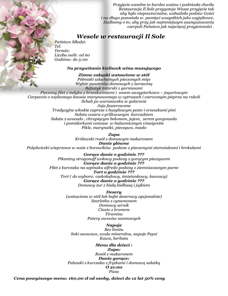 Przyjęcie weselne to bardzo ważna i podniosła chwila Restauracja Il Sole przygotuje Wasze przyjęcie tak aby było niepowtarzalne, wzbudziło podziw Gości i na długo pozostało w pamięci wszystkich jako wyjątkowe. Zadbamy o to, aby przy jak najmniejszym zaangażowaniu czerpali Państwo jak najwięcej przyjemności . Wesele w restauracji Il Sole Państwo Młodzi: Tel. Termin: Liczba osób: od 60 Godzina: do 5:00 Na przywitanie kieliszek wina musującego Zimne zakąski wstawione w stół Półmiski szlachetnych pieczonych mięs Wybór pasztetów domowych z żurawiną Befsztyk tatarski z garniszami Pieczony filet z indyka z brzoskwiniami i sosem szczypiorkowo – jogurtowym Carpaccio z wędzonego łososia marynowanego w cytrusach i czerwonym pieprzu na rukoli Schab po warszawsku w galarecie Jaja faszerowane Tradycyjne włoskie caprese z bazyliowym pesto i orzeszkami pini Sałata cezara z grillowanym kurczakiem Sałata z avocado , chrupiącym bekonem, jajem, serem gorgonzola i pomidorkami concase w balsamicznym vinaigrette Pikle, marynatki, pieczywo, masło Zupa Królewski rosół z domowym makaronem Danie główne Polędwiczki wieprzowe w sosie z borowików podane z pieczonymi ziemniakami i brokułami Gorące danie o godzinie ??? Pikantny strogonoff wołowy podany z gorącym pieczywem Gorące danie o godzinie ??? Filet z kurczaka na szpinaku alfredo podany z ziemniaczanym puree Tort o godzinie ??? Tort ( do wyboru: czekoladowy, śmietankowy, kawowy) Gorące danie o godzinie ??? Domowy żur z białą kiełbasą i jajkiem Desery (wstawione w stół lub bufet deserowy opcjonalnie) Szarlotka z cynamonem Domowy sernik Ciasto z kremem Tiramisu Patery owoców sezonowych Napoje Bez limitu Soki owocowe, woda mineralna, napoje Pepsi Kawa, herbata Menu dla dzieci : Zupa: Rosół z makaronem Danie gorące: Paluszki z kurczaka z frytkami i domową sałatką O 21:00 Pizza Cena powyższego menu: 160,00 zł od osoby, dzieci do 12 lat 50% ceny Wesele w restauracji Il Sole Państwo Młodzi: Tel. Termin: Liczba osób: 61-100 Godzina: do 5:00 Na przywitanie kieliszek wina musującego Dania serwowane: Zupa Krem z borowików z kwaśną śmietaną i groszkiem ptysiowym Danie gorące Polędwiczki wieprzowe w sosie gorgonzola z brokułami i ziemniaczanym puree Bufet zimny Półmiski pieczonych mięs i pasztetów Grillowany filet z kurczaka na rucoli z orzeszkami pini parmezanem i redukcja balsamiczną Befsztyk tatarski z garniszami Pieczony filet z indyka z brzoskwiniami i sosem szczypiorkowo – jogurtowym Carpaccio z wędzonego łososia marynowanego w cytrusach i czerwonym pieprzu na rukoli Ziołowe marynowane roladki z papryki i sera feta Sałatka z tuńczykiem , oliwkami i kaparami Wariacje caprese i avocado z farfallami pesto Sałata z avocado , chrupiącym bekonem, jajem, serem gorgonzola i pomidorkami concase w balsamicznym vinaigrette Mix sałat ze szpinakiem, truskawkami, fenkułem, prażonymi migdałami, parmezanem i balsamicznym vinaigrette Pikle, marynatki, pieczywo, masło Bufet gorący Pikantny strogonoff wołowy Kurczak po kalabryjsku ze szparagami, pomidorkami koktajlowymi oliwkami i bazylią Pieczony filet z pstrąga w maślano kaparowym sosie Lasagne bolognese ze szpinakiem Grillowane warzywa śródziemnomorskie Brokuły i kalafior pod serowym beszamelem Pieczone ziemniaki z tymiankiem Tort o godzinie ??? Tort ( do wyboru: czekoladowy, śmietankowy, kawowy) Bufet deserowo - kawowy Szarlotka z cynamonem Cytrynowy sernik z sera ricotta Ciasto z kremem Tiramisu Świeże owoce filetowane Kawa, herbata Napoje bez limitu wstawione w stół : Soki owocowe, napoje Pepsi, woda mineralna Cena powyższego menu: 150,00 zł od osoby, dzieci do 12 lat 50% ceny Wszystkie pozycje w menu mogą ulec zmianie zgodnie z Państwa sugestią Przyjęcie zasiadane, stoły nakryte białymi obrusami, krzesła ubrane w pokrowce ecru Przywitanie Pary Młodej chlebem i solą na życzenie Obiad serwowany przez kelnerów, możliwość organizacji wesela w formie bufetu szwedzkiego Gwarancją rezerwacji jest wpłata 30% zaliczki Ostateczną liczbę Gości należy podać 7 dni przed planowaną imprezą Restauracja zamknięta na wyłączność przy minimum 60 osobach Drobne dekoracje stołów kwiatami wliczone w cenę, dodatkowa dekoracja od 200,00 zł. Alkohol we własnym zakresie, pobieramy korkowe 15,00 zł od otwartej butelki 0,5L lub 0,7 L