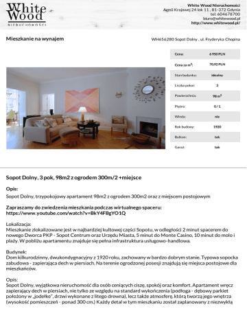 White Wood Nieruchomości Armii Krajowej 24 lok 11 , 81-372 Gdynia tel: 604678700 [email protected] http://www.whitewood.pl/ Mieszkanie na wynajem WH656280 Sopot Dolny , ul. Fryderyka Chopina Cena: 6 950 PLN Cena za m2: 70,92 PLN Stan budynku: idealny Liczba pokoi: 3 Powierzchnia: 98 m2 Piętro: 0/1 Winda: nie Rok budowy: 1920 Balkon: tak Garaż: tak Sopot Dolny, 3 pok, 98m2 z ogrodem 300m/2 +miejsce Opis: Sopot Dolny, trzypokojowy apartament 98m2 z ogrodem 300m2 oraz z miejscem postojowym Zapraszamy do zwiedzenia mieszkania podczas wirtualnego spaceru: https://www.youtube.com/watch?v=BkY4FBgYO1Q Lokalizacja: Mieszkanie zlokalizowane jest w najbardziej kultowej części Sopotu, w odległości 2 minut spacerem do nowego Dworca PKP - Sopot Centrum oraz Urzędu Miasta, 5 minut do Monte Casino, 10 minut do molo i plaży. W pobliżu apartamentu znajduje się pełna infrastruktura usługowo-handlowa. Budynek: Dom kilkurodzinny, dwukondygnacyjny z 1920 roku, zachowany w bardzo dobrym stanie. Typowa sopocka zabudowa - zapierająca dech w piersiach. Na terenie ogrodzonej posesji znajdują się miejsca postojowe dla mieszkańców. Opis: Sopot Dolny, wyjątkowa nieruchomość dla osób ceniących ciszę, spokój oraz komfort. Apartament wręcz zapierający dech w piersiach, nie tylko ze względu na standard wykończenia (podłoga - dębowy parkiet położony w „jodełke”, drzwi wykonane z litego drewna), lecz także atmosferę, którą tworzą jego wnętrza (wysokość pomieszczeń - ponad 300 cm.) Każdy detal w tym mieszkaniu został zaplanowany z niezwykłą White Wood Nieruchomości Armii Krajowej 24 lok 11 , 81-372 Gdynia tel: 604678700 [email protected] http://www.whitewood.pl/ starannością oraz co najważniejsze - z sercem. Lokal składa się z trzech osobnych pokoi. Salon wyposażony jest w kominek - przyjemnie ogrzewający chłodne wieczory, jest idealnym dopełnieniem panującego w apartamencie nastroju. Z tego samego pomieszczenia mamy wyjście na taras, do gabinetu - perfekcyjnie sprawdzającego się do codziennej pracy, oraz do sypialni z prywatną łazienką i bardzo obszerną garderobą. Kuchnia w tym przypadku jest w pewnym sensie sercem tego mieszkania - jest wyjątkowo obszerna oraz posiada bezpośrednie wyjście na taras oraz ogródek - liczący 300 metrów. Warto podkreślić, że lokal jest bardzo kameralny, widok z każdego okna zapewnia 100% prywatności. Dorota Król: 790-366-966; Paweł Podbielski +48-604-678-700 Dorota Król +48-790-366-966 White Wood Nieruchomości Dorota Król Armii Krajowej 24 lok 11 , 81-372 Gdynia +48-790-366-966 [email protected] http://www.whitewood.pl/