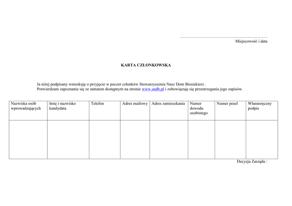 ……………………………………………………… Miejscowość i data KARTA CZŁONKOWSKA Ja niżej podpisany wnioskuję o przyjęcie w poczet członków Stowarzyszenia Nasz Dom Biesiekierz . Potwierdzam zapoznanie się ze statutem dostępnym na stronie www.sndb.pl i zobowiązuję się przestrzegania jego zapisów. Nazwiska osób wprowadzających Imię i nazwisko kandydata Telefon Adres mailowy Adres zamieszkania Numer dowodu osobistego Numer pesel Własnoręczny podpis Decyzja Zarządu :