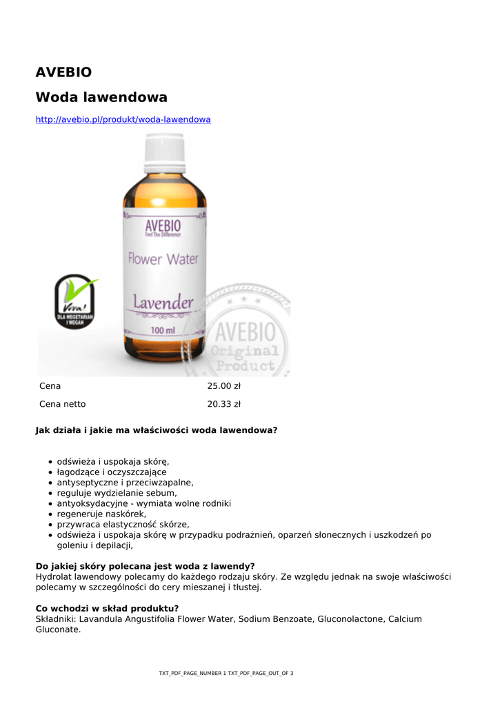 AVEBIO Woda lawendowa http://avebio.pl/produkt/woda-lawendowa Cena 25.00 zł Cena netto 20.33 zł Jak działa i jakie ma właściwości woda lawendowa? odświeża i uspokaja skórę, łagodzące i oczyszczające antyseptyczne i przeciwzapalne, reguluje wydzielanie sebum, antyoksydacyjne - wymiata wolne rodniki regeneruje naskórek, przywraca elastyczność skórze, odświeża i uspokaja skórę w przypadku podrażnień, oparzeń słonecznych i uszkodzeń po goleniu i depilacji, Do jakiej skóry polecana jest woda z lawendy? Hydrolat lawendowy polecamy do każdego rodzaju skóry. Ze względu jednak na swoje właściwości polecamy w szczególności do cery mieszanej i tłustej. Co wchodzi w skład produktu? Składniki: Lavandula Angustifolia Flower Water, Sodium Benzoate, Gluconolactone, Calcium Gluconate. TXT_PDF_PAGE_NUMBER 1 TXT_PDF_PAGE_OUT_OF 3 Czy alergicy mogą stosować ten hydrolat? Nie ma żadnych przeszkód. Jest to produkt całkowicie naturalny i bezpieczny również dla alergików. Chyba, że masz uczulenie na lawendę... Wtedy wybierz dla siebie inny hydrolat z naszej oferty. Jak mam stosować? Wodę możesz stosować na różne sposoby: Bezpośrednio na skórę - jako naturalny tonik (nie musisz korzystać z wacików). Mieszając na skórze z ulubionym olejkiem roślinnym uzyskasz kremową emulsję, która z powodzeniem zastąpi Twój dotychczasowy, tradycyjny krem. Możesz również użyć wody do przygotowania ulubionej maseczki. Wystarczy wymieszać z naturalną glinką lub błotem z Morza Martwego. Jaka jest data trwałości? Na każdym opakowaniu jest oznaczenie terminu trwałości. Zazwyczaj jest to min. kilka, kilkanaście miesięcy. Czy produkt jest jakoś zabezpieczony? Produkt jest zapakowany w bezpieczną szklaną butelkę. Nakrętka posiada uszczelkę oraz plombę zabezpieczającą. Jak przechowywać? Najważniejsze aby unikać pomieszczeń nasłonecznionych oraz o podwyższonej temperaturze. Nie musisz trzymać buteleczki z hydrolatem w lodówce. Jak duże jest opakowanie i na ile czasu mi wystarczy? Nasze hydrolaty są zawsze pakowane w butelkach o pojemności 100 ml. Takie opakowanie wystarcza średnio na 4 tygodnie stosowania (do twarzy). Czy był testowany na zwierzętach? Absolutnie, nie! Czy ten hydrolat posiada jakieś certyfikaty? Nasza woda lawendowa posiada certyfikat VIVA. Jaki ma zapach? Zapewne większość z nas zna zapach lawendy :-) Jest dosyć charakterystyczny, bardzo świeży. Jak mam stosować i dozować? Najlepiej bezpośrednio na skórę, bez używania wacików. Dozowanie ułatwia wbudowany w butelkę wygodny zakraplacz. Z czego i jak wytwarza się ten hydrolat? Produkt powstał w wyniku destylacji parą wodną płatków kwiatu lawendy. Czy wiedziałeś o tym, że? Nazwa “lawenda “pochodzi z łaciny "lavare", co oznacza" myć" i "lavanda" - " który służy do mycia", co dowodzi, że jej zastosowanie było już w danych czasach łączone z "myciem" ciała i duszy. Hydrolat lawendowy zawiera kwas rozmarynowy, który ma działanie przeciwzapalne. Dodawany do płukania włosów wygładza pasma. Stosowany jako tzw. mgiełka do włosów zapobiega ich płowieniu i utracie koloru. TXT_PDF_PAGE_NUMBER 2 TXT_PDF_PAGE_OUT_OF 3 Wcierany w skórę głowy wzmacnia cebulki włosów i zapobiega ich wypadaniu, działa ochronnie, wspomaga walkę z łupieżem i swędzącą skórą głowy. Dodawany do szamponu zmniejsza agresywne działanie detergentu. Polecany do okładów na podrażnione powieki. TXT_PDF_PAGE_NUMBER 3 TXT_PDF_PAGE_OUT_OF 3