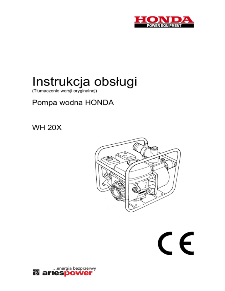 Instrukcja obsługi (Tłumaczenie wersji oryginalnej) Pompa wodna HONDA WH 20X SPIS TREŚCI WPROWADZENIE ........................................................................................................3 ZALECENIA BEZPIECZEŃSTWA.................................................................................4 UMIEJSCOWIENIE NAKLEJEK ..........................................................................................5 OPIS ELEMENTÓW POMPY ........................................................................................7 PRZYGOTOWANIE DO PRACY ...................................................................................7 PODŁĄCZENIE WĘŻA SSAWNEGO ....................................................................................7 PODŁĄCZENIE WĘŻA WYLOTOWEGO ...............................................................................8 KONTROLA PRZED URUCHOMIENIEM......................................................................8 SPRAWDZENIE POZIOMU OLEJU SILNIKOWEGO .................................................................8 SPRAWDZENIE POZIOMU PALIWA ....................................................................................9 SPRAWDZENIE WKŁADU FILTRA POWIETRZA.....................................................................9 ZALANIE POMPY WODĄ ................................................................................................10 URUCHOMIENIE SILNIKA..........................................................................................10 PRACA POMPY ..........................................................................................................10 ALARM NISKIEGO POZIOMU OLEJU (JEŻELI NALEŻY DO WYPOSAŻENIA)..............................10 PRACA NA DUŻYCH WYSOKOŚCIACH .............................................................................11 ZATRZYMANIE SILNIKA.............................................................................................11 OBSŁUGA I PRZEGLĄDY TECHNICZNE...................................................................11 TABELA PRZEGLĄDÓW .................................................................................................12 WYMIANA OLEJU .........................................................................................................12 OBSŁUGA FILTRA POWIETRZA ......................................................................................13 OBSŁUGA ŚWIECY ZAPŁONOWEJ ..................................................................................13 TRANSPORT I MAGAZYNOWANIE ...........................................................................14 USUWANIE USTEREK ...............................................................................................15 LISTA AUTORYZOWANYCH PUNKTÓW SERWISOWYCH......................................16 2 WPROWADZENIE Szanowny Kliencie!! Dziękując za okazane nam zaufanie, gratulujemy jednocześnie udanego zakupu i trafnego wyboru urządzenia z bogatej oferty naszych wyrobów. Zostałeś właścicielem pompy wodnej HONDA. Mamy nadzieję, że użytkowanie tej nowej motopompy spełni Twoje oczekiwania, przynosząc pełną satysfakcję. Instrukcja ta powstała abyś mógł bezproblemowo i bezawaryjnie użytkować agregat. Prosimy o jej dokładne przeczytanie przed pierwszym uruchomieniem maszyny, abyś był świadomy jakie środki ostrożności należy przedsięwziąć w trakcie jej użytkowania. Instrukcja zawiera także kompendium wiedzy przydatnej przy wykonywaniu okresowych przeglądów technicznych. Pragniemy zwrócić uwagę, że instrukcja stanowi integralną część Twojego urządzenia, powinna być zatem trzymana pod ręką, tak aby zawsze można było z niej skorzystać. Prosimy o przekazanie jej nowemu użytkownikowi w przypadku odsprzedaży urządzenia. Twoja nowa pompa wodna została zaprojektowana i wykonana zgodnie z wymaganiami bezpieczeństwa obowiązującymi w Unii Europejskiej, jednak niewłaściwie używana może powodować zagrożenia dla zdrowia i życia Użytkownika. Jeżeli używasz maszyny zgodnie z jej przeznaczeniem i informacjami zamieszczonymi w niniejszej Instrukcji Obsługi będzie on pracował wydajnie i bezawaryjnie. Proponujemy również zapoznać się z Warunkami Gwarancji, byś wiedział jakie przysługują Ci prawa i jakie są Twoje obowiązki jako Użytkownika. Karta Gwarancyjna jest osobnym dokumentem wydawanym przez Sprzedawcę w momencie sprzedaży. W przypadku niewłaściwego użytkowania wyrobu producent nie będzie ponosił odpowiedzialności z tytułu gwarancji za powstałe uszkodzenia. Wszystkie informacje zawarte w tej publikacji, oparte są na aktualnych danych o produkcie, dostępnych w chwili drukowania. ARIES Power Equipment Sp. z o.o. zastrzega sobie stałe prawo do wprowadzania zmian bez informowania o tym użytkownika i bez zaciągania jakichkolwiek zobowiązań. Żaden fragment tej publikacji nie może być powielany bez naszej pisemnej zgody. Bezpieczeństwo Twoje i innych jest dla nas sprawą priorytetową. W instrukcji i na urządzeniu umieściliśmy ważne informacje o zagrożeniach. Ostrzegają i informują one o potencjalnym niebezpieczeństwie, które może przynieść szkodę użytkownikowi i osobom trzecim. Każdy komunikat o zagrożeniu jest poprzedzony symbolem graficznym oraz jednym ze słów : Niezastosowanie się do zaleceń oznaczonych tym znakiem spowoduje poważne obrażenia ciała lub śmierć operatora lub osób postronnych. Niezastosowanie się do zaleceń oznaczonych tym znakiem może spowodować obrażenia ciała operatora lub innych osób oraz poważne uszkodzenie pompy. Tak oznaczono informacje przydatne w czasie użytkowania pompy. Jeśli masz problem lub pytania dotyczące POMPY WODNEJ z autoryzowanym dealerem, lub najbliższym autoryzowanym serwisem. 3 - skontaktuj się ZALECENIA BEZPIECZEŃSTWA • Pompy WH15/WH20 są zaprojektowane w taki sposób aby zapewnić bezpieczną pracę, jeśli są obsługiwane 