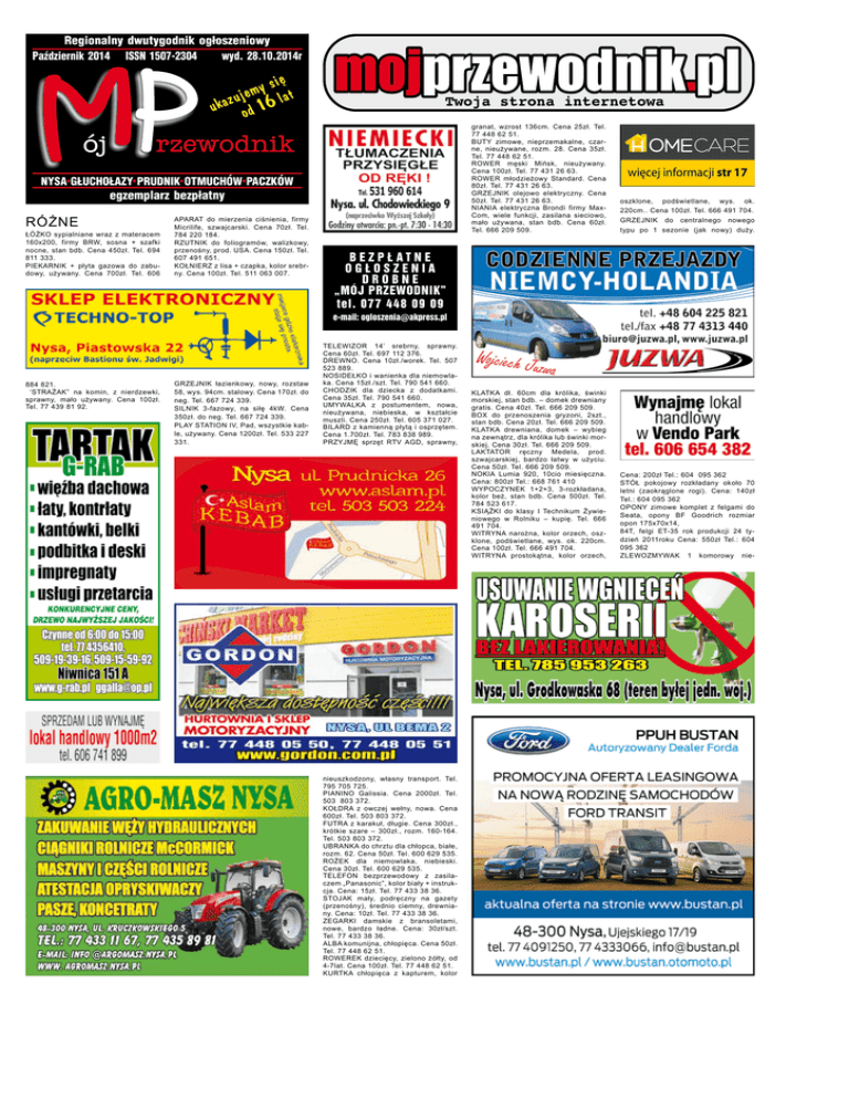 Regionalny dwutygodnik og³oszeniowy Październik 2014 ISSN 1507-2304 wyd. 28.10.2014r siê y m uje 6 lat z a k u od 1 NYSA G£UCHO£AZY PRUDNIK OTMUCHÓW PACZKÓW egzemplarz bezp³atny RÓŻNE ŁÓŻKO sypialniane wraz z materacem 160x200, firmy BRW, sosna + szafki nocne, stan bdb. Cena 450zł. Tel. 694 811 333. PIEKARNIK + płyta gazowa do zabudowy, używany. Cena 700zł. Tel. 606 APARAT do mierzenia ciśnienia, firmy Micrilife, szwajcarski. Cena 70zł. Tel. 784 220 184. RZUTNIK do foliogramów, walizkowy, przenośny, prod. USA. Cena 150zł. Tel. 607 491 651. KOŁNIERZ z lisa + czapka, kolor srebrny. Cena 100zł. Tel. 511 063 007. granat, wzrost 136cm. Cena 25zł. Tel. 77 448 62 51. BUTY zimowe, nieprzemakalne, czarne, nieużywane, rozm. 28. Cena 35zł. Tel. 77 448 62 51. ROWER męski Mińsk, nieużywany. Cena 100zł. Tel. 77 431 26 63. ROWER młodzieżowy Standard. Cena 80zł. Tel. 77 431 26 63. GRZEJNIK olejowo elektryczny. Cena 50zł. Tel. 77 431 26 63. NIANIA elektryczna Brondi firmy MaxCom, wiele funkcji, zasilana sieciowo, mało używana, stan bdb. Cena 60zł. Tel. 666 209 509. oszklone, podświetlane, wys. ok. 220cm.. Cena 100zł. Tel. 666 491 704. GRZEJNIK do centralnego nowego typu po 1 sezonie (jak nowy) duży. KLATKA dł. 60cm dla królika, świnki morskiej, stan bdb. – domek drewniany gratis. Cena 40zł. Tel. 666 209 509. BOX do przenoszenia gryzoni, 2szt., stan bdb. Cena 20zł. Tel. 666 209 509. KLATKA drewniana, domek – wybieg na zewnątrz, dla królika lub świnki morskiej. Cena 30zł. Tel. 666 209 509. LAKTATOR ręczny Medela, prod. szwajcarskiej, bardzo łatwy w użyciu. Cena 50zł. Tel. 666 209 509. NOKIA Lumia 920, 10cio miesięczna. Cena: 800zł Tel.: 668 761 410 WYPOCZYNEK 1+2+3, 3-rozkładana, kolor beż, stan bdb. Cena 500zł. Tel. 784 523 617. KSIĄŻKI do klasy I Technikum Żywieniowego w Rolniku – kupię. Tel. 666 491 704. WITRYNA narożna, kolor orzech, oszklone, podświetlane, wys. ok. 220cm. Cena 100zł. Tel. 666 491 704. WITRYNA prostokątna, kolor orzech, Cena: 200zł Tel.: 604 095 362 STÓŁ pokojowy rozkładany około 70 letni (zaokrąglone rogi). Cena: 140zł Tel.: 604 095 362 OPONY zimowe komplet z felgami do Seata, opony BF Goodrich rozmiar opon 175x70x14, 84T, felgi ET-35 rok produkcji 24 tydzień 2011roku Cena: 550zł Tel.: 604 095 362 ZLEWOZMYWAK 1 komorowy nie- więcej informacji str 17 BEZPŁATNE OGŁOSZENIA DROBNE „MÓJ PRZEWODNIK” tel. 077 448 09 09 e-mail: [email protected] 884 821. ‘STRAŻAK” na komin, z nierdzewki, sprawny, mało używany. Cena 100zł. Tel. 77 439 81 92. GRZEJNIK łazienkowy, nowy, rozstaw 58, wys. 94cm. stalowy. Cena 170zł. do neg. Tel. 667 724 339. SILNIK 3-fazowy, na siłę 4kW. Cena 350zł. do neg. Tel. 667 724 339. PLAY STATION IV, Pad, wszystkie kable, używany. Cena 1200zł. Tel. 533 227 331. TELEWIZOR 14’ srebrny, sprawny. Cena 60zł. Tel. 697 112 376. DREWNO. Cena 10zł./worek. Tel. 507 523 889. NOSIDEŁKO i wanienka dla niemowlaka. Cena 15zł./szt. Tel. 790 541 660. CHODZIK dla dziecka z dodatkami. Cena 35zł. Tel. 790 541 660. UMYWALKA z postumentem, nowa, nieużywana, niebieska, w kształcie muszli. Cena 250zł. Tel. 605 371 027. BILARD z kamienną płytą i osprzętem. Cena 1.700zł. Tel. 783 838 989. PRZYJMĘ sprzęt RTV AGD, sprawny, nieuszkodzony, własny transport. Tel. 795 705 725. PIANINO Galissia. Cena 2000zł. Tel. 503 803 372. KOŁDRA z owczej wełny, nowa. Cena 600zł. Tel. 503 803 372. FUTRA z karakuł, długie. Cena 300zł., krótkie szare – 300zł., rozm. 160-164. Tel. 503 803 372. UBRANKA do chrztu dla chłopca, białe, rozm. 62. Cena 50zł. Tel. 600 629 535. ROŻEK dla niemowlaka, niebieski. Cena 30zł. Tel. 600 629 535. TELEFON bezprzewodowy z zasilaczem „Panasonic”, kolor biały + instrukcja. Cena: 15zł. Tel. 77 433 38 36. STOJAK mały, podręczny na gazety (przenośny), średnio ciemny, drewniany. Cena: 10zł. Tel. 77 433 38 36. ZEGARKI damskie z bransoletami, nowe, bardzo ładne. Cena: 30zł/szt. Tel. 77 433 38 36. ALBA komunijna, chłopięca. Cena 50zł. Tel. 77 448 62 51. ROWEREK dziecięcy, zielono żółty, od 4-7lat. Cena 100zł. Tel. 77 448 62 51. KURTKA chłopięca z kapturem, kolor str. BEZPŁATNE OGŁOSZENIA DROBNE, tel. 77 448 09 09 pn. - pt. od 9.00 - 17.00, [email protected], www.mojprzewodnik.pl BEZPŁATNE OGŁOSZENIA DROBNE „MÓJ PRZEWODNIK” tel. 077 448 09 09 [email protected] rdzewny nowy Cena: 60zł Tel.: 604 095 362 SYNTEZATOR Ensoniq vfx-sd ważona klawiatura, seqwencer Cena: 1200złTel.: 606 352 881 WZMACNIACZ gitarowy combo profesjonalne brzmienie DEAN MARKLEY K 20 Cena: 150zł Tel.: 606 352 881 BĘBNY elektroniczne sześciokątne białe Cena: 600zł Tel.: 606 352 881 POWERMIKSER Behringer PMP3000 Cena: 1300zł Tel.: 606 352 881 BASY firmowy na głośnikach 15” Cena: 500zł sztuka Tel.: 606 352 881 WZMACNIACZ karaoke na trzy mikrofony z pogłosem Cena: 150zł Tel.: 606 352 881 OPONY 2 sztuki 14-stki zimowe do golfa IV Cena: 100zł Tel.: 602 262 990 PŁASZCZ wiosenno-jesienny kolor czarny ładny krój Cena: 50zł 602 262 990 KARNISZE plastikowe 4 sztuki kompletne kolor czarno-złote z zasłonami kolor czerwony Cena: 50zł Tel.: 602 262 990 ROWER treningowy Ketler Cena: 350zł. do neg. Tel.: 666 894 957 BUDA dla psa duża ocieplana Cena: 350zł. do neg. Tel.: 666 894 957 STÓŁ kamienny ogrodowy Cena: 1200zł. do neg. Tel.: 666 894 957 BĘBEN do perkusji 22 Cale stan dobry Cena: 140zł Tel.: 604 506 698 ZASILACZ do organ nowy stan bardzo dobry Cena: 70zł Tel: 77 433 06 13, 604 506 698 LAMPKĘ na statyw nowa na 230 V stan bardzo dobry Cena: 120zł Tel.: 604 506 698 MIKROFON bezprzewodowy z zasilaczem stan dobry Cena: 150zł Tel.: 604 506 698 APARAT tlenowy Companion 590 i 155/80R B Cena: 1000zł Tel.: 512 983 954 MATERAC wodny przeciw odleżynowy Cena: 500zł Tel.: 512 983 954 MASZYNA do szycia Cena: 50zł Tel.: 723 918 262 WĄŻ do baterii łazienkowej + słuchawka + uchwyt 2sz. długość wężą 140cm Cena: 40zł komplet. Tel.: 513 684 429 Z