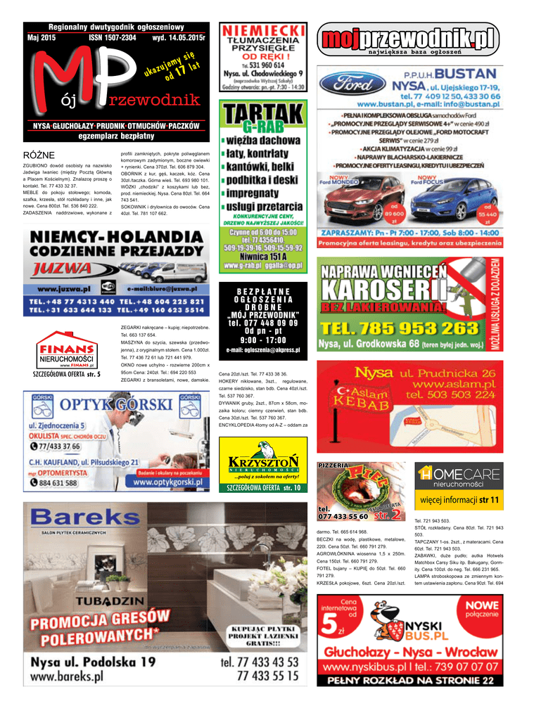 Regionalny dwutygodnik og³oszeniowy Maj 2015 ISSN 1507-2304 wyd. 14.05.2015r siê y m e uj lat ukaz od 17 NYSA G£UCHO£AZY PRUDNIK OTMUCHÓW PACZKÓW egzemplarz bezp³atny RÓŻNE ZGUBIONO dowód osobisty na nazwisko Jadwiga Iwaniec (między Pocztą Główną a Placem Kościelnym). Znalazcę proszę o kontakt. Tel. 77 433 32 37. MEBLE do pokoju stołowego; komoda, szafka, krzesła, stół rozkładany i inne, jak nowe. Cena 800zł. Tel. 536 840 222. ZADASZENIA naddrzwiowe, wykonane z profili zamkniętych, pokryte poliwęglanem komorowym zadymionym, boczne owiewki + rynienki. Cena 370zł. Tel. 606 879 304. OBORNIK z kur, gęś, kaczek, kóz. Cena 30zł./taczka. Górna wieś. Tel. 693 980 101. WÓZKI „chodziki” z koszykami lub bez, prod. niemieckiej. Nysa. Cena 80zł. Tel. 664 743 541. SOKOWNIK i drylownica do owoców. Cena 40zł. Tel. 781 107 662. MASZYNA do szycia, szewska (przedwo- BEZPŁATNE OGŁOSZENIA DROBNE „MÓJ PRZEWODNIK” tel. 077 448 09 09 Od pn - pt 9:00 - 17:00 jenna), z oryginalnym stołem. Cena 1.000zł. e-mail: [email protected] ZEGARKI nakręcane – kupię; niepotrzebne. Tel. 663 137 654. Tel. 77 436 72 61 lub 721 441 979. OKNO nowe uchylno - rozwierne 200cm x SZCZEGÓŁOWA OFERTA str. 5 95cm Cena: 240zł. Tel.: 694 220 553 ZEGARKI z bransoletami, nowe, damskie. Cena 20zł./szt. Tel. 77 433 38 36. HOKERY niklowane, 3szt., regulowane, czarne siedzisko, stan bdb. Cena 40zł./szt. Tel. 537 760 367. DYWANIK gruby, 2szt., 87cm x 58cm, mozaika koloru; ciemny czerwień, stan bdb. Cena 30zł./szt. Tel. 537 760 367. ENCYKLOPEDIA 4tomy od A-Z – oddam za nieruchomosci SZCZEGÓŁOWA OFERTA str. 10 2 darmo. Tel. 665 614 968. BECZKI na wodę, plastikowe, metalowe, 220l. Cena 50zł. Tel. 660 791 279. AGROWŁÓKNINA wiosenna 1,5 x 250m. Cena 150zł. Tel. 660 791 279. więcej informacji str 11 Tel. 721 943 503. STÓŁ rozkładany. Cena 80zł. Tel. 721 943 503. TAPCZANY 1-os. 2szt., z materacami. Cena 60zł. Tel. 721 943 503. ZABAWKI, duże pudło; autka Hotwels Matchbox Carsy Siku itp. Bakugany, Gorm- FOTEL bujany – KUPIĘ do 50zł. Tel. 660 ity. Cena 100zł. do neg. Tel. 666 231 965. 791 279. LAMPA stroboskopowa ze zmiennym kon- KRZESŁA pokojowe, 6szt. Cena 20zł./szt. tem ustawienia zapłonu. Cena 90zł. Tel. 694 BEZPŁATNE OGŁOSZENIA DROBNE „MÓJ PRZEWODNIK” tel. 077 448 09 09 [email protected] 644 232. MŁOT resorowy + wyposażenie Kuźni. Cena 1000zł. Tel. 692 060 548. ROWER składak. Cena 80zł. Tel. 77 435 86 69 lub 604 734 053. TELEWIZOR kolorowy, 21’. Cena 70zł. Tel. 77 435 86 69 lub 604 734 053. ZLEWOZMYWAK 1-komorowy, nierdzewny, mało używany. Cena 40zł. Tel. 77 433 73 61. OSOBA, która kupiła quad dziecięcy – proszę zgłosić się po ładowarkę. Tel. 77 433 79 08 lub 668 977 090. KANISTRY na paliwo, 20L, 10szt. Cena str. 20zł./szt. Tel. 604 964 401. PRALKA automatyczna Polar, sprawna. Cena 350zł. Tel. 604 964 401. MEBLE pokojowe, wysoki połysk, kolor ciemny brąz; szafo biblioteka-200zł., komoda – 100zł., ława -cena 80zł, biurko - cena 70zł. Tel. 604 964 401. NAROŻNIK pokojowy, bordowy, stan bdb. Cena 1000zł. Tel. 604 964 401. SUKNIA komunijna, na 152cm wzrostu, wszystkie dodatki, buty gratis. Cena 100zł. Tel. 537 760 367. ROLKI marki Spokey, rozsuwane, rozm. od 37-40, stan idealny, nieużywane. Cena 100zł. Tel. 537 760 367. UBRANKA dla dziewczynki od 2-11lat, wszystkie rodzaje. Cena od 2zł./szt. Tel. 537 760 367. KOMPLETY dla dzieci, w wieku 1-4m-cy, nowe, piękne kolory i wzory, bawełna 100%. Cena 7zł./kpl. Tel. 609 051 078. SUKNIA ślubna 1-częściowa, rozm. 3-M, dół z tiulu, góra gorsetowa z białego atłasu, sznurowana z tyłu. Cena 500zł. do neg. Tel. 664 211 215 po 20.00. ROWER damski Pegasus Milano GT, koła 28’, stan bdb. Cena 900zł. Tel. 602 426 032. ROWER Pegasus męski, koła 28’, aluminiowa rama, osprzęt Shimano. Cena 700zł. Tel. 602 426 032. ROWER damka, włoski, koła 24’. Cena 100zł. Tel. 602 426 032. MEBLE pokojowe, młodzieżowe, nowe, kolor jasny buk; 2 komody po; dł. 80cm, witryna 40cm, szafa narożna. Cena 800zł. Tel. 77 433 79 66. STOLIK pod TV z regałami – 100zł., stolik pod komputera z regałami. Cena 100zł. Tel. 77 433 79 66. STAROCIE - kupię. Tel. 788 723 646. PASZPORT z okresu Franciszka Józefa z 1910 wydany do Ameryki 2-języczny; polski i niemiecki, wiza amerykańska wydana w Nowym Jorku 1910r, bilet kolejowy z 1911r Hamburg – America linie Hamburg – Krakav Uber Myslowitz. Cena 5.000zł. tylko w całości. Tel. 77 433 42 81. CEGŁA z rozbiórki. Cena 35gr. Tel. 665 867 325. STÓŁ na 12osób, rozsuwany + 6krzeseł. Cena 1000zł. Tel. 785 715 885. SZAFA 2-drzwiowa z nadstawką, kolor ciemny mahoń, wys. 195cm, szer. 98cm, gł. 56cm. Cena 120zł. Tel. 791 251 724. CZĘŚCI do dźwigu 6t i 10t. Cena 5003000zł. Tel. 505 861 432. WÓZEK wielofunkcyjny Toto. Cena 300zł. Tel. 505 861 432. BARAKI 2szt. Cena 3500zł. i 2000zł. Tel. Cena 100zł. Głuchołazy. Tel. 77 439 18 98. 505 861 432. WERSALKA, ciemna zieleń + 2 poduszki. WAGA gospodarcza do 200kg. Cena 100zł. Cena 200zł. Głuchołazy. Tel. 77 439 18 98. Głuchołazy. Tel. 77 439 18 98. SZAFKA- gablota szklana np. na leki. Cena OPONY zimowe 2szt do Uno. Cena 80zł. 50zł. Głuchołazy. Tel. 77 439 18 98. Głuchołazy. Tel. 77 439 18 98. ROWER składak, używany. Cena 100zł. KLATKA dla psa, 1m3, pręty bez ocieplenia. Tel. 77 439 18 98. BEZPŁATNE OGŁOSZENIA DROBNE, tel. 77 448 09 09 pn. - pt. od 9.00 - 17.00, [email protected], www.mojprzewodnik.pl BEZPŁATNE OGŁOSZENIA DROBNE „MÓJ PRZEWODNIK” tel. 077 448 09 09 [email protected] MASZYNA do szycia Łucznik, używana. Cena 150zł. Tel. 77 439 18 98. GARNEK gliniany 20L. Cena 100zł. Tel. 77 439 18 98. LODÓWKA Amica, wys. ok. 120cm, stan dobry. Cena 300zł. Tel. 696 984 868. WÓŻEK dla niemowlaka, pomarańczowo szary, duże pompowane koła, przekładana rączka, produkcji niemieckiej, stan bdb. Cena 350zł. Tel. 696 984 868. NOSIDEŁKO- fotelik, do samochodu od 0