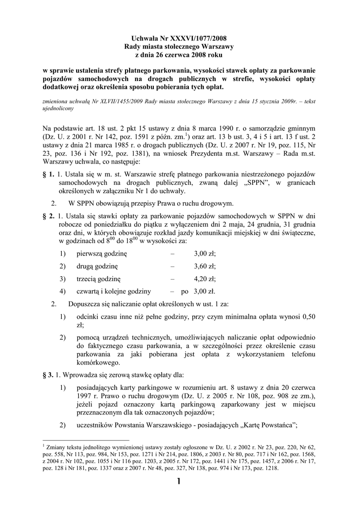 Uchwała Nr XXXVI/1077/2008 Rady miasta stołecznego Warszawy z dnia 26 czerwca 2008 roku w sprawie ustalenia strefy płatnego parkowania, wysokości stawek opłaty za parkowanie pojazdów samochodowych na drogach publicznych w strefie, wysokości opłaty dodatkowej oraz określenia sposobu pobierania tych opłat. zmieniona uchwałą Nr XLVII/1455/2009 Rady miasta stołecznego Warszawy z dnia 15 stycznia 2009r. – tekst ujednolicony Na podstawie art. 18 ust. 2 pkt 15 ustawy z dnia 8 marca 1990 r. o samorządzie gminnym (Dz. U. z 2001 r. Nr 142, poz. 1591 z późn. zm.1) oraz art. 13 b ust. 3, 4 i 5 i art. 13 f ust. 2 ustawy z dnia 21 marca 1985 r. o drogach publicznych (Dz. U. z 2007 r. Nr 19, poz. 115, Nr 23, poz. 136 i Nr 192, poz. 1381), na wniosek Prezydenta m.st. Warszawy – Rada m.st. Warszawy uchwala, co następuje: § 1. 1. Ustala się w m. st. Warszawie strefę płatnego parkowania niestrzeŜonego pojazdów samochodowych na drogach publicznych, zwaną dalej „SPPN”, w granicach określonych w załączniku Nr 1 do uchwały. 2. W SPPN obowiązują przepisy Prawa o ruchu drogowym. § 2. 1. Ustala się stawki opłaty za parkowanie pojazdów samochodowych w SPPN w dni robocze od poniedziałku do piątku z wyłączeniem dni 2 maja, 24 grudnia, 31 grudnia oraz dni, w których obowiązuje rozkład jazdy komunikacji miejskiej w dni świąteczne, w godzinach od 800 do 1800 w wysokości za: 1) pierwszą godzinę – 3,00 zł; 2) drugą godzinę – 3,60 zł; 3) trzecią godzinę – 4,20 zł; 4) czwartą i kolejne godziny – po 3,00 zł. 2. Dopuszcza się naliczanie opłat określonych w ust. 1 za: 1) odcinki czasu inne niŜ pełne godziny, przy czym minimalna opłata wynosi 0,50 zł; 2) pomocą urządzeń technicznych, umoŜliwiających naliczanie opłat odpowiednio do faktycznego czasu parkowania, a w szczególności przez określenie czasu parkowania za jaki pobierana jest opłata z wykorzystaniem telefonu komórkowego. § 3. 1. Wprowadza się zerową stawkę opłaty dla: 1) posiadających karty parkingowe w rozumieniu art. 8 ustawy z dnia 20 czerwca 1997 r. Prawo o ruchu drogowym (Dz. U. z 2005 r. Nr 108, poz. 908 ze zm.), jeŜeli pojazd oznaczony kartą parkingową zaparkowany jest w miejscu przeznaczonym dla tak oznaczonych pojazdów; 2) uczestników Powstania Warszawskiego - posiadających „Kartę Powstańca”; 1 Zmiany tekstu jednolitego wymienionej ustawy zostały ogłoszone w Dz. U. z 2002 r. Nr 23, poz. 220, Nr 62, poz. 558, Nr 113, poz. 984, Nr 153, poz. 1271 i Nr 214, poz. 1806, z 2003 r. Nr 80, poz. 717 i Nr 162, poz. 1568, z 2004 r. Nr 102, poz. 1055 i Nr 116 poz. 1203, z 2005 r. Nr 172, poz. 1441 i Nr 175, poz. 1457, z 2006 r. Nr 17, poz. 128 i Nr 181, poz. 1337 oraz z 2007 r. Nr 48, poz. 327, Nr 138, poz. 974 i Nr 173, poz. 1218. 1 3) uczestników (po stronie koalicji antyhitlerowskiej) innych walk o Warszawę w latach 1939-1945 - posiadających „Kartę Honorową”; 4) Honorowi Obywatele m.st. Warszawy – posiadający Legitymację Honorowego Obywatela m.st. Warszawy; 5) kierujących legitymujących się orzeczeniem o zaliczeniu do znacznego stopnia niepełnosprawności będących właścicielami, współwłaścicielami lub uŜytkownikami – na podstawie odpłatnej czynności cywilno-prawnej lub umowy uŜyczenia zawartej w formie aktu notarialnego, której są stroną – samochodu osobowego lub innego pojazdu samochodowego o dopuszczalnej masie całkowitej do 2,5 tony, oznaczonego kartą N+; 6) kierujących, których niepełnosprawność potwierdzona w orzeczeniu o niepełnosprawności lub o stopniu niepełnosprawności powoduje istotne trudności w samodzielnym poruszaniu się, będących właścicielami, współwłaścicielami lub uŜytkownikami – na podstawie odpłatnej czynności cywilno- prawnej lub umowy uŜyczenia zawartej w formie aktu notarialnego, której są stroną – samochodu osobowego lub innego pojazdu samochodowego o dopuszczalnej masie całkowitej do 2,5 tony, oznaczonego kartą N+; 7) kierujących rodziców i opiekunów prawnych osób niepełnosprawnych, których niepełnosprawność potwierdzona jest w orzeczeniu o niepełnosprawności lub o stopniu niepełnosprawności niezdolnych do samodzielnej egzystencji w rozumieniu art. 4 ust. 4 ustawy z dnia 27 sierpnia 1997r. o rehabilitacji zawodowej i społecznej oraz zatrudnianiu osób niepełnosprawnych (Dz. U. 2008r. Nr 14, poz. 92), podczas przewozu tych osób niepełnosprawnych samochodem osobowym oznaczonym kartą N+, lub innym pojazdem samochodowym oznaczonym kartą N+, o dopuszczalnej masie całkowitej do 2,5 tony, którego w/w rodzice lub opiekunowie prawni są właścicielami, współwłaścicielami lub uŜytkownikami – na podstawie odpłatnej czynności cywilno-prawnej lub umowy uŜyczenia zawartej w formie aktu notarialnego, której są stroną; 8) słuŜb obsługi miasta podczas wykonywania obowiązków słuŜbowych pojazdami samochodowymi zewnętrznie trwale oznakowanymi: a) SłuŜby DyŜurnej Miasta, b) InŜyniera Ruchu m. st. Warszawy, c) StraŜy Miejskiej m. st. Warszawy, d) Zarządu Transportu Miejskiego – nadzoru ruchu, e) Tramwajów Warszawskich sp. z o. o. – nadzoru ruchu, f) Miejskich Zakładów Autobusowych sp. z o. o. – nadzoru ruchu, g) Miejskiego Przedsiębiorstwa Wodociągów i Kanalizacji S.A. – pogotowia wodociągowego, h) Stołecznego Przedsiębiorstwa Energetyki Cieplnej S.A. – pogotowia ciepłowniczego, i) STOEN SA – pogotowia energetycznego, j) Mazowieckiego Operatora Dystrybucyjnego – Spółka z o.o. Oddział – Zakład Gazowniczy Warszawa – pogotowia gazowego, 2 k) pogotowia oświetleniowego oraz pogotowia działającego na zlecenie zarządu drogi, sygnalizacji l) pogotowia schronisk dla zwierząt, ł) Zarządu Oczyszczania Miasta – nadzoru i pogotowia, m) Metra Warszawskiego Sp. z o.o. – pogotowia technicznego i ratownictwa technicznego, n) Biura Bezpieczeństwa i Zarządzania Kryzysowego Urzędu m.st. Warszawy; o) Zakładu Remontów 