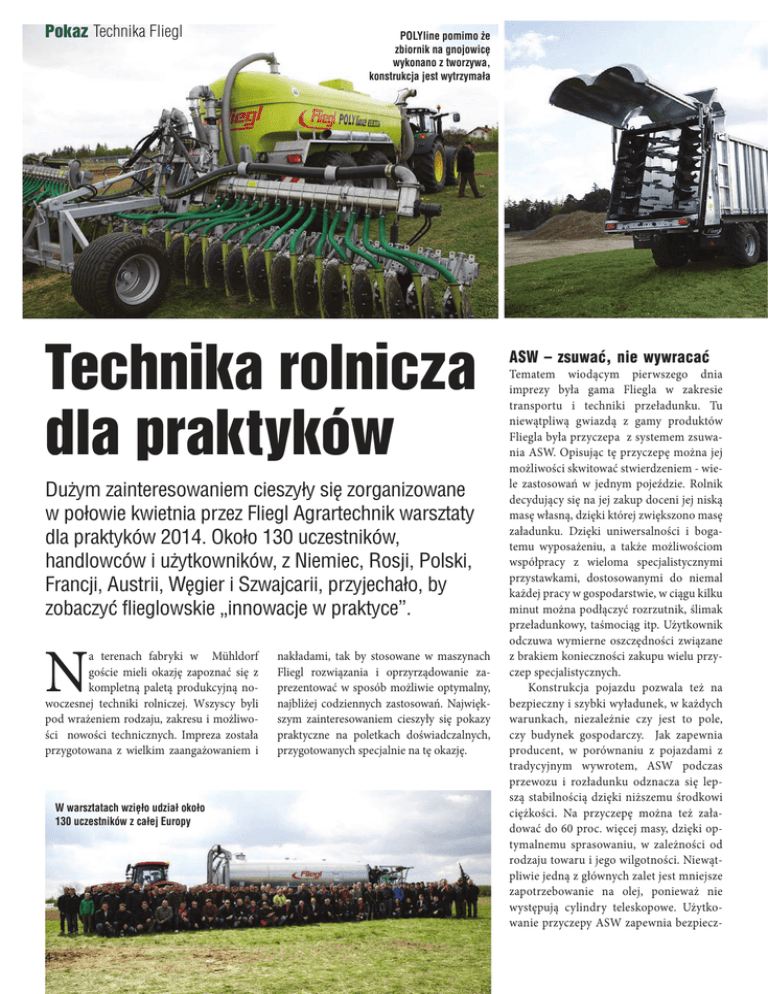 Pokaz Technika Fliegl POLYline pomimo że zbiornik na gnojowicę wykonano z tworzywa, konstrukcja jest wytrzymała Technika rolnicza dla praktyków Dużym zainteresowaniem cieszyły się zorganizowane w połowie kwietnia przez Fliegl Agrartechnik warsztaty dla praktyków 2014. Około 130 uczestników, handlowców i użytkowników, z Niemiec, Rosji, Polski, Francji, Austrii, Węgier i Szwajcarii, przyjechało, by zobaczyć flieglowskie „innowacje w praktyce”. N a terenach fabryki w Mühldorf goście mieli okazję zapoznać się z kompletną paletą produkcyjną nowoczesnej techniki rolniczej. Wszyscy byli pod wrażeniem rodzaju, zakresu i możliwości nowości technicznych. Impreza została przygotowana z wielkim zaangażowaniem i W warsztatach wzięło udział około 130 uczestników z całej Europy nakładami, tak by stosowane w maszynach Fliegl rozwiązania i oprzyrządowanie zaprezentować w sposób możliwie optymalny, najbliżej codziennych zastosowań. Największym zainteresowaniem cieszyły się pokazy praktyczne na poletkach doświadczalnych, przygotowanych specjalnie na tę okazję. ASW – zsuwać, nie wywracać Tematem wiodącym pierwszego dnia imprezy była gama Fliegla w zakresie transportu i techniki przeładunku. Tu niewątpliwą gwiazdą z gamy produktów Fliegla była przyczepa z systemem zsuwania ASW. Opisując tę przyczepę można jej możliwości skwitować stwierdzeniem - wiele zastosowań w jednym pojeździe. Rolnik decydujący się na jej zakup doceni jej niską masę własną, dzięki której zwiększono masę załadunku. Dzięki uniwersalności i bogatemu wyposażeniu, a także możliwościom współpracy z wieloma specjalistycznymi przystawkami, dostosowanymi do niemal każdej pracy w gospodarstwie, w ciągu kilku minut można podłączyć rozrzutnik, ślimak przeładunkowy, taśmociąg itp. Użytkownik odczuwa wymierne oszczędności związane z brakiem konieczności zakupu wielu przyczep specjalistycznych. Konstrukcja pojazdu pozwala też na bezpieczny i szybki wyładunek, w każdych warunkach, niezależnie czy jest to pole, czy budynek gospodarczy. Jak zapewnia producent, w porównaniu z pojazdami z tradycyjnym wywrotem, ASW podczas przewozu i rozładunku odznacza się lepszą stabilnością dzięki niższemu środkowi ciężkości. Na przyczepę można też załadować do 60 proc. więcej masy, dzięki optymalnemu sprasowaniu, w zależności od rodzaju towaru i jego wilgotności. Niewątpliwie jedną z głównych zalet jest mniejsze zapotrzebowanie na olej, ponieważ nie występują cylindry teleskopowe. Użytkowanie przyczepy ASW zapewnia bezpiecz- Przyczepa ASW ma możliwość współpracy z wieloma specjalistycznymi przystawkami, co czyni ją bardzo uniwersalną ny wyładunek nawet na zboczach, także w przypadku dużych przyczep o pojemności do 70 m³. POLYline – przyczepa nie tylko do gnojowicy Drugi dzień imprezy poświęcony był technice gnojowicy i wozom asenizacyjnym. Zapoznać się można było z nowościami Fliegla. Prezentowana była m. in. rodzina przyczep asenizacyjnych POLYline. Zbiornik na gnojowicę wykonano z tworzywa. Z tego powodu przyczepa jest lekka. Natomiast konstrukcja jest wytrzymała. Przyczepę można wyposażyć, tak samo jak stalowe wozy asenizacyjne, m. in. w przystawki służące do lepszego rozprowadzania gnojowicy na polu. Dla lepszego rozłożenia ciężaru napełnionej przyczepy można zamówić hydrauliczny przesuw osi. Jest to wyposażenie opcjonalne. Przyczepa jest absolutnie nierdzewna i zapewnia transport nawet najbardziej żrących substancji, jak RSM, czy inne nawozy płynne. Dzięki nisko położonemu środkowi ciężkości przyczepa jest bardzo stabilna. POLYline dostępna jest w wyposażeniu z pompą i wężami do rozlewu gnojowicy. Podczas tegorocznych warsztatów praktycznych duży nacisk położono na dziedziny cyfryzacji i „smart farming”. Zaprezentowano również flieglowskie rozwiązania w zakresie technologii Isobus oraz duży wybór nowoczesnych systemów wagowych. Ważną częścią warsztatów praktycznych była także wzajemna wymiana doświadczeń, zarówno na linii producent-praktycy, jak również praktyków pomiędzy sobą. Zbigniew Witamborski