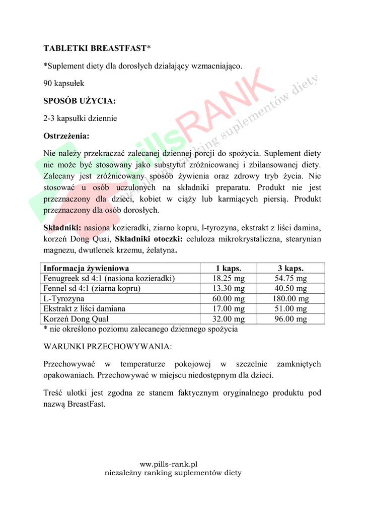 TABLETKI BREASTFAST* *Suplement diety dla dorosłych działający wzmacniająco. 90 kapsułek SPOSÓB UŻYCIA: 2-3 kapsułki dziennie Ostrzeżenia: Nie należy przekraczać zalecanej dziennej porcji do spożycia. Suplement diety nie może być stosowany jako substytut zróżnicowanej i zbilansowanej diety. Zalecany jest zróżnicowany sposób żywienia oraz zdrowy tryb życia. Nie stosować u osób uczulonych na składniki preparatu. Produkt nie jest przeznaczony dla dzieci, kobiet w ciąży lub karmiących piersią. Produkt przeznaczony dla osób dorosłych. Składniki: nasiona kozieradki, ziarno kopru, l-tyrozyna, ekstrakt z liści damina, korzeń Dong Quai, Składniki otoczki: celuloza mikrokrystaliczna, stearynian magnezu, dwutlenek krzemu, żelatyna. Informacja żywieniowa 1 kaps. Fenugreek sd 4:1 (nasiona kozieradki) 18.25 mg Fennel sd 4:1 (ziarna kopru) 13.30 mg L-Tyrozyna 60.00 mg Ekstrakt z liści damiana 17.00 mg Korzeń Dong Qual 32.00 mg * nie określono poziomu zalecanego dziennego spożycia 3 kaps. 54.75 mg 40.50 mg 180.00 mg 51.00 mg 96.00 mg WARUNKI PRZECHOWYWANIA: Przechowywać w temperaturze pokojowej w szczelnie zamkniętych opakowaniach. Przechowywać w miejscu niedostępnym dla dzieci. Treść ulotki jest zgodna ze stanem faktycznym oryginalnego produktu pod nazwą BreastFast. ww.pills-rank.pl niezależny ranking suplementów diety