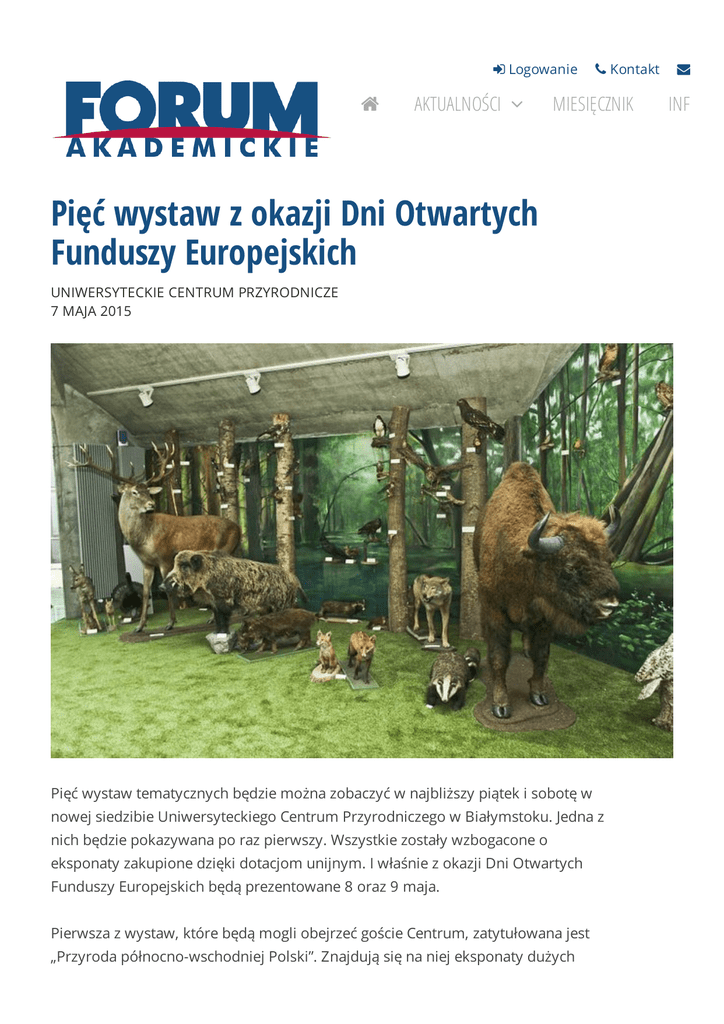 Logowanie AKTUALNOŚCI Kontakt MIESIĘCZNIK Pięć wystaw z okazji Dni Otwartych Funduszy Europejskich UNIWERSYTECKIE CENTRUM PRZYRODNICZE 7 MAJA 2015 Pięć wystaw tematycznych będzie można zobaczyć w najbliższy piątek i sobotę w nowej siedzibie Uniwersyteckiego Centrum Przyrodniczego w Białymstoku. Jedna z nich będzie pokazywana po raz pierwszy. Wszystkie zostały wzbogacone o eksponaty zakupione dzięki dotacjom unijnym. I właśnie z okazji Dni Otwartych Funduszy Europejskich będą prezentowane 8 oraz 9 maja. Pierwsza z wystaw, które będą mogli obejrzeć goście Centrum, zatytułowana jest „Przyroda północno-wschodniej Polski”. Znajdują się na niej eksponaty dużych INFORMA ssaków: żubra, łosia, jelenia, dzika i wilka, ale też ryjówki – najmniejszego ssaka Polski. Kolejna – „Minerały i skały” prezentuje różnorodne skały magmowe, metamorficzne i osadowe oraz bogactwo form występowania kwarcu, pirytu czy minerałów rodzimych, takich jak miedź, srebro, złoto, siarka czy węgiel w postaci grafitu i diamentów. Trzecia ekspozycja składa się ze skamieniałości roślinnych i zwierzęcych, wśród których można będzie zobaczyć kopalne szczątki przedstawicieli bezkręgowców i kręgowców z różnych okresów geologicznych, ale też odciski pierwszych roślin lądowych jakie pojawiły się na naszej planecie pod koniec okresu sylurskiego. Kolejna wystawa – „Rośliny chronione i charakterystyczne Podlasia” to plansze graficzne na szkle przedstawiające 60 gatunków roślin typowych dla flory naszego regionu. Ostatnim elementem jest „Lapidarium magmowych głazów narzutowych” z eksponatami zebranymi w okolicy Sokółki i Studzianek koło Białegostoku. Można je podziwiać przed wejściem do Uniwersyteckiego Centrum Przyrodniczego. Unijna dotacja na wystawy pochodzi z Regionalnego Programu Operacyjnego Województwa Podlaskiego na lata 2007-2013 (Oś priorytetowa V. Rozwój infrastruktury ochrony środowiska, Działanie 5.1. Rozwój regionalnej infrastruktury ochrony środowiska pn. „Kształtowanie postaw ekologicznych z wykorzystaniem bazy edukacyjnej Uniwersyteckiego Muzeum Przyrodniczego Uniwersytetu w Białymstoku”). Uniwersyteckie Centrum Przyrodnicze otrzymało na swój projekt ponad 276 tys. zł. Uniwersyteckie Centrum Przyrodnicze na dobre otworzy swoje podwoje na początku czerwca i wtedy będzie można odwiedzać je od poniedziałku do piątku w godzinach 9.00-15.00, a w soboty od 10.00 do 16.00. Trwa jeszcze przeprowadzka dwóch wystaw ze starej siedziby na ul. Świerkowej, montaż ostatnich gablot i niezbędnych do ich podświetlenia instalacji. W trakcie przygotowywania są jeszcze 3 kolejne wystawy: „Przyroda rejonów polarnych”, „Rafy koralowe – morskie ogrody” oraz „Bursztyn i inne żywice kopalne” realizowane ze środków własnych Uniwersytetu w Białymstoku. Siedziba Uniwersyteckiego Centrum Przyrodniczego mieści się w nowym kampusie Uniwersytetu w Białymstoku przy ul. Ciołkowskiego 1J. Podczas Dni Otwartych Funduszy Europejskich Centrum będzie otwarte w godzinach 10.00 - 17.00. Wstęp wolny. Kontakt Webmaster Prenumerata Reklamy Regulamin e-prenumeraty Redakcja Wydawca © Akademicka Oficyna Wydawnicza Facebook
